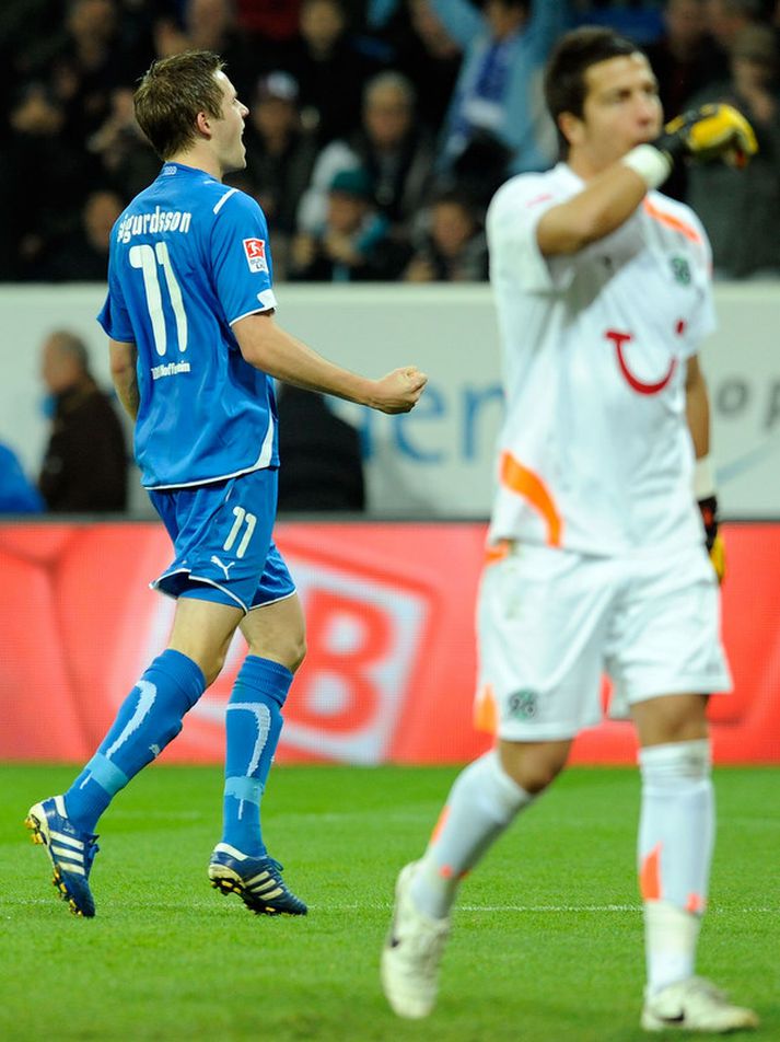 Gylfi með tvö mörk og stoðsendingu í fyrsta byrjunarliðsleiknum Óskar Ófeigur Jónsson skrifar 31. október 2010 18:20 Gylfi Þór Sigurðsson fagnar öðru marka sinna. Mynd/Nordic Photos/Bongarts Gylfi Þór Sigurðsson skoraði tvö mörk og lagði upp það þriðja í dag í fyrsta leik sínum í byrjunarliði Hoffenheim í þýsku úrvalsdeildinni í fótbolta. Hoffenheim vann þá 4-0 sigur á Hannover. Gylfi hafði komið inn á sem varamaður í fyrstu fimm deildarleikjum sínum með Hoffenheim og hafði tvívegis skorað í þeim leikjum. Í kvöld fékk hann hinsvegar tækifærið í byrjunarliðinu og nýtti það frábærlega. Gylfi skoraði fyrsta mark leiksins á lokamínútu fyrri hálfleiks með þrumuskoti með vinstri fæti af um sextán metra færi. Gylfi bætti við öðru marki úr vítaspyrnu á 48. mínútu og lagði síðan upp skallamark fyrir Demba Ba aðeins þremur mínútum síðar. Gylfi tók þá aukaspyrnu frá hægri og sendi hann beint á kollinn á Ba. Gylfi var þarna búinn að koma að þremur mörkum á aðeins sex mínútna kafla og það munaði litlu að hann legði upp annað skallamark á 56. mínútu. Peniel Mlapa innsiglaði síðan sigur Hoffenheim með því að skora fjórða markið á 71. mínútu. Þýski boltinn Mest lesið Sakaður um svindl á HM í pílukasti Sport Óttast að Isak hafi fótbrotnað Enski boltinn Hleður Kjartan lofi eftir frábæra frumraun með Aberdeen Fótbolti Hjalti Þór ráðinn aðalþjálfari Álftaness Körfubolti Ótrúleg tíðindi á HM í pílukasti: „Mikið sjokk“ Sport HM í pílu: Littler flaug áfram og kvöldinu lauk með spennutrylli Sport Dómarinn hlýtur mikið lof fyrir stundarbræði í garð Jake Paul og Joshua Sport Túfa gerir þriggja ára samning í Svíþjóð Fótbolti Arnór Ingvi orðinn leikmaður KR Íslenski boltinn Albert skoraði í fyrsta sigri Fiorentina Fótbolti Fleiri fréttir Hleður Kjartan lofi eftir frábæra frumraun með Aberdeen Óttast að Isak hafi fótbrotnað Túfa gerir þriggja ára samning í Svíþjóð Arnór Ingvi orðinn leikmaður KR Albert skoraði í fyrsta sigri Fiorentina Bæjarar aftur á sigurbraut Tvenna frá Rogers tryggði Villa sigur gegn Manchester United Barcelona með fjögurra stiga forskot inn í nýtt ár Alvöru innkoma: Kjartan með stoðsendingu gegn Celtic í sínum fyrsta leik Sandra María hetjan og með þeim markahæstu í Þýskalandi Katla skoraði annan leikinn í röð Tómas Bent og félagar unnu Rangers og náðu átta stiga forskoti á toppnum Breiðablik kaupir Jónatan frá Norrköping Hildur áfram í bikarnum og Amanda enn á toppnum Fimmta sinn sem Arsenal er á toppnum um jólin: Unnu ekki titilinn í fyrstu fjögur skiptin „Viljum við að okkar verði minnst fyrir að vera skræfur?“ „Ef dómarinn hefði sinnt sínu starfi almennilega hefði Romero ekki fengið spjald“ Haaland gaf barnabarni Hareide gjöf Sjáðu mörkin úr enska: Sviptingar, sænskt þema og svakalegar tæklingar Madrídingar anda ofan í hálsmálið á Börsungum Calvert-Lewin hættir ekki að skora Gyökeres skaut Arsenal aftur á toppinn Ronaldo á nærbuxunum lætur Elon Musk efast um sjálfan sig Orri Steinn kominn með nýjan þjálfara Slot fámáll um stöðuna á Isak Gleði og sorg í sigri Liverpool Real Madrid - Sevilla | Tekst að róa ástandið fyrir jól? Willum spilaði sinn fyrsta leik í tæpa fjóra mánuði Dramatík er Broja reyndist hetja Burnley Haaland frábær er Manchester City komst á toppinn Sjá meira
