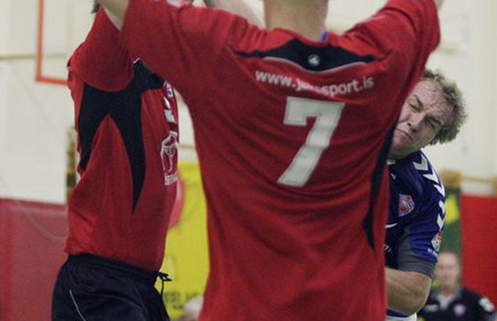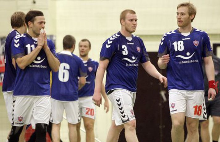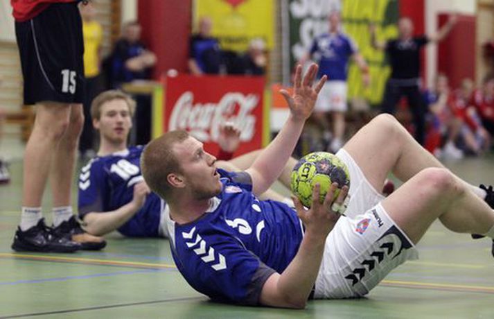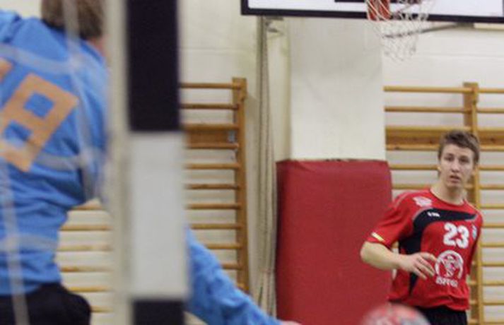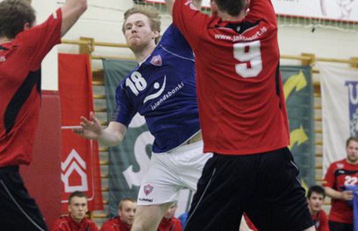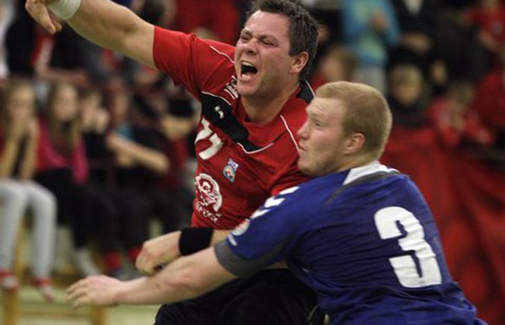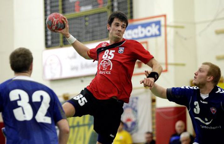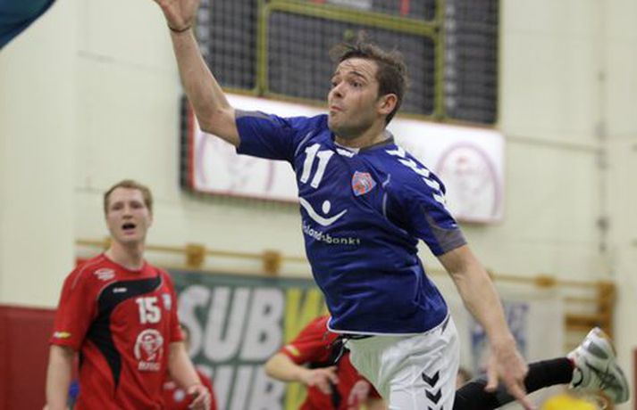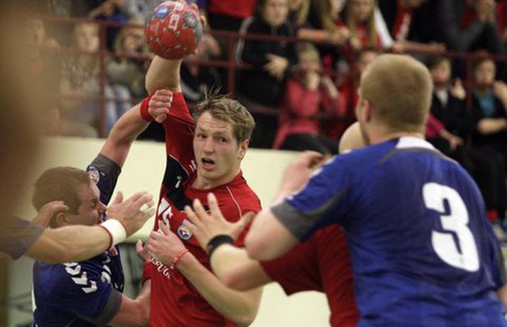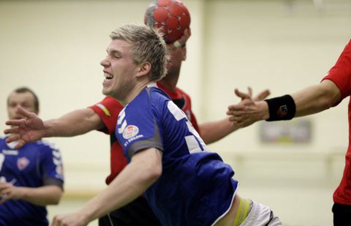 "Konni er kóngurinn," sungu leikmenn Vals inn í búningsklefa í kvöld eftir 22-23 sigur á Aftureldingu. Fyrsti sigur Valsmanna í vetur staðreynd og augljóslega þungu fargi létt af mönnum þar sem þeir fögnuðu líkt og þeir væru orðnir Íslandsmeistarar. Sigurinn var ekki auðveldur og með meiri klókindum hefðu Mosfellingar fengið eitthvað úr honum. Þeir voru aftur á móti ekki klókir heldur klaufalegir og þess vegna fengu þeir ekkert úr leiknum. Jafnræði var með liðunum framan af en í stöðunni 6-6 duttu Valsmenn í gírinn, skoruðu sex mörk í röð og komust í 6-12. Staðan í leikhléi var 7-12 fyrir Val. Þeir skoruðu fyrstu tvö mörkin í síðari hálfleik og náðu sjö marka forskoti, 7-14. Þá hrundi leikur liðsins og heimamenn komu til baka af miklum krafti. Þeir skoruðu sex mörk í röð og minnkuðu muninn í eitt mark, 13-14. Þegar rúmar 5 mínútur voru eftir jafnaði Afturelding loks leikinn, 20-20, og allt á suðupunkti síðustu mínúturnar. Þá tóku Mosfellingar upp á því að láta reka sig út af hvað eftir annað fyrir klaufaleg brot. Valsmenn náðu þó ekki að hrista þá almennilega af sér heldur rétt mörðu sigur. Lokamarkið var nokkuð umdeilt hjá Val enda fengu þeir að spila ansi lengi eftir að hendin var komin upp. Sigurinn hafðist þó og það eitt skiptir máli fyrir Val. Liðið á samt enn langt í land og hrunið í síðari hálfleik var afar dapurt. Allt of margir lykilmenn liðsins eru að spila illa og geta svo miklu betur. Sturla var samt fínn meðan hans naut við og Ingvar varði þokkalega á köflum. Aðrir voru einfaldlega slakir. Gamli jálkurinn Haukur Sigurvinsson var frábær hjá Mosfellingum í kvöld, Hafþór varði vel og Bjarni Aron kom sterkur upp í lokin. Það dugði ekki til í kvöld því þeir voru klaufar og höfðu ekki taugarnar til þess að klára leikinn. Afturelding-Valur 22-23 (7-12) Mörk Aftureldingar (skot): Bjarni Aron Þórðarson 7 (14), Haukur Sörli Sigurvinsson 6 (10), Jón Andri Helgason 4 (7), Daníel Jónsson 2 (7), Arnar Freyr Theodórsson 2 (6/1), Aron Gylfason 1 (2).Varin skot: Hafþór Einarsson 18 (41/3) 44%.Hraðaupphlaup: 4 (Haukur 2, Jón, Bjarni).Fiskuð víti: 1 (Bjarni).utan vallar: 14 mín. Mörk Vals (skot): Sturla Ásgeirsson 5 (6), Valdimar Fannar Þórsson 5/2 (9/2), Ernir Hrafn Arnarson 4 (13/1), Alexandr Jedic 3 (6), Jón Björgvin Pétursson 2 (4), Fannar Þorbjörnsson 2 (3), Anton Rúnarsson 2 (4), Heiðar Þór Aðalsteinsson 1 (2).Varin skot: Ingvar Guðmundsson 13 (35/1) 42%.Hraðaupphlaup: 5 (Sturla 3, Fannar, Anton).Fiskuð víti: 3 (Sturla, Jón, Ernir).utan vallar: 2 mín. Dómarar: Ingvar Guðjónsson og Magnús Jónsson, ágætir. Anton Rúnarsson er hér kominn í gegnum vörn Aftureldingar.Mynd/Valli