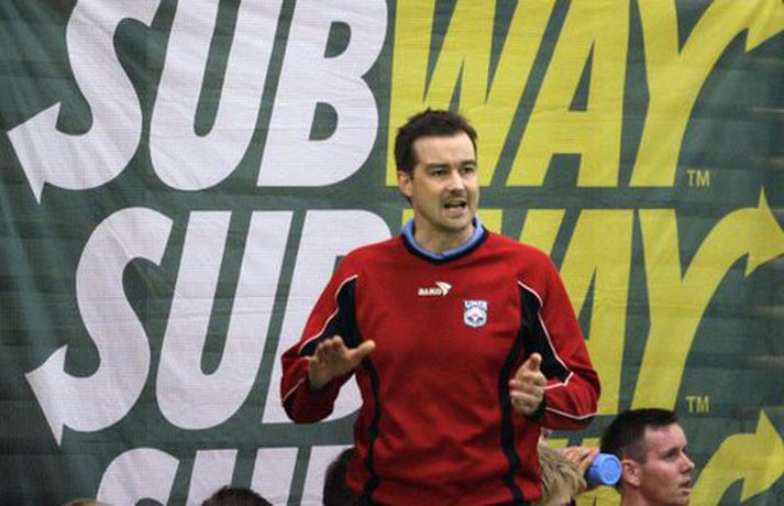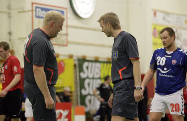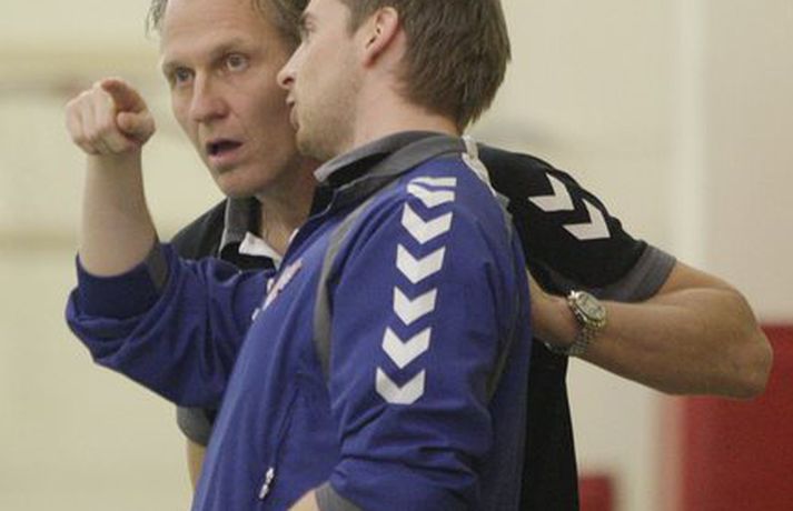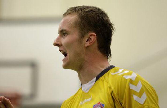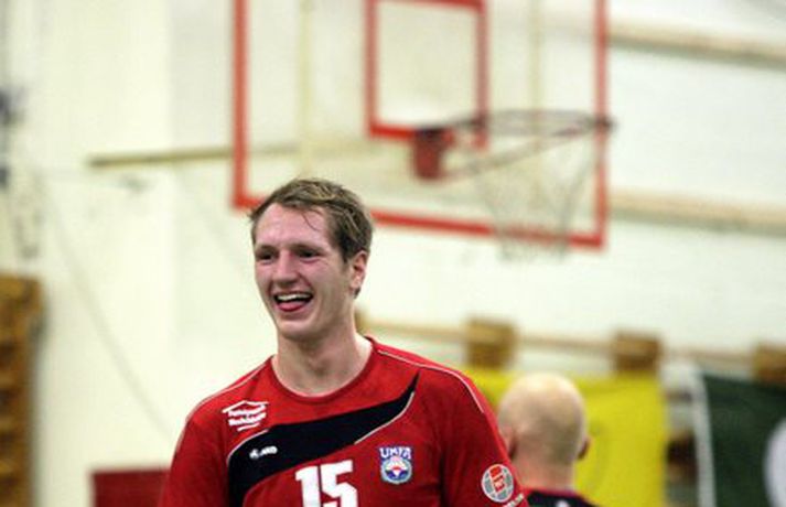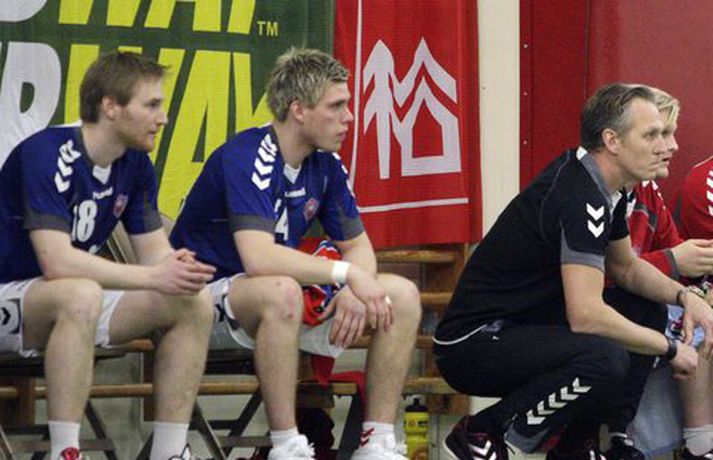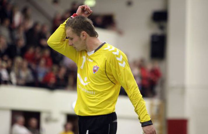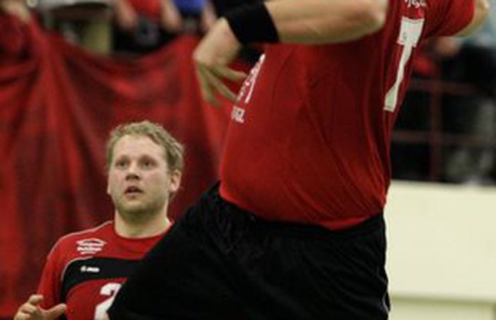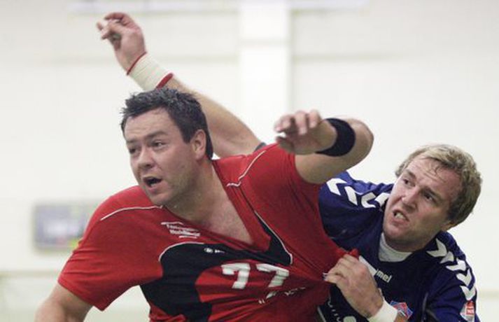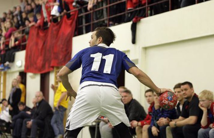 "Konni er kóngurinn," sungu leikmenn Vals inn í búningsklefa í kvöld eftir 22-23 sigur á Aftureldingu. Fyrsti sigur Valsmanna í vetur staðreynd og augljóslega þungu fargi létt af mönnum þar sem þeir fögnuðu líkt og þeir væru orðnir Íslandsmeistarar. Sigurinn var ekki auðveldur og með meiri klókindum hefðu Mosfellingar fengið eitthvað úr honum. Þeir voru aftur á móti ekki klókir heldur klaufalegir og þess vegna fengu þeir ekkert úr leiknum. Jafnræði var með liðunum framan af en í stöðunni 6-6 duttu Valsmenn í gírinn, skoruðu sex mörk í röð og komust í 6-12. Staðan í leikhléi var 7-12 fyrir Val. Þeir skoruðu fyrstu tvö mörkin í síðari hálfleik og náðu sjö marka forskoti, 7-14. Þá hrundi leikur liðsins og heimamenn komu til baka af miklum krafti. Þeir skoruðu sex mörk í röð og minnkuðu muninn í eitt mark, 13-14. Þegar rúmar 5 mínútur voru eftir jafnaði Afturelding loks leikinn, 20-20, og allt á suðupunkti síðustu mínúturnar. Þá tóku Mosfellingar upp á því að láta reka sig út af hvað eftir annað fyrir klaufaleg brot. Valsmenn náðu þó ekki að hrista þá almennilega af sér heldur rétt mörðu sigur. Lokamarkið var nokkuð umdeilt hjá Val enda fengu þeir að spila ansi lengi eftir að hendin var komin upp. Sigurinn hafðist þó og það eitt skiptir máli fyrir Val. Liðið á samt enn langt í land og hrunið í síðari hálfleik var afar dapurt. Allt of margir lykilmenn liðsins eru að spila illa og geta svo miklu betur. Sturla var samt fínn meðan hans naut við og Ingvar varði þokkalega á köflum. Aðrir voru einfaldlega slakir. Gamli jálkurinn Haukur Sigurvinsson var frábær hjá Mosfellingum í kvöld, Hafþór varði vel og Bjarni Aron kom sterkur upp í lokin. Það dugði ekki til í kvöld því þeir voru klaufar og höfðu ekki taugarnar til þess að klára leikinn. Afturelding-Valur 22-23 (7-12) Mörk Aftureldingar (skot): Bjarni Aron Þórðarson 7 (14), Haukur Sörli Sigurvinsson 6 (10), Jón Andri Helgason 4 (7), Daníel Jónsson 2 (7), Arnar Freyr Theodórsson 2 (6/1), Aron Gylfason 1 (2).Varin skot: Hafþór Einarsson 18 (41/3) 44%.Hraðaupphlaup: 4 (Haukur 2, Jón, Bjarni).Fiskuð víti: 1 (Bjarni).utan vallar: 14 mín. Mörk Vals (skot): Sturla Ásgeirsson 5 (6), Valdimar Fannar Þórsson 5/2 (9/2), Ernir Hrafn Arnarson 4 (13/1), Alexandr Jedic 3 (6), Jón Björgvin Pétursson 2 (4), Fannar Þorbjörnsson 2 (3), Anton Rúnarsson 2 (4), Heiðar Þór Aðalsteinsson 1 (2).Varin skot: Ingvar Guðmundsson 13 (35/1) 42%.Hraðaupphlaup: 5 (Sturla 3, Fannar, Anton).Fiskuð víti: 3 (Sturla, Jón, Ernir).utan vallar: 2 mín. Dómarar: Ingvar Guðjónsson og Magnús Jónsson, ágætir. Anton Rúnarsson er hér kominn í gegnum vörn Aftureldingar.Mynd/Valli