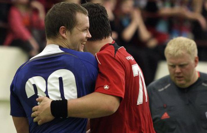 Umfjöllun: Þungu fargi létt af Valsmönnum Henry Birgir Gunnarsson í áhaldageymslunni að Varmá skrifar 18. nóvember 2010 21:02 "Konni er kóngurinn," sungu leikmenn Vals inn í búningsklefa í kvöld eftir 22-23 sigur á Aftureldingu. Fyrsti sigur Valsmanna í vetur staðreynd og augljóslega þungu fargi létt af mönnum þar sem þeir fögnuðu líkt og þeir væru orðnir Íslandsmeistarar. Sigurinn var ekki auðveldur og með meiri klókindum hefðu Mosfellingar fengið eitthvað úr honum. Þeir voru aftur á móti ekki klókir heldur klaufalegir og þess vegna fengu þeir ekkert úr leiknum. Jafnræði var með liðunum framan af en í stöðunni 6-6 duttu Valsmenn í gírinn, skoruðu sex mörk í röð og komust í 6-12. Staðan í leikhléi var 7-12 fyrir Val. Þeir skoruðu fyrstu tvö mörkin í síðari hálfleik og náðu sjö marka forskoti, 7-14. Þá hrundi leikur liðsins og heimamenn komu til baka af miklum krafti. Þeir skoruðu sex mörk í röð og minnkuðu muninn í eitt mark, 13-14. Þegar rúmar 5 mínútur voru eftir jafnaði Afturelding loks leikinn, 20-20, og allt á suðupunkti síðustu mínúturnar. Þá tóku Mosfellingar upp á því að láta reka sig út af hvað eftir annað fyrir klaufaleg brot. Valsmenn náðu þó ekki að hrista þá almennilega af sér heldur rétt mörðu sigur. Lokamarkið var nokkuð umdeilt hjá Val enda fengu þeir að spila ansi lengi eftir að hendin var komin upp. Sigurinn hafðist þó og það eitt skiptir máli fyrir Val. Liðið á samt enn langt í land og hrunið í síðari hálfleik var afar dapurt. Allt of margir lykilmenn liðsins eru að spila illa og geta svo miklu betur. Sturla var samt fínn meðan hans naut við og Ingvar varði þokkalega á köflum. Aðrir voru einfaldlega slakir. Gamli jálkurinn Haukur Sigurvinsson var frábær hjá Mosfellingum í kvöld, Hafþór varði vel og Bjarni Aron kom sterkur upp í lokin. Það dugði ekki til í kvöld því þeir voru klaufar og höfðu ekki taugarnar til þess að klára leikinn. Afturelding-Valur 22-23 (7-12) Mörk Aftureldingar (skot): Bjarni Aron Þórðarson 7 (14), Haukur Sörli Sigurvinsson 6 (10), Jón Andri Helgason 4 (7), Daníel Jónsson 2 (7), Arnar Freyr Theodórsson 2 (6/1), Aron Gylfason 1 (2).Varin skot: Hafþór Einarsson 18 (41/3) 44%.Hraðaupphlaup: 4 (Haukur 2, Jón, Bjarni).Fiskuð víti: 1 (Bjarni).utan vallar: 14 mín. Mörk Vals (skot): Sturla Ásgeirsson 5 (6), Valdimar Fannar Þórsson 5/2 (9/2), Ernir Hrafn Arnarson 4 (13/1), Alexandr Jedic 3 (6), Jón Björgvin Pétursson 2 (4), Fannar Þorbjörnsson 2 (3), Anton Rúnarsson 2 (4), Heiðar Þór Aðalsteinsson 1 (2).Varin skot: Ingvar Guðmundsson 13 (35/1) 42%.Hraðaupphlaup: 5 (Sturla 3, Fannar, Anton).Fiskuð víti: 3 (Sturla, Jón, Ernir).utan vallar: 2 mín. Dómarar: Ingvar Guðjónsson og Magnús Jónsson, ágætir. Anton Rúnarsson er hér kominn í gegnum vörn Aftureldingar.Mynd/Valli Olís-deild karla Skroll-Íþróttir Mest lesið Vonast til að komast í Kórinn: „Menn hafa aldrei séð annað eins“ Fótbolti Fær þrjár milljónir á dag næstu sex árin fyrir að gera ekkert Sport Stöðufundur í Laugardal klukkan 10:30 Fótbolti Enska úrvalsdeildin í jólaköttinn Enski boltinn Elsta konan til klára Járnkarlinn Sport Markvörður Inter banaði háöldruðum manni í hjólastól Sport Nýi íþróttastjóri Kjartans stal mörgæs og endaði í fangelsi í Singapúr Fótbolti Brendan Rodgers sagði starfinu sínu lausu eftir ásakanir Fótbolti Tyrkneska sambandið segir dómara hafa veðjað á þúsundir leikja Fótbolti Einkaviðtal við Carrick: „Hálfgerð tískubylgja sem einkennir fótboltann í dag“ Enski boltinn Fleiri fréttir Gísli bjó til meira en þriðjung markanna Haukur magnaður í sigri Löwen Blær skoraði þrjú og lagði upp jöfnunarmarkið KA/Þór sótti sigur gegn Fram og stigalausar Stjörnukonur Fram kjöldró HK og spenna í Eyjum Meistararnir unnu gegn ÍBV og ÍR hafði betur gegn Selfyssingum Donni og félagar björguðu stigi undir lokin Afturelding komst upp að hlið Hauka Seldu bleika búninginn hennar Herrem fyrir meira en milljón „Leið vel þegar ég fór inn úr færinu“ Uppgjörið FH - Haukar 27-26 | Birgir Már tryggði FH sigur eftir spennutrylli Bernard fór mikinn en Valsmenn sluppu með sigurinn Fyrsti sigur Þórsara síðan í byrjun september Ómar Ingi með fullkomnan leik í Meistaradeildinni Guðjón Valur og lærisveinar hársbreidd frá því að vinna Kiel Hlakka til að sjá Viktor Gísla aftur og senda honum skilaboð Neyddar í sömu stöðu og Ísland og límdu melónur á skóna Hatar hvítu stuttbuxurnar Fjölga stórmótum landsliða í handboltanum Allt jafnt í bikarslag íslensku stelpnanna Orri fagnaði í Íslendingaslag í Meistaradeildinni Hjartavandamál halda Reyni frá keppni Stórar breytingar á Evrópukeppnum í handbolta Framarar töpuðu aftur á heimavelli í Evrópudeildinni Magdeburg komst örugglega áfram í sextán liða úrslitin Íslensku strákarnir áberandi í Evrópudeildinni „Stærri og sterkari en liðin sem við þekkjum hérna heima“ Viktor til liðs við frænda sinn og bróður Uppgjörið: Portúgal - Ísland 26-25 | Annar eltingaleikur íslenska liðsins endar með öðru tapi Kom að fjórtán mörkum í stórsigri á Leipzig Sjá meira
