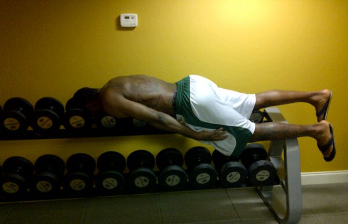 Körfuboltastjarnan óstýriláta, Gilbert Arenas, fylgir straumnum og hann er nú farinn að planka líkt og óður væri. Hann birtir ansi skemmtilegar myndir af sér að planka á Twitter-síðu sinni. Þar má sjá Arenas planka á lóðum, á hlaupabretti og jafnvel í heita pottinum sínum. Stutt er síðan Arenas byrjaði að nota Twitter á nýjan leik og hefur hann algjörlega farið hamförum síðan hann kom aftur á Twitter. Eins og marga grunaði kom hann sér fljótlega í vandræði á Twitter en hann hefur nú ákveðið að hætta öllu veseni og snúa sér að planki. Hægt er að sjá myndirnar af Arenas að planka í albúminu hér að neðan.