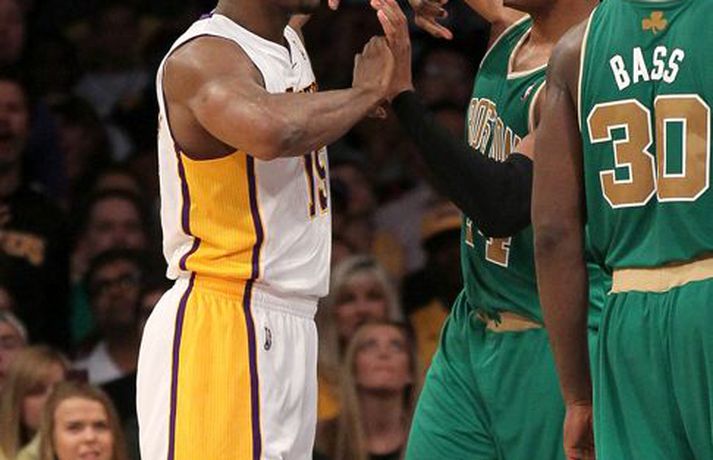 Los Angeles Lakers lagði erkifjendur sína frá Boston 97-94 í Staples-höllinni í Los Angeles í gærkvöldi. Lakers voru fimm stigum undir þegar tvær og hálf mínúta lifðu leiks. Frábær endasprettur tryggði liðinu sinn þriðja sigur á Celtics í röð. Liðsmenn Los Angeles Lakers komu gestunum í Boston í opna skjöldu í síðustu sókn sinni í viðureign liðanna í Staples Center í gærkvöld. Aldrei þessu vant átti Kobe Bryant ekki að sjá um málið heldur var stillt upp í leikkerfi fyrir hinn hávaxna Andrew Bynum sem kom Lakers þremur stigum yfir þegar 15 sekúndur lifðu leiks. Árangurslaust reyndu leikmenn Celtics að spila stórskyttuna Ray Allen uppi í lokasókn sinni í von um þriggja stiga körfu. Rajon Rondo skaut að lokum úr erfiðri stöðu og missti marks. „Þetta var geggjað. Það var Kobe sem lagði á ráðin fyrir síðustu sóknina," sagði Bynum hæstánægður með að hafa verið leitað til þegar mest lá við. Liðsmenn Lakers eru öllu vanari að fylgjast með og aðstoða hinn magnaða Kobe Bryant í lykilsóknum undir lok leikja en annað var uppi á teningnum í gærkvöldi. „Við elskum að sigra þetta lið," sagði Bynum sem skoraði 20 stig og tók 14 fráköst. Kobe Bryant var hins vegar maður leiksins með 26 stig, þar af 10 stig í lokaleikhlutanum. Lakers vann sinn 18 sigur í síðustu 19 heimaleikjum sínum. Þetta var þriðji sigur liðsins á Celtics í röð en liðin mættust í úrslitum NBA-deildarinnar árin 2008 og 2010. Hér að ofan má sjá nokkrar myndir AFP frá stemmningunni í Staples-Center í gær.
