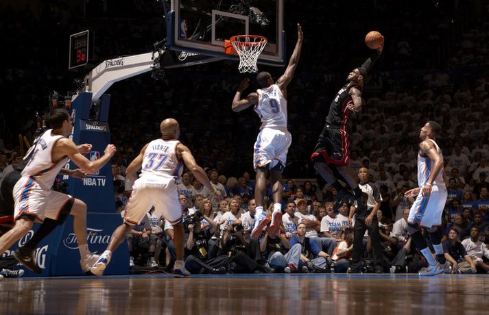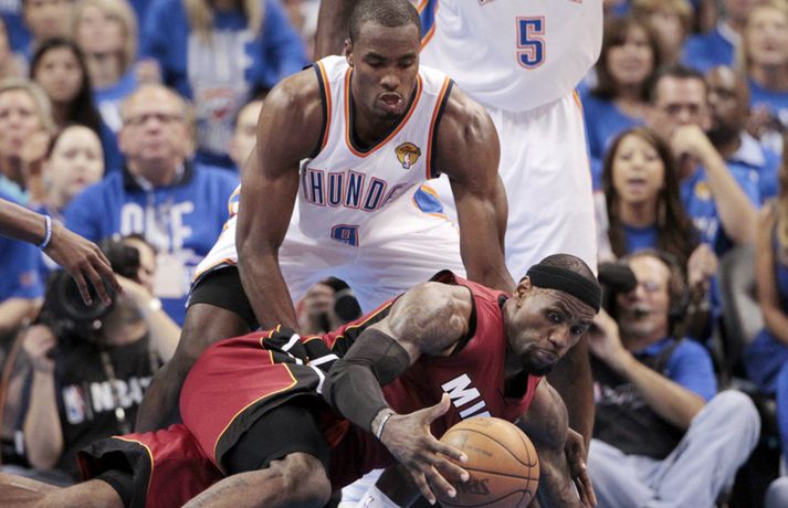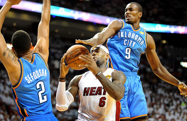 Serge Ibaka: LeBron James er ekki góður varnarmaður Óskar Ófeigur Jónsson skrifar 19. júní 2012 22:45 Serge Ibaka og LeBron James. Mynd/Nordic Photos/Getty Serge Ibaka, framherji Oklahoma City Thunder, ákvað að blanda sér í sálfræðistríðið á milli Miami Heat og Oklahoma City Thunder fyrir fjórða leik liðanna sem fer fram í Miami í kvöld. Leikurinn verður í beinni útsendingu á Stöð 2 Sport og hefst klukkan eitt eftir miðnætti að íslenskum tíma. Serge Ibaka notaði tækifærið í blaðaviðtali og skaut á LeBron James en þér félagar voru báðir valdir í varnarlið ársins í NBA-deildinni. Ibaka gefur hinsvegar ekki mikið fyrir varnartilþrif LeBron James. „LeBron James er ekki góður varnarmaður. Hann getur kannski spilað góða vörn í tvær til þrjár mínútur en aldrei í allar 48 mínúturnar. LeBron ræður ekki við Kevin Durant einn á einn en Miami-liðið er hinsvegar að spila góða liðsvörn," sagði Serge Ibaka og LeBron James var í kjölfarið spurður út í ummæli Ibaka. „Mér er nákvæmlega sama um hvað hann segir, hann er vitlaus," sagði LeBron James og bætti við: „Það eru alltaf einhverjir að beina orðum sínum til mín í öllum einvígum og svo reyna fjölmiðlarnir að fá viðbrögð frá mér. Þetta er bara heimskulegt," sagði James. LeBron James hefur spilað vel í fyrstu þremur leikjunum í úrslitaeinvíginu en hann er með 30,3 stig, 10,3 fráköst og 4,0 stoðsendingar að meðaltali í leik í einvíginu á móti Thunder. Ibaka er aftur á móti með 7,3 stig, 5,0 fráköst og 2,3 varin skot að meðaltali. NBA Mest lesið Grafalvarleg staða: „Þurfum að fara í sársaukafullar aðgerðir“ Handbolti Ógeðslega erfitt og ógeðslega vont en brosir oft í viku á eftir Sport Fram þvertekur fyrir metnaðarleysi og leitar að nýjum þjálfurum Íslenski boltinn „Nú er nóg komið“ Fótbolti Skortir Liverpool breidd þrátt fyrir gríðarleg fjárútlát síðasta sumar? Enski boltinn Nefna greinar Íslandsmótsins í CrossFit í höfuðið á íslenskum íþróttakonum Sport Arnór Snær snýr aftur heim Handbolti Besta handboltadeild heims missir aðalstyrktaraðila sinn Handbolti Sádar eru ekki að fara að byggja HM-leikvang ofan á skýjakljúfi Fótbolti Eldgos og brjósklos skapa óvissu: „Vonum bara að móðir náttúra leyfi þetta“ Sport Fleiri fréttir Íslenski körfuboltinn og Grindavík verðlaunuð NBA-leikmaður með krabbamein Haukur Helgi: Höfum ekki verið að spila góðan körfubolta „Getum verið fjandi góðir“ Uppgjörið: Álftanes-Njarðvík 93-92 | Heitur Haukur var hetjan á Álftanesinu Uppgjörið: Keflavík - Þór Þ. 86-82 | Þarf ekki alltaf að vera fallegt ef það virkar „Varnarleikur snýst eiginlega bara um að nenna“ Uppgjörið: Valur - Grindavík 55-90 | Taplausir Grindvíkingar kjöldrógu Val „Búnir að sýna hvað við getum verið lélegir“ KR - ÍA 109-75 | KR-ingar sýndu allar sínar bestu hliðar þegar þeir burstuðu Skagamenn Íslandsmeistararnir frá því fyrir sextíu árum heiðursgestir í kvöld „Hann ætti bara að skrifa afsökunarbiblíuna“ Uppgjörið: Njarðvík - Grindavík 85-84| Njarðvík fyrstar til að leggja Grindavík af velli Ótrúleg dramatík í Garðabæ og á Sauðárkróki Landsliðsmennirnir öflugir í Evrópu Jordan gagnrýnir álagsstjórnun í NBA: Þú hefur skyldu til að láta sjá þig Skiptiborð hjá stelpunum í kvöld Var með skattinn á hælunum þegar hann fór í veðmálabraskið Bíll Shaquille O'Neal enn ófundinn Martin öflugur í góðum sigri Öllum leikjum Bónus-deildar kvenna í kvöld frestað Stólarnir ekki í vandræðum á Egilsstöðum Enginn Lakers-maður hafði náð þessu í meira en 52 ár Veðmál rædd í Körfuboltakvöldi: „Bara ævintýralega heimskulegt“ Kvöddu húsið og Nablinn klifraði í kveðjuskyni Martin naut sín í fræknum sigri á meisturum Bayern Tryggvi lykilmaður í sigri Bilbao Elvar skoraði tólf í naumu tapi Tilþrifin: Varin skot og ótrúlegar körfur Valsmanna Þriðja tapið í röð hjá Jóni og félögum Sjá meira
