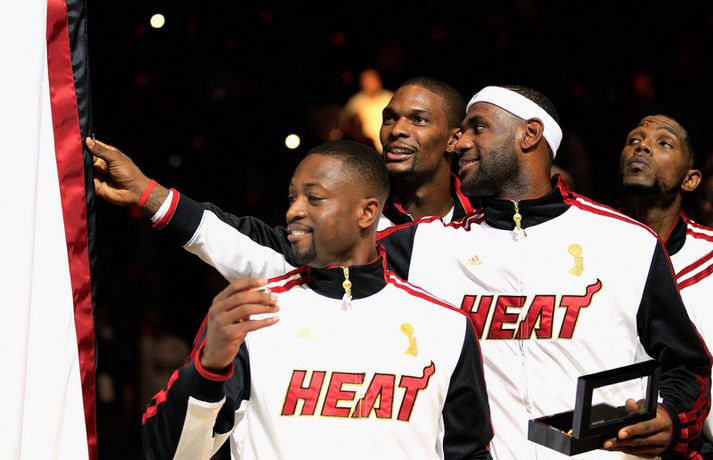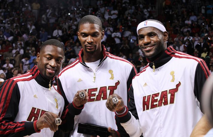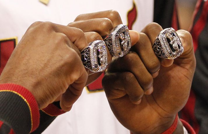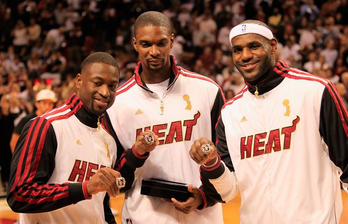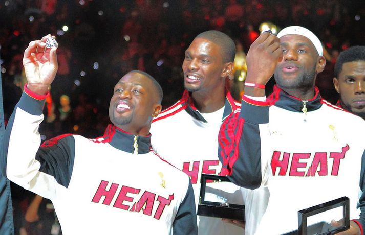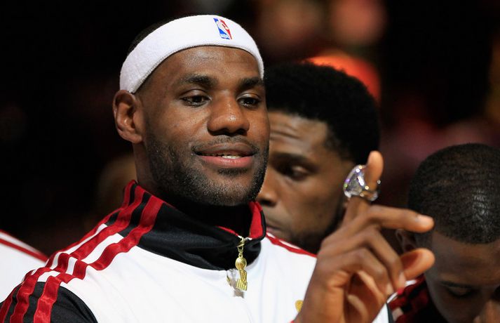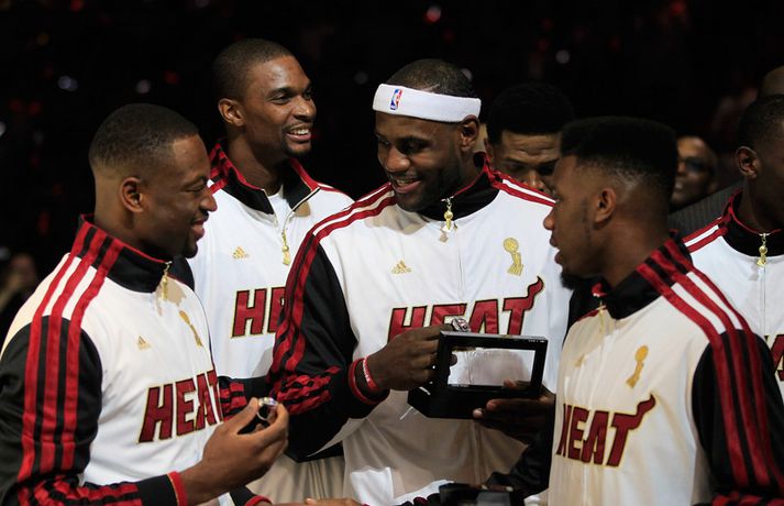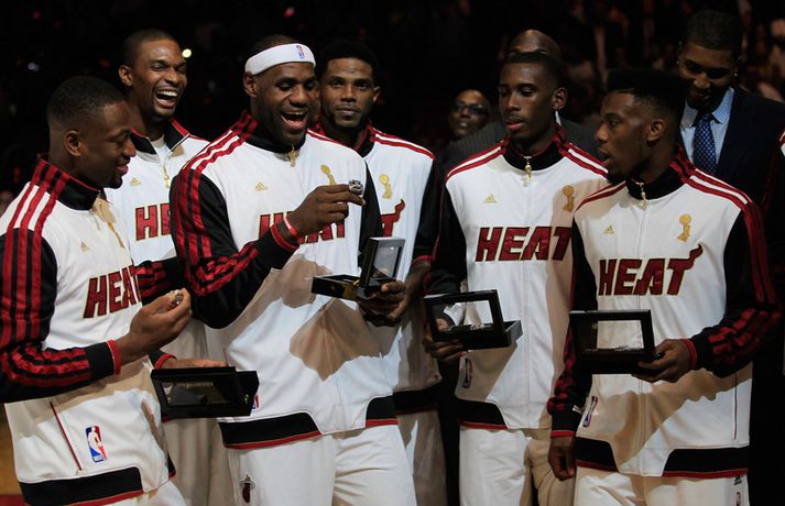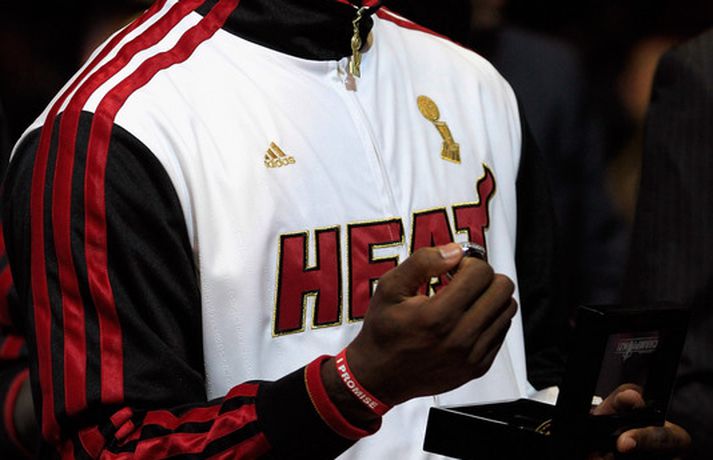 LeBron James og félagar í Miami Heat hófu titilvörnina í NBA-deildinni með sigri á Boston í nótt en fyrir leikinn fengu þeir meistarahringana afhenta. James var búinn að bíða í níu ár eftir því að fá hringinn sinn og stundin rann loksins upp í nótt. Hringarnir voru glæsilegir. Á þeim stóð með annars bæði "All In" eða "Allir saman" og "Family" eða "Ein fjölskylda" en auk þess voru myndir af Larry O'Brien bikarnum. Ljósmyndarar á vegum Getty-myndabankans voru að sjálfsögðu á staðnum og þeir náðu þessum skemmtilegu myndum. Myndirnar má sjá í albúminu hér að neðan. Hægt er að sjá myndirnar stærri með því að smella á þær.