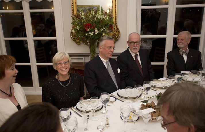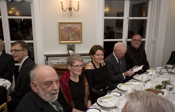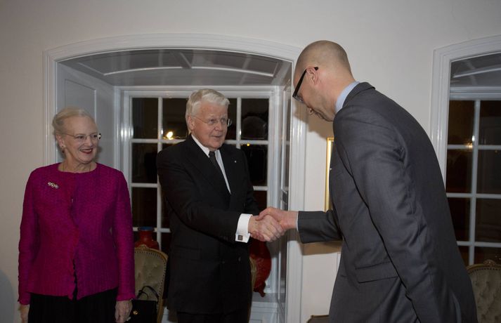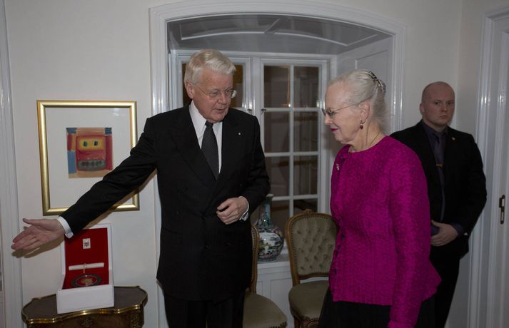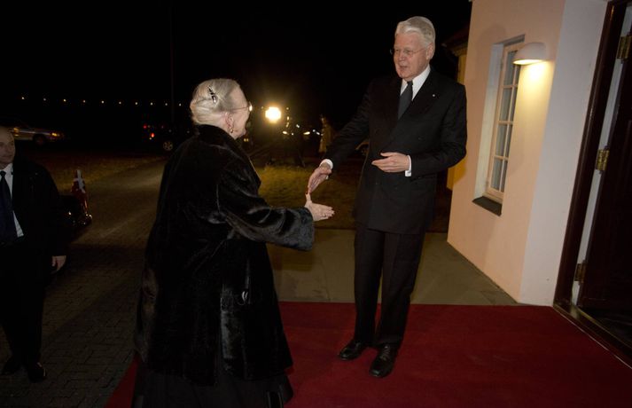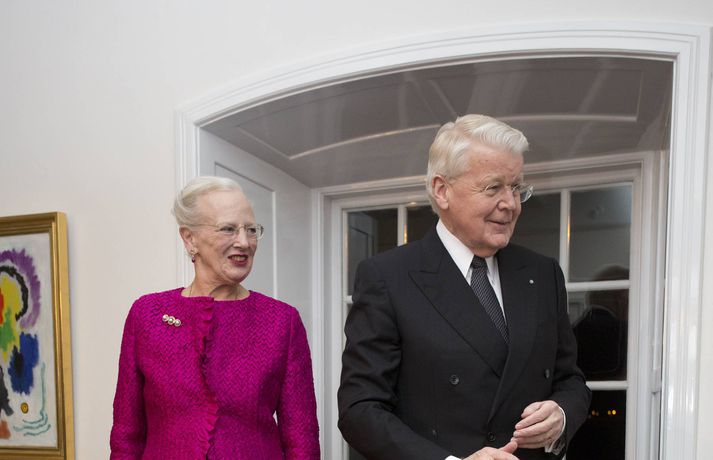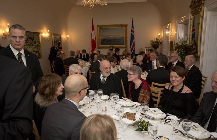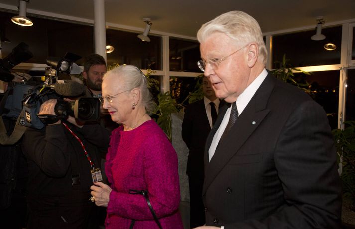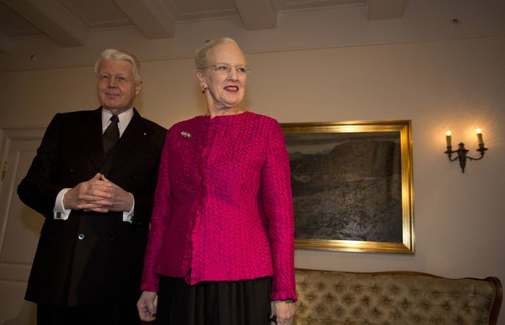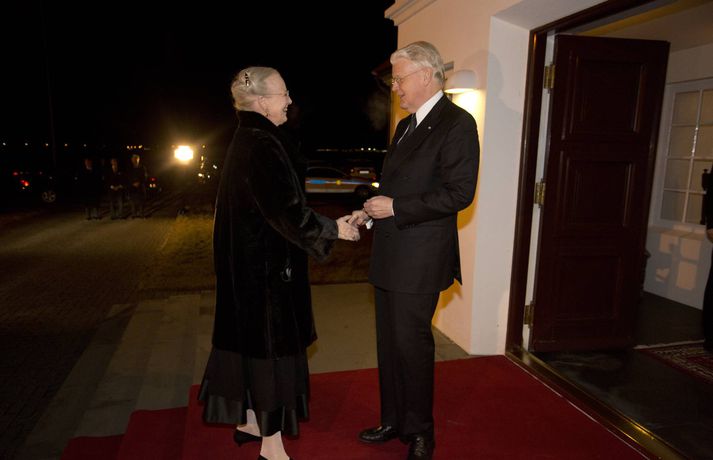 Margrét Þórhildur II Danadrottning er á Íslandi í tilefni af 350 ára afmæli Árna Magnússonar handritasafnara. Í kvöld snæddi hún hátíðarkvöldverð með Ólafi Ragnari Grímssyni forseta Íslands á Bessastöðum. Meðal gesta voru Sigmundur Davíð Gunnlaugsson forsætisráðherra, Siguður Líndal lagaprófessor og Arnaldur Indriðason rithöfundur. Boðið var upp á grænmeti borið fram með reyktum áli og fylltu eggi í forrétt. Í aðalrétt var sunnlenskur lax með íslensku rótargrænmeti og í eftirrétt var súkkulaðikaka með jarðaberjum. Í ræðu Ólafs Ragnars kom fram að Þórhildur drottning er sá þjóðhöfðingi erlendur sem oftast hefur setið til borðs á Bessastöðum, sem hann sagði í senn skemmtilega sönnun á einstakri vináttu þjóðanna og um leið vitnisburð um að enn séu þær að bæta nýjum köflum við söguna.Ólafur Ragnar Grímsson forseti Íslands, Margrét Þórhildur Danadrottning og Sigmundur Davíð Gunnlaugsson forsætisráðherra skemmtu sér vel við hátíðarhöldin.Mynd/ValliSigurður Líndal lagaprófessor var meðal gesta Ólafs Ragnars á hátíðarkvöldverðinum.Mynd/ValliArnarldur Indriðason rithöfundur átti góða kvöldstund með Margréti Þórhildi Danadrottningu yfir hátíðarkvöldverði.Mynd/Valli