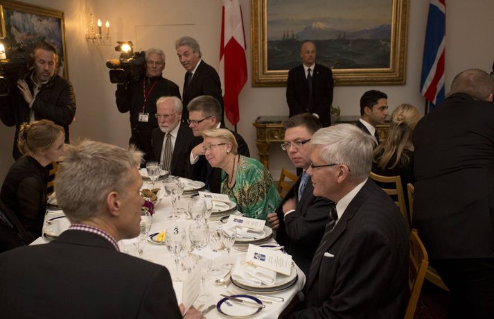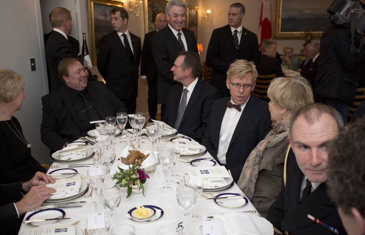 Danadrottning á Bessastöðum Fanney Birna Jónsdóttir skrifar 12. nóvember 2013 22:05 Ólafur Ragnar Grímsson forseti Íslands, Margrét Þórhildur Danadrottning og Sigmundur Davíð Gunnlaugsson forsætisráðherra skemmtu sér vel við hátíðarhöldin. Mynd/Valgarður Margrét Þórhildur II Danadrottning er á Íslandi í tilefni af 350 ára afmæli Árna Magnússonar handritasafnara. Í kvöld snæddi hún hátíðarkvöldverð með Ólafi Ragnari Grímssyni forseta Íslands á Bessastöðum. Meðal gesta voru Sigmundur Davíð Gunnlaugsson forsætisráðherra, Siguður Líndal lagaprófessor og Arnaldur Indriðason rithöfundur. Boðið var upp á grænmeti borið fram með reyktum áli og fylltu eggi í forrétt. Í aðalrétt var sunnlenskur lax með íslensku rótargrænmeti og í eftirrétt var súkkulaðikaka með jarðaberjum. Í ræðu Ólafs Ragnars kom fram að Þórhildur drottning er sá þjóðhöfðingi erlendur sem oftast hefur setið til borðs á Bessastöðum, sem hann sagði í senn skemmtilega sönnun á einstakri vináttu þjóðanna og um leið vitnisburð um að enn séu þær að bæta nýjum köflum við söguna.Ólafur Ragnar Grímsson forseti Íslands, Margrét Þórhildur Danadrottning og Sigmundur Davíð Gunnlaugsson forsætisráðherra skemmtu sér vel við hátíðarhöldin.Mynd/ValliSigurður Líndal lagaprófessor var meðal gesta Ólafs Ragnars á hátíðarkvöldverðinum.Mynd/ValliArnarldur Indriðason rithöfundur átti góða kvöldstund með Margréti Þórhildi Danadrottningu yfir hátíðarkvöldverði.Mynd/Valli Forseti Íslands Kóngafólk Mest lesið Veðurvaktin: Snjókoman rétt að byrja og víða erfið færð Veður Ungur Miðflokksmaður gengst við rasisma og segir af sér Innlent Flugmaðurinn sem fórst millilenti oft í Reykjavík Innlent Snjókoman rétt að byrja Innlent Karlmaður lést í Bláa lóninu Innlent Eldur í blokk við Ljósheima Innlent Bílar út af veginum á Reykjanesbraut Innlent Hvatt til varúðar vegna snjóflóðahættu á suðvesturhorninu Innlent Ráðgjafinn ráðinn í tímabundið starf eftir dýra skreppitúra Innlent Biðu í fjóra tíma úti á braut og aðra fjóra við farangursbeltin Innlent Fleiri fréttir Snjókoman mikla, ábótavant verklag ríkislögreglustjóra og jólasveinamót Karlmaður lést í Bláa lóninu Biðu í fjóra tíma úti á braut og aðra fjóra við farangursbeltin Kærðu umdeildar framkvæmdir allt of seint Skellt í lás í sundlaugum borgarinnar vegna veðurs Reglur brotnar og þjónusta sem bjóða ætti út Þarf að borga bætur þrátt fyrir breytingar á hlaupahjólinu Hvatt til varúðar vegna snjóflóðahættu á suðvesturhorninu Meiri kvika en í síðasta gosi Eldur í blokk við Ljósheima Flugmaðurinn sem fórst millilenti oft í Reykjavík Halla leiðir krabbameinsráð ráðherra Snjókomumet og umferðaröngþveiti Segir sameiginlegum gildum Norðurlanda ógnað Fjölmargir farþegar fastir í flugvélum á Keflavíkurflugvelli Ungur Miðflokksmaður gengst við rasisma og segir af sér Sturlað ástand og United vettlingar prjónaðir í bílnum Mesta snjódýpt í Reykjavík sem mælst hefur í október Viðbragðsaðilar í mikilli hættu vegna bíla á sumardekkjum Bílar út af veginum á Reykjanesbraut Vill heimila Samkeppniseftirlitinu að ráðast í húsleitir Snjókoman rétt að byrja Píratar berjist gegn „rísandi bylgju lýðskrums og fasisma“ Skvísur geti virkað sem hálfgerðir þroskaþjófar Ráðgjafinn ráðinn í tímabundið starf eftir dýra skreppitúra Misvægi atkvæða bitnar mest á Kraganum Heitavatnslaust á Suðurnesjum og rafmagnslaust víða um land Skreppiferðir í Jysk meðal þess sem ráðgjafi rukkaði fyrir „Ég tel ekki tilefni til að íhuga stöðu mína“ Áhyggjur af lánaframboði og ógnarlangar biðraðir Sjá meira