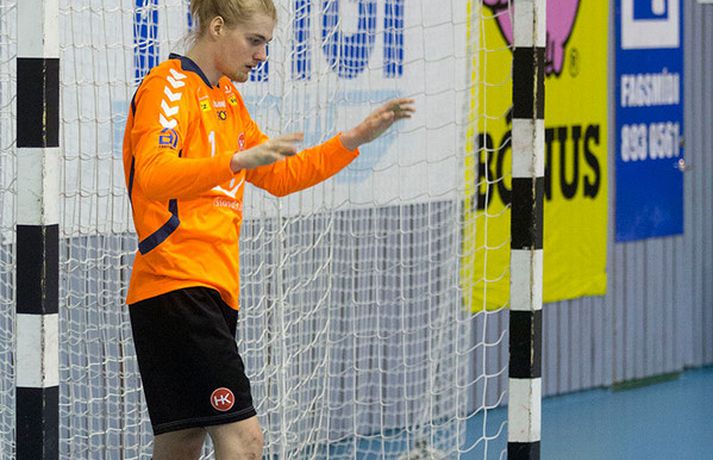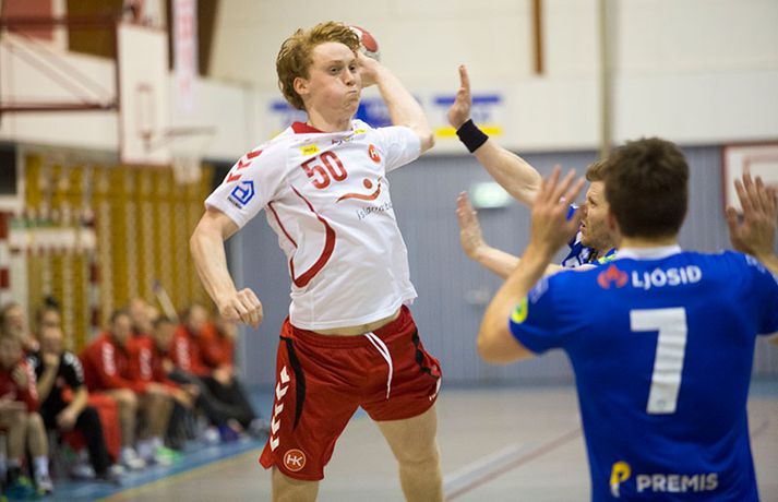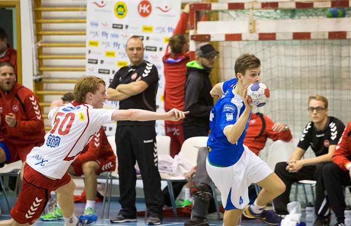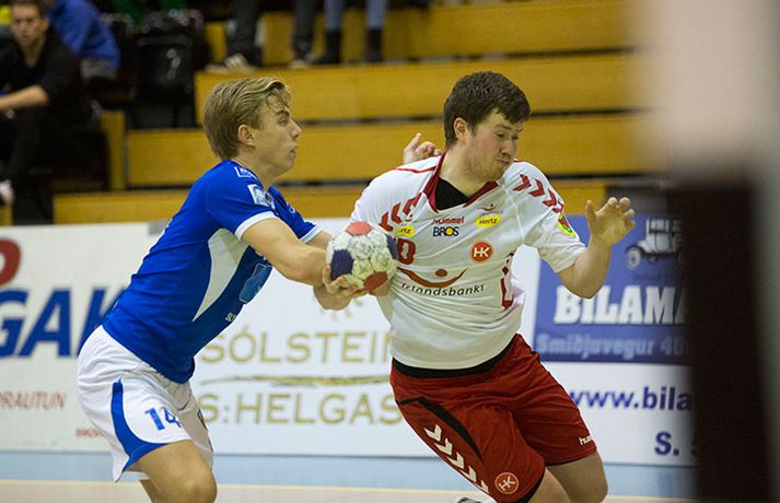 HK vann sinn fyrsta sigur í Olís-deild karla í kvöld þegar liðið sigraði Íslandsmeistara Fram, 22-19. Liðið hafði einungis náð í eitt stig í fyrstu átta leikjunum, svo að sigurinn var kærkominn.Daníel Rúnarsson, ljósmyndari Vísis og Fréttablaðsins, var á leiknum í Digranesi í kvöld og náði þessum skemmtilegu myndum sem má sjá hér með því að fletta hér yrir ofan en einnig eru nokkrar góðar myndir hér fyrir neðan. Leikurinn byrjaði ekki fjörlega. Langt því frá. Liðin skiptust á að missa boltann klaufalega og fyrsta markið kom ekki fyrr enn eftir sjö og hálfa mínúta, en það var Atli Karl Bachmann sem skoraði fyrir heimamenn. Atli skoraði fyrstu tvö mörkin, áður en Elías skoraði fyrsta markið fyrir Fram eftir níu mínútna leik. Eftir rúmlega stundarfjórðung var staðan orðin 6-2 fyrir heimamenn og þá var Guðlaugi Arnarssyni, þjálfara Fram, nóg boðið og tók hann leikhlé. Hans leikmenn rönkuðu aðeins við sér í leikhléinu, en náðu þó aldrei að minnka muninn í meira en tvö mörk. Í hálfleik var einmitt tveggja marka munur, eða 10-8. Í síðari hálfleik var svipað uppá teningnum. Leó Snær Pétursson kom HK fjórum mörkum yfir þegar þrettán mínútur voru búnar af síðari hálfleik, 16-12, en þá vöknuðu gestirnir og skoruðu nokkur mörk í röð. Ragnar Kjartansson, ungur strákur, minnkaði muninn í 16-15 og höfðu þá HK ekki skorað í sjö mínútur. Samúel Ívar Árnason, þjálfari HK, tók þá leikhlé og heimamenn náðu aftur fjögurra marka forystu, 19-15. HK hélt svo forystunni út leikinn, en Leó Snær Pétursson skoraði hrikalega mikilvægt mark fyrir heimamenn þegar tæpar tvær mínútur voru til leiksloka þegar hann kom þeim í 21-19. Lokatölur urðu svo 22-19. Leikurinn var skrýtinn og fyrri hálfleikurinn nokkuð skrautlegur. Fyrsti sigur HK og þeir fá hrósið í dag. Varnarleikurinn var virkilega öflugur og Atli Karl frábær í sókinni. Framarar spiluðu líklega einn sinn versta leik á tímabilinu, en þeir virtust einfaldlega ekki tilbúnir í verkefnið. Þeir voru ragir í sínum aðgerðum, eins og sést á skorinu, að skora einungis nítján mörk á 60 mínútum. Atli Karl Bachmann var frábær í liði HK sem og nánast allir sem komu við sögu. Atli skoraði átta mörk úr níu skotum, en næstur kom Leó með sex mörk. Helgi Hlynsson stóð sig einnig ágætlega í markinu, en hann varði um fimmtán skot. Í liði Fram var Garðar B. Sigurjónsson langatkvæðamestur með átta mörk, en þrjú af þeim úr vítum. Stefán Baldvin Stefánsson og Ragnar Kjartansson komu næstir með þrjú mörk.Garðar: Skammast mín fyrir nýtinguna „Það fór flest allt úrskeiðis, sérstaklega sóknarlega. Vörnin var allt í lagi, en vorum ekki alveg að fá markvörsluna. Lykilmenn voru ekki að ná sér á strik, ég skammast mín fyrir nýtinguna mína í dag. Þó ég hafi verið með nokkur mörk voru þau úr alltof, alltof mörgum skotum. Sóknin fór út í veður og vind," sagði Garðar B. Sigurjónsson, línumaður Fram, hundfúll eftir tapið. „Við vorum bara ekki mættir til leiks hérna í dag. Ég veit ekki hvað við höldum, að við séum eitthvað flottir eftir að hafa unnið nokkra leiki og vorum í kringum toppinn. Við getum ekki mætt með hangandi haus og ef við gerum það, sjáum við hvað gerist." „Við erum ekki dottnir úr neinni toppbaráttu. Þetta var slys þessi leikur og við ætlum að rífa okkur í gang. Við hljótum að rífa okkur í gang, fjandinn hafi það, og reynum að gera betur í næsta leik. Það er ekkert annað sem kemur til boða. Við þurfum bara sýna úr hverju við erum gerðir; hvort við ætlum að vera eitthverjir pappakassar hérna eða mæta og sýna að við getum spilað alvöru handbolta," sagði Garðar við Vísi eftir leik.Samúel Ívar: Ef við höldum svona áfram eru okkur allir vegir færir „Flott barátta skóp þennan sigur. Við erum mátulega skynsamir að stærstu leyti þannig við náum að koma í veg fyrir hraðaupphlaupin sem þeir hafa verið mjög sterkir að nýta sér. Þegar við náum að stilla upp í vörn erum við virkilega þéttir. Það er erfitt að berjast við þá, en við fórum þetta á baráttunni og viljanum," sagði Samúel Ívar Árnason, þjálfari HK, skiljanlega himinlifandi eftir leik. „Mér fannst varnarleikurinn mjög góður allan tímann. Á fyrsta korterinu vorum við örugglega svona ellefu til tólf mínútur í vörn. Við vorum að spila dálítið hraðar sóknir og Framarar voru að spila lengri sóknir, en náðu ekki að finna leiðir framhjá okkur." „Við áttum í erfiðleikum með línumanninn(Garðar B. Sigurjónsson), en að öðru leyti mættum við vel á menn. Heilt yfir virkilega flottur vilji hjá strákunum. Við vorum ekkert að liggja og vorkenna okkur þegar við vorum að tapa. Við ætlum ekkert að fara fram úr okkur núna, en heill leikur spilaður vel." „Annar leikurinn í röð sem við spilum vel og baráttan var virkilega góð. Ef við höldum þannig áfram eru okkur allir vegir færir. Það var eitthver að gera grín að mér um daginn að ég væri búinn að tapa sjö í röð, síðan þá er ég búinn að vinna tvo í röð," sagði Samúel að lokum.Mynd/DaníelMynd/DaníelMynd/DaníelMynd/Daníel
