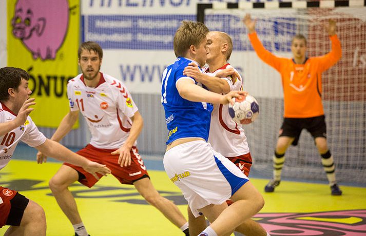 Umfjöllun, viðtöl og myndir: HK - Fram 22-19 | Fyrsti sigur HK-inga í vetur Anton Ingi Leifsson í Digranesi skrifar 21. nóvember 2013 12:32 Atli Karl Bachmann átti flottan leik í kvöld. Mynd/Daníel HK vann sinn fyrsta sigur í Olís-deild karla í kvöld þegar liðið sigraði Íslandsmeistara Fram, 22-19. Liðið hafði einungis náð í eitt stig í fyrstu átta leikjunum, svo að sigurinn var kærkominn.Daníel Rúnarsson, ljósmyndari Vísis og Fréttablaðsins, var á leiknum í Digranesi í kvöld og náði þessum skemmtilegu myndum sem má sjá hér með því að fletta hér yrir ofan en einnig eru nokkrar góðar myndir hér fyrir neðan. Leikurinn byrjaði ekki fjörlega. Langt því frá. Liðin skiptust á að missa boltann klaufalega og fyrsta markið kom ekki fyrr enn eftir sjö og hálfa mínúta, en það var Atli Karl Bachmann sem skoraði fyrir heimamenn. Atli skoraði fyrstu tvö mörkin, áður en Elías skoraði fyrsta markið fyrir Fram eftir níu mínútna leik. Eftir rúmlega stundarfjórðung var staðan orðin 6-2 fyrir heimamenn og þá var Guðlaugi Arnarssyni, þjálfara Fram, nóg boðið og tók hann leikhlé. Hans leikmenn rönkuðu aðeins við sér í leikhléinu, en náðu þó aldrei að minnka muninn í meira en tvö mörk. Í hálfleik var einmitt tveggja marka munur, eða 10-8. Í síðari hálfleik var svipað uppá teningnum. Leó Snær Pétursson kom HK fjórum mörkum yfir þegar þrettán mínútur voru búnar af síðari hálfleik, 16-12, en þá vöknuðu gestirnir og skoruðu nokkur mörk í röð. Ragnar Kjartansson, ungur strákur, minnkaði muninn í 16-15 og höfðu þá HK ekki skorað í sjö mínútur. Samúel Ívar Árnason, þjálfari HK, tók þá leikhlé og heimamenn náðu aftur fjögurra marka forystu, 19-15. HK hélt svo forystunni út leikinn, en Leó Snær Pétursson skoraði hrikalega mikilvægt mark fyrir heimamenn þegar tæpar tvær mínútur voru til leiksloka þegar hann kom þeim í 21-19. Lokatölur urðu svo 22-19. Leikurinn var skrýtinn og fyrri hálfleikurinn nokkuð skrautlegur. Fyrsti sigur HK og þeir fá hrósið í dag. Varnarleikurinn var virkilega öflugur og Atli Karl frábær í sókinni. Framarar spiluðu líklega einn sinn versta leik á tímabilinu, en þeir virtust einfaldlega ekki tilbúnir í verkefnið. Þeir voru ragir í sínum aðgerðum, eins og sést á skorinu, að skora einungis nítján mörk á 60 mínútum. Atli Karl Bachmann var frábær í liði HK sem og nánast allir sem komu við sögu. Atli skoraði átta mörk úr níu skotum, en næstur kom Leó með sex mörk. Helgi Hlynsson stóð sig einnig ágætlega í markinu, en hann varði um fimmtán skot. Í liði Fram var Garðar B. Sigurjónsson langatkvæðamestur með átta mörk, en þrjú af þeim úr vítum. Stefán Baldvin Stefánsson og Ragnar Kjartansson komu næstir með þrjú mörk.Garðar: Skammast mín fyrir nýtinguna „Það fór flest allt úrskeiðis, sérstaklega sóknarlega. Vörnin var allt í lagi, en vorum ekki alveg að fá markvörsluna. Lykilmenn voru ekki að ná sér á strik, ég skammast mín fyrir nýtinguna mína í dag. Þó ég hafi verið með nokkur mörk voru þau úr alltof, alltof mörgum skotum. Sóknin fór út í veður og vind," sagði Garðar B. Sigurjónsson, línumaður Fram, hundfúll eftir tapið. „Við vorum bara ekki mættir til leiks hérna í dag. Ég veit ekki hvað við höldum, að við séum eitthvað flottir eftir að hafa unnið nokkra leiki og vorum í kringum toppinn. Við getum ekki mætt með hangandi haus og ef við gerum það, sjáum við hvað gerist." „Við erum ekki dottnir úr neinni toppbaráttu. Þetta var slys þessi leikur og við ætlum að rífa okkur í gang. Við hljótum að rífa okkur í gang, fjandinn hafi það, og reynum að gera betur í næsta leik. Það er ekkert annað sem kemur til boða. Við þurfum bara sýna úr hverju við erum gerðir; hvort við ætlum að vera eitthverjir pappakassar hérna eða mæta og sýna að við getum spilað alvöru handbolta," sagði Garðar við Vísi eftir leik.Samúel Ívar: Ef við höldum svona áfram eru okkur allir vegir færir „Flott barátta skóp þennan sigur. Við erum mátulega skynsamir að stærstu leyti þannig við náum að koma í veg fyrir hraðaupphlaupin sem þeir hafa verið mjög sterkir að nýta sér. Þegar við náum að stilla upp í vörn erum við virkilega þéttir. Það er erfitt að berjast við þá, en við fórum þetta á baráttunni og viljanum," sagði Samúel Ívar Árnason, þjálfari HK, skiljanlega himinlifandi eftir leik. „Mér fannst varnarleikurinn mjög góður allan tímann. Á fyrsta korterinu vorum við örugglega svona ellefu til tólf mínútur í vörn. Við vorum að spila dálítið hraðar sóknir og Framarar voru að spila lengri sóknir, en náðu ekki að finna leiðir framhjá okkur." „Við áttum í erfiðleikum með línumanninn(Garðar B. Sigurjónsson), en að öðru leyti mættum við vel á menn. Heilt yfir virkilega flottur vilji hjá strákunum. Við vorum ekkert að liggja og vorkenna okkur þegar við vorum að tapa. Við ætlum ekkert að fara fram úr okkur núna, en heill leikur spilaður vel." „Annar leikurinn í röð sem við spilum vel og baráttan var virkilega góð. Ef við höldum þannig áfram eru okkur allir vegir færir. Það var eitthver að gera grín að mér um daginn að ég væri búinn að tapa sjö í röð, síðan þá er ég búinn að vinna tvo í röð," sagði Samúel að lokum.Mynd/DaníelMynd/DaníelMynd/DaníelMynd/Daníel Olís-deild karla Mest lesið Fær þrjár milljónir á dag næstu sex árin fyrir að gera ekkert Sport Stöðufundur í Laugardal klukkan 10:30 Fótbolti Vonast til að komast í Kórinn: „Menn hafa aldrei séð annað eins“ Fótbolti Elsta konan til klára Járnkarlinn Sport Enska úrvalsdeildin í jólaköttinn Enski boltinn Nýi íþróttastjóri Kjartans sta