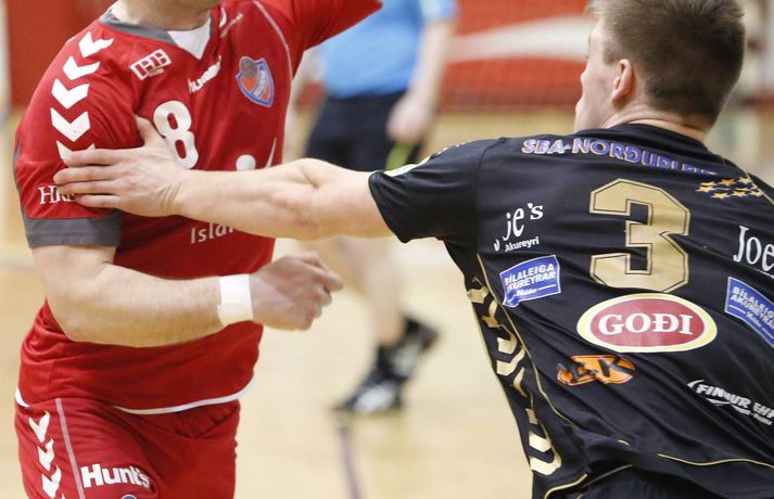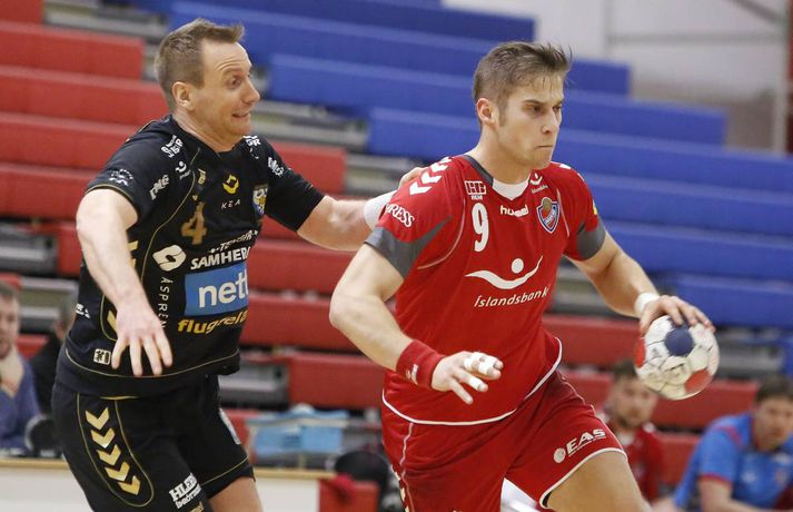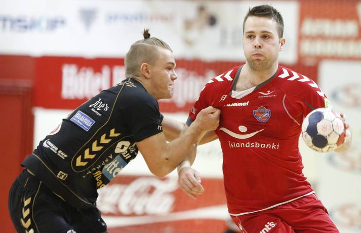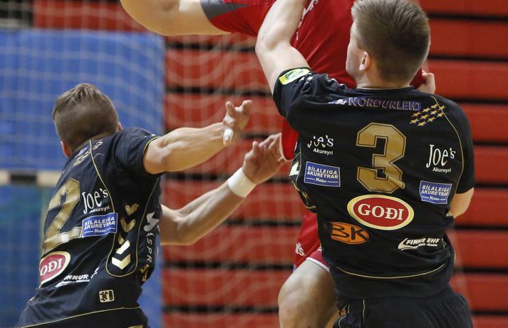 Haukar styrktu stöðu sína á toppnum í kvöld þegar þeir sigruðu Akureyri 26-20. Giedrius Morkunas og varnarleikur Hauka voru lykillinn að því. Leikurinn var þó ekki mikið fyrir augað. Leikurinn var vel jafn í rúmar tuttugu og fimm mínútur í fyrri hálfleik. Liðin skiptust á að skora og bæði lið léku fínan varnarleik þó gestirnir hefðu þurft að hafa meira fyrir hverju marki ef svo mætti að orði komast. Þeir opnuðu þó vörn Hauka ágætlega oft á tíðum. Undir lok fyrri hálfleiks gáfu þó heimamenn í og breyttu stöðunni úr 8-8 í 12-9, þar af tvö hraðaupphlaupsmörk frá Árna Stein Steinþórssyni. Staðan 12-9 í hálfleik. Fyrri hálfleik var ekki mikið fyrir augað eins og tölurnar gefa kannski til að kynna. Eftir 26 mínútur var staðan einungis 8-8 sem gefur til að kynna skemmtanagildið, sem var ekki mikið. Heimamenn byrjuðu síðari hálfleik af krafti og náðu sex marka forystu eftir rúmar fimm mínútur í síðari hálfleik. Gestirnir spiluðu sig oft í góð færi í síðari hálfleik, en Morkunas var þeim erfiður. Lokaði vel og örugglega á þá. Giedrius Morkunas var maður leiksins í kvöld. Morkunas varði vel og þá sérstaklega í fyrri hálfleik, en eins og fyrr segir spiluðu gestirnir sig oft í færi. Sigurbergur Sveinsson og Árni Steinn Steinþórsson voru bestir í sóknarleik heimamanna, en Sigurbergur tók sig nokkrar mínútur í að hitna aðeins. Í liði gestanna báru þeir Bjarni Fritzson og Kristján Orri liði uppi. Örvhentu mennirnir skoruðu alls fjórtán af tuttugu mörkum gestanna og þurfa fleiri að stíga upp ætli liði sér að vinna eins sterkt lið og Haukanna. Með sigrinum ná Haukarnir sjö stiga forystu á topnum, þangað til í kvöld að minnsta kosti. Akureyri er enn í sjöunda sæti með átta stig, fimm stigum fyrir ofan HK sem er í því neðsta.Patrekur: Þetta eru flottir strákar ,,Ég er mjög ánægður. Þetta var ekkert auðveldur leikur eins og sást í byrjun og Akureyringarnir mættu öflugir til leiks. Þetta var hörkuleikur sérstaklega fyrstu tuttugu og fimm mínúturnar. Það var gott að vera með þriggja marka forystu í hálfleik," sagði Patrekur strax að leik loknum. ,,Einnig var ég mjög ánægður hvernig við komum inn í síðari hálfleikinn og líka hvað við náðum að nota vel breiddina. Það er það sem þjálfarar eru ánægðir með, margir stóðu sig vel." Aðspurður hvort hann hafi verið óánægður með eitthvað sagði Patrekur: ,,Það er alltaf eitthvað slæmt, en miðað við leikinn á móti ÍR þar sem ég var virkilega óánægður með hvernig við komum inn var ég mjög ánægður með þetta. Númer eitt, tvö og þrjú er það að ég sjái að leikmenn eru klárir. Auðvitað koma alltaf mistök, það gerist í hverjum einasta leik." ,,Í heildina var þetta flottur sigur hjá strákunum og maður sá svona Hauka-hjartað. Þó ég hafi verið úti í Austurríki og á Evrópumótinu var ég í góðu sambandi við mína aðstoðarmenn og strákarnir voru að æfa rosalega vel. Við unnum rosalega mikið í líkamlega þættinum og auðvitað í handboltanum líka, það er það sem er ánægjulegt. Það er orka og kraftur í strákunum. Þessi leikur er búinn og þá er það bara næsta verkefni." Haukarnir eru með sjö stiga forystu á toppnum. Er kampavínið komið í kælinn á Ásvöllum? ,,Nei, að byrja fagna snemma er það hættulegasta sem maður gerir. Við eigum að líta á okkur sjálfa og sjá hvað við getum bætt í okkar leik, alls ekki að fara á eitthvað flug. Þetta eru það flottir strákar, við höfum ekki byrjað að fagna hingað til og förum ekki að gera það núna." ,,Valsararnir eru með hörkulið og okkur hefur ekkert gengið alltof vel gegn þeim í vetur. Síðasti leikur gegn þeim fór jafntefli og þetta er önnur keppni, við þurfum að undirbúa okkur vel. Það er krefjandi verkefni, en við förum fullir sjálfstraust í það," sagði Patrekur að lokum, aðspurður út í KFUM-slaginn gegn Val í bikarnum á mánudag.Bjarni Fritzson: Mistökin dýr gegn svona góðu liði ,,Þetta var svona eins og seinasti leikur gegn Val. Við erum að spila rosalega vel á köflum, en svo koma bara slæm mistök þar sem við erum að tapa boltanum. Við fáum hraðaupphlaup í bakið og erum að skjóta illa á markmanninn," sagði Bjarni Fritzson, spilandi þjálfari Akureyrar, að leik loknum. ,,Á köflum erum við að standa þeim bara jafnfætis. Spila góða sókn og standa vörnina svona ágætlega. Hann varði örugglega fimm dauðafæri í fyrri hálfleik og það er ekki nógu gott. Við hefðum getað skorað þarna undir lok fyrri hálfleiks, en fáum í staðinn mark í bakið. Munurinn verður því þrjú mark í hálfleik í staðinn fyrir eitt." ,,Fyrri hálfleikurinn var bara jafn og við vorum bara góðir. Þessi mistök eru svo dýr gegn svona góðu liði, en þetta eru ungir strákar og ekkert óeðlilegt að þeir geri slík mistök." ,,Við vorum rosalega góðir á köflum í dag, en við gerðum það líka gegn Val í fyrri hálfleik í síðasta leik. Það er nátturlega ekkert gott að vera með svona mikið af opnunum, en að vera samt með markmann í tuttugu skotum. Það er jákvætt að við séum að ná opnunum, en við verðum að vera einbeittari í skotunum." Akureyri mætir FH næst í bikarnum. Bjarni er spenntur fyrir því að fá gömlu félagana í heimsókn: ,,Það er bara gaman og við erum bara ferskir. Okkur finnst gaman að fá FH í heimsókn, þeir eru með flott lið og það verður bara skemmtilegt verkefni," sagði Bjarni að lokum.vísir/vallivísir/valli