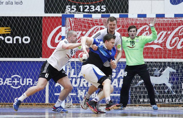 Umfjöllun, viðtöl og myndir: Fram - FH 25-28 | Endurkoma Kristjáns skilaði sigri Kristinn Páll Teitsson skrifar 20. mars 2014 17:15 Vísir/Andri Marinó FH hélt vonum sínum um sæti í úrslitakeppninni lifandi með 28-25 sigri á Fram í Olís deild karla í kvöld. Aðeins einu stigi munar á liðunum eftir leiki kvöldsins þegar þrír leikir eru eftir af deildarkeppninni.Kristjáni Arasyni var bætt í þjálfarateymi FH fyrir leikinn og skilaði það tilætluðum árangri eftir misjafnt gengi FH-inga síðustu vikur. FH-ingar vissu fyrir leikinn að allt annað en sigur myndi ganga langt með að gera út um vonir þeirra um sæti í úrslitakeppninni. Fram sat fyrir leiki kvöldsins í fjórða og síðasta sætinu sem tryggir sæti í úrslitakeppninni, tveimur stigum fyrir ofan ÍR í fimmta sæti Olís-deildarinnar og þremur stigum fyrir ofan FH. Pressan virtist gera gestunum úr Hafnafirði gott því þeir komu mun grimmari til leiks og höfðu undirtökin í fyrri hálfleik. Ágúst Elí Björgvinsson stóð vakt sína vel í markinu og náðu FH-ingar um miðbik hálfleiksins fimm marka forskoti í stöðunni 10-5. Við það vöknuðu heimamenn sem minnkuðu jafnt og þétt muninn út fyrri hálfleikinn. Ólafur Jóhann Magnússon, leikmaður Fram, átti góða rispu á lokamínútum fyrri hálfleiks þegar hann skoraði þrjú mörk á stuttum tíma og minnkaði muninn í tvö mörk, 15-13 áður en liðin héldu inn í búningsklefana. Það sama var upp á teningunum í upphafi seinni hálfleik, FH-ingar settu fótinn á bensíngjöfina og juku á forskot sitt þegar leið á hálfleikinn og náðu mest sex marka forskoti. Heimamenn gerðu skyndilega atlögu að forskoti FH-inga á lokamínútum leiksins þegar þeir minnkuðu muninn niður í tvö mörk þegar mínúta var til leiksloka. Lengra komust þeir hinsvegar ekki og unnu Hafnfirðingar að lokum mikilvægan sigur. Með sigrinum skaust FH upp fyrir ÍR í fimmta sæti Olís deildar karla, einu stigi á eftir Fram þegar þrír leikir eru eftir af mótinu. Það er ljóst að það verður spenna fram á lokametrana í baráttunni um sæti í úrslitakeppninni og gætu úrslitin jafnvel ráðist í lokaumferðinni þegar FH mætir ÍR á sama tíma og Fram mætir Val.Ragnar Jóhannsson var atkvæðamestur í liði gestanna með sjö mörk en í liði Fram voru Elías Bóasson og Garðar B Sigurjónsson með fimm mörk hvor. Það verður einnig að hrósa Ágústi Elí í marki FH sem varði oft á mikilvægum stundum og gaf FH-ingum byr undir báða vængi. Einar Andri: Krafa um árangur í KaplakrikaVísir/Andri Marinó„Þetta var hörku leikur, við vorum flottir í 50 mínútur en gleymum okkur á loka mínútunum í báðum hálfleikjum. Þetta var sem betur fer ekkert sem við þurftum að hafa stórkostlegar áhyggjur af,“ sagði Einar Andri Einarsson, þjálfari FH, sáttur eftir leikinn. Þegar fimm mínútur voru eftir leit allt út fyrir öruggan sigur FH-inga en heimamenn gáfust ekki upp fyrr en lokaflautið gall. „Við vorum sem betur fer með gott forskot að himinn og jörð hefðu þurft að hrynja til þess að við myndum tapa þessu niður. Við skulum segja að þetta hafi verið öruggt allan tímann,“ Ágúst Elí Björgvinsson átti góðan leik í marki FH og varði oft dauðafæri Framara á mikilvægum stundum. „Hann er náttúrulega gríðarlegt efni, það má ekki gleymast að hann er fæddur árið 1995 og er held ég ekki orðinn 19 ára. Hann á mikið ólært en hann er frábær markmaður sem hefur brugðist vel við að vera hent út í djúpu laugina. Hann og Sigurður þurftu smá tíma að taka við keflinu eftir áramót en ég vissi að þeir myndu standa sig vel saman,“ Einar átti ekki í erfiðleikum með að gíra menn upp fyrir leikinn enda hefði leikurinn tapast væru líkur liðsins á sæti í úrslitakeppninni nánast úr sögunni. „Strákarnir hafa lagt mikið á sig í vetur og þeir mæta tilbúnir í alla leiki. Við vorum með háleit markmið og förum eftir þeim þótt að úrslitin hafi ekki dottið með okkur að undanförnu. Það þurfti ekkert að minna strákana á neitt fyrir þennan leik, þeir vissu hvað var undir og þeir vilja komast í úrslitakeppnina eins og allir FH-ingar. Það er gerð krafa um árangur í FH sama hvaða íþrótta er horft til og strákarnir vita það,“ Þegar þrír leikir eru eftir af mótinu eru FH-ingar einu stigi á eftir Fram í fjórða sæti. „Við verðum að horfa á einn leik í einu og vonast til að Fram tapi stigum. Ef þeir klára sína leiki fara þeir í úrslitakeppnina en við munum reyna að setja pressu á þá,“ Kristján Arason var mættur aftur á hliðarlínuna en hann mun aðstoða Einar Andra það sem eftir lifir tímabilsins. Einar var ekki tilbúinn að kalla hann lukkutröll þegar blaðamaður bar það undir hann en var ánægður með viðbótina. „Hann er auðvitað frábær viðbót sem við þekkjum vel. Ég og Elvar höfum unnið með honum áður svo við vissum hvað við værum að fá inn með því að fá hann til liðs við okkur. Metnaðurinn í Kaplakrika er mikill og við vorum ekki ánægðir með stöðuna. Við vorum ánægðir að fá hann til liðs við okkur og erum bjartsýnir á framhaldið,“ Guðlaugur: Þetta er í okkar höndumVísir/Andri Marinó„Í heildina vorum þeir betri en við í dag, við áttum í erfiðleikum með varnarleikinn allan leikinn í dag,“ sagði Guðlaugur Arnarson, þjálfari Fram við blaðamann Vísis eftir leikinn. „Við látum þá opna varnarleikinn og það var of langt á milli manna í varnarleiknum í dag og við lendum í vandræðum. Við áttum í erfiðleikum með að þurfa að vinna upp muninn hérna í dag,“ Guðlaugur viðurkenndi að hafa hugsað til fyrsta leik liðanna á tímabilinu í upphafi leiks. Líkt og í þeim leik áttu leikmenn Fram erfitt í upphafi leiks í kvöl