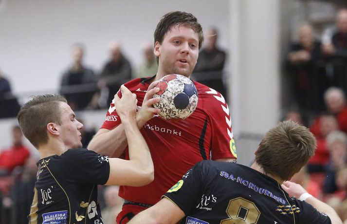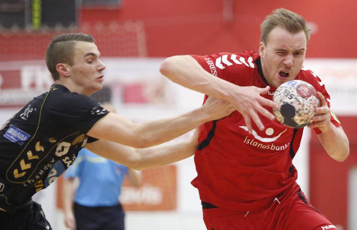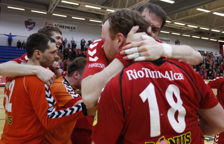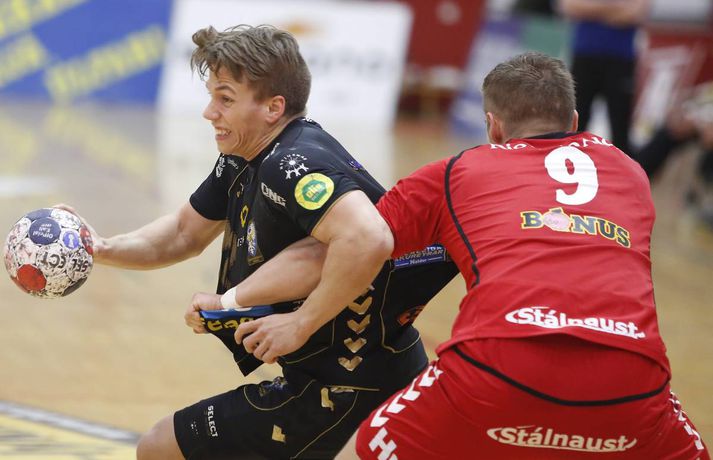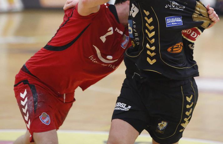 Haukar tryggðu sér deildarmeistaratitilinn í Olís deild karla í handbolta í kvöld þegar liðið rétt náði jafntefli 21-21 gegn Akureyri á heimavelli. Elías Már Halldórsson jafnaði metin átta sekúndum fyrir leikslok. Stigið gæti einnig reynst Akureyri dýrmætt því liðið getur komist hjá umspili vinni liðið HK á heimavelli í síðustu umferðinni og FH vinni ÍR á sama tíma í leik sem skiptir miklu máli því FH á enn möguleika á sæti í úrslitakeppninni. Leikurinn í Schenker höllinni að Ásvöllum verður ekki minnst fyrir skemmtileg tilþrif eða fallegan handbolta. Leikurinn var allt annað en fallegur á að horfa nema mögulega fyrir þá sem vilja aðeins sjá góðan varnarleik. Haukar náðu sér aldrei á strik í sókninni og virkuðu hálf máttlausir nánast allan leikinn sóknarlega. Vörn Akureyri var góð og Jovan Kukobat öflugur í markinu. Vörn Hauka var sterk gegn vængbrotnum og slökum sóknarleik gestanna en markverðir liðsins náðu sér engan vegin á strik eins og fjögur skot varin gefa til kynna. Valþór Atli Guðrúnarson meiddist fyrir leikinn og munaði mikið um hann í sókn Akureyrar. Adam Haukur Baumruk var einnig meiddur og söknuðu Haukar hans einnig, sérstaklega þar sem Sigurbergur Sveinsson náði sér ekki á strik. Þrátt fyrir litla markvörslu og lélega sókn voru Haukar með leikinn í hendi sér þegar tíu mínútur voru til leikslok. Liðið var þremur mörkum yfir og fátt sem benti til annars en að liðið myndi tryggja sér deildarmeistarartitilinn með sigri. Akureyri lék þá sinn besta leikkafla síðustu tíu mínúturnar og komst yfir þegar þrjár mínútur voru eftir. Haukar skoruðu eina markið til viðbótar í leiknum og dugði það liðinu til að landa deildarmeistaratitlinum og komast hjá hreinum úrslitaleik gegn ÍBV í lokaumferðinni. Elías: Lélegur leikur af okkar hálfu„Fyrst þessi leikur þurfti að vera svona var ágætt að tryggja þetta með svona marki en þessi leikur var alls ekki nógu góður, það verður að viðurkennast,“ sagði Elías Már Halldórsson sem tryggði Haukum deildarmeistaratitilinn með síðasta marki leiksins í kvöld. „Við æfðum mjög vel vikunni og það var hrikalega gott tempó þannig að þetta kom mér mjög á óvart. Við létum hann verja svaðalega frá okkur í byrjun og vorum í vandræðum með að koma okkur í færi. „Þetta var ströggl allan tímann og Akureyri að berjast fyrir lífi sínu í deildinni. Þetta var bara lélegur leikur af okkar hálfu. „Varnarleikurinn hjá Akureyri var góður á meðan sóknin hjá okkur var léleg. Það er hættulegt í þessari deild. Við náðum aldrei takti,“ sagði Elías en samt voru Haukar í góðri stöðu þegar tíu mínútur voru eftir af leiknum. „Það er týpískt fyrir þennan leik. Svo missum við það út úr höndunum og þegar maður er að spila illa þá maður ekkert gott skilið. Við náðum samt að snúa þessu okkur í vil og klára þetta með jafntefli. „Mér fannst við spila á löngum köflum ágætis vörn en fáum fáa bolta varða og erum í vandræðum í sókninni. Við fáum eiginlega engin hraðaupphlaup og það er ekki góð uppskrift að sigri. „Við þurfum að spila betur en þetta. Við erum ekkert það góðir að við getum komið 40% og unnið leikina þannig. Það er ekki hægt. Við þurfum að spila á 100 ef við ætlum að klára þessa leiki,“ sagði Elías Már. Heimir Örn: Frábær vörn í síðustu leikjum„Við spiluðum það góða vörn að þetta leit mjög ljótt út fyrir þá, það er ekki spurning,“ sagði Heimir Örn Árnason þjálfari Akureyrar eftir leikinn í kvöld. „Sóknarleikurinn okkar var erfiður. Við erum búnir að missa marga menn út en ég var mjög ánægður með lokakaflann hjá t.d. Sissa (Sigþóri Heimissyni) og Jóni Heiðari (Sigurðssyni). Þeir stigu flott upp. „Varnarleikurinn var frábær allan tímann og menn börðust eins og ljón. „Það er hræðilegt að klára ekki þennan leik. Við vorum með þetta í höndunum í lokin en stigið var mikilvægt. Við erum búnir að spila svona vörn í síðustu þremur, fjórum leikjum fyrir utan þennan bíbb hálfleik gegn Fram,“ sagði Heimir en Akureyri þarf að vinna HK í síðustu umferðinni á mánudag og treysta á að FH leggi ÍR að velli á sama tíma til að forðast umspil um sæti í deildinni á næsta tímabili. „HK er sýnd veiði en ekki gefin og hefur spilað vel í síðustu leikjum en ef menn mæta klárir þá eigum við að klára svoleiðis leik. „Það verður fullur fókus fyrir þann leik á mánudaginn og svo treystum við á okkar menn í Hafnarfirðinum að spila eins og menn. Þá náum við vonandi ÍR-ingum. „Það er hrikalega gott að ná þremur stigum úr Hafnarfirðinum í þessum tveimur skemmtilegu bílferðum. Þá erum við hrikalega sáttir. Ég er greinilega svona góður bílstjóri, er búinn að keyra fram og til baka. „Við vissum að Haukar myndu mæta af fullum krafti. Þeir eru alltaf sterkir varnarlega en detta niður á lágt plan sóknarlega. Við vissum það. „Serbneski markmaðurinn okkar var flottur (Jovan Kukobat). Hann varði eins og skepna. Ekta Serbi að verja aðeins í lokin. Ég er mjög ánægður með hann. Hann er búinn að vera mjög góður í allan vetur,“ sagði Heimir. Árni Steinn: Súrsæt tilfinning„Þetta var athyglisvert. Það var hálfgerð deyfð yfir þessu sem er ótrúlegt í hálfgerðum úrslitaleik fyrir okkur,“ sagði Árni Steinn Steinþórsson hægri skytta Hauka. „Við settum þetta upp sem úrslitaleik en náðum samt aldrei að kreysta út þessa baráttu og kraft sem hefur einkennt okkur í vetur, sérstaklega sóknarlega. „Við vorum hægir og ragir og þetta var alls ekki nógu gott fyrir framan allt þetta fólk. Þetta er súrsæt tilfinning. En við tökum deildarmeistarat