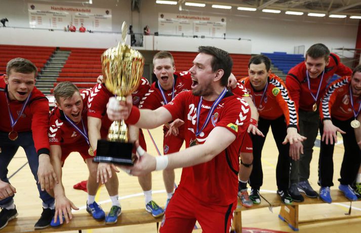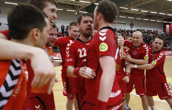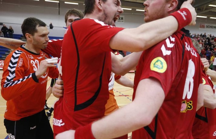 Umfjöllun, viðtöl og myndir: Haukar - Akureyri 21-21 | Haukar eru deildarmeistarar Guðmundur Marinó Ingvarsson á Ásvöllum skrifar 10. apríl 2014 12:03 Matthías Árni Ingimarsson lyftir bikarnum í kvöld. Vísir/valli Haukar tryggðu sér deildarmeistaratitilinn í Olís deild karla í handbolta í kvöld þegar liðið rétt náði jafntefli 21-21 gegn Akureyri á heimavelli. Elías Már Halldórsson jafnaði metin átta sekúndum fyrir leikslok. Stigið gæti einnig reynst Akureyri dýrmætt því liðið getur komist hjá umspili vinni liðið HK á heimavelli í síðustu umferðinni og FH vinni ÍR á sama tíma í leik sem skiptir miklu máli því FH á enn möguleika á sæti í úrslitakeppninni. Leikurinn í Schenker höllinni að Ásvöllum verður ekki minnst fyrir skemmtileg tilþrif eða fallegan handbolta. Leikurinn var allt annað en fallegur á að horfa nema mögulega fyrir þá sem vilja aðeins sjá góðan varnarleik. Haukar náðu sér aldrei á strik í sókninni og virkuðu hálf máttlausir nánast allan leikinn sóknarlega. Vörn Akureyri var góð og Jovan Kukobat öflugur í markinu. Vörn Hauka var sterk gegn vængbrotnum og slökum sóknarleik gestanna en markverðir liðsins náðu sér engan vegin á strik eins og fjögur skot varin gefa til kynna. Valþór Atli Guðrúnarson meiddist fyrir leikinn og munaði mikið um hann í sókn Akureyrar. Adam Haukur Baumruk var einnig meiddur og söknuðu Haukar hans einnig, sérstaklega þar sem Sigurbergur Sveinsson náði sér ekki á strik. Þrátt fyrir litla markvörslu og lélega sókn voru Haukar með leikinn í hendi sér þegar tíu mínútur voru til leikslok. Liðið var þremur mörkum yfir og fátt sem benti til annars en að liðið myndi tryggja sér deildarmeistarartitilinn með sigri. Akureyri lék þá sinn besta leikkafla síðustu tíu mínúturnar og komst yfir þegar þrjár mínútur voru eftir. Haukar skoruðu eina markið til viðbótar í leiknum og dugði það liðinu til að landa deildarmeistaratitlinum og komast hjá hreinum úrslitaleik gegn ÍBV í lokaumferðinni. Elías: Lélegur leikur af okkar hálfu„Fyrst þessi leikur þurfti að vera svona var ágætt að tryggja þetta með svona marki en þessi leikur var alls ekki nógu góður, það verður að viðurkennast,“ sagði Elías Már Halldórsson sem tryggði Haukum deildarmeistaratitilinn með síðasta marki leiksins í kvöld. „Við æfðum mjög vel vikunni og það var hrikalega gott tempó þannig að þetta kom mér mjög á óvart. Við létum hann verja svaðalega frá okkur í byrjun og vorum í vandræðum með að koma okkur í færi. „Þetta var ströggl allan tímann og Akureyri að berjast fyrir lífi sínu í deildinni. Þetta var bara lélegur leikur af okkar hálfu. „Varnarleikurinn hjá Akureyri var góður á meðan sóknin hjá okkur var léleg. Það er hættulegt í þessari deild. Við náðum aldrei takti,“ sagði Elías en samt voru Haukar í góðri stöðu þegar tíu mínútur voru eftir af leiknum. „Það er týpískt fyrir þennan leik. Svo missum við það út úr höndunum og þegar maður er að spila illa þá maður ekkert gott skilið. Við náðum samt að snúa þessu okkur í vil og klára þetta með jafntefli. „Mér fannst við spila á löngum köflum ágætis vörn en fáum fáa bolta varða og erum í vandræðum í sókninni. Við fáum eiginlega engin hraðaupphlaup og það er ekki góð uppskrift að sigri. „Við þurfum að spila betur en þetta. Við erum ekkert það góðir að við getum komið 40% og unnið leikina þannig. Það er ekki hægt. Við þurfum að spila á 100 ef við ætlum að klára þessa leiki,“ sagði Elías Már. Heimir Örn: Frábær vörn í síðustu leikjum„Við spiluðum það góða vörn að þetta leit mjög ljótt út fyrir þá, það er ekki spurning,“ sagði Heimir Örn Árnason þjálfari Akureyrar eftir leikinn í kvöld. „Sóknarleikurinn okkar var erfiður. Við erum búnir að missa marga menn út en ég var mjög ánægður með lokakaflann hjá t.d. Sissa (Sigþóri Heimissyni) og Jóni Heiðari (Sigurðssyni). Þeir stigu flott upp. „Varnarleikurinn var frábær allan tímann og menn börðust eins og ljón. „Það er hræðilegt að klára ekki þennan leik. Við vorum með þetta í höndunum í lokin en stigið var mikilvægt. Við erum búnir að spila svona vörn í síðustu þremur, fjórum leikjum fyrir utan þennan bíbb hálfleik gegn Fram,“ sagði Heimir en Akureyri þarf að vinna HK í síðustu umferðinni á mánudag og treysta á að FH leggi ÍR að velli á sama tíma til að forðast umspil um sæti í deildinni á næsta tímabili. „HK er sýnd veiði en ekki gefin og hefur spilað vel í síðustu leikjum en ef menn mæta klárir þá eigum við að klára svoleiðis leik. „Það verður fullur fókus fyrir þann leik á mánudaginn og svo treystum við á okkar menn í Hafnarfirðinum að spila eins og menn. Þá náum við vonandi ÍR-ingum. „Það er hrikalega gott að ná þremur stigum úr Hafnarfirðinum í þessum tveimur skemmtilegu bílferðum. Þá erum við hrikalega sáttir. Ég er greinilega svona góður bílstjóri, er búinn að keyra fram og til baka. „Við vissum að Haukar myndu mæta af fullum krafti. Þeir eru alltaf sterkir varnarlega en detta niður á lágt plan sóknarlega. Við vissum það. „Serbneski markmaðurinn okkar var flottur (Jovan Kukobat). Hann varði eins og skepna. Ekta Serbi að verja aðeins í lokin. Ég er mjög ánægður með hann. Hann er búinn að vera mjög góður í allan vetur,“ sagði Heimir. Árni Steinn: Súrsæt tilfinning„Þetta var athyglisvert. Það var hálfgerð deyfð yfir þessu sem er ótrúlegt í hálfgerðum úrslitaleik fyrir okkur,“ sagði Árni Steinn Steinþórsson hægri skytta Hauka. „Við settum þetta upp sem úrslitaleik en náðum samt aldrei að kreysta út þessa baráttu o