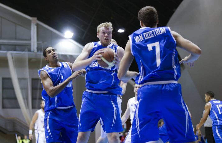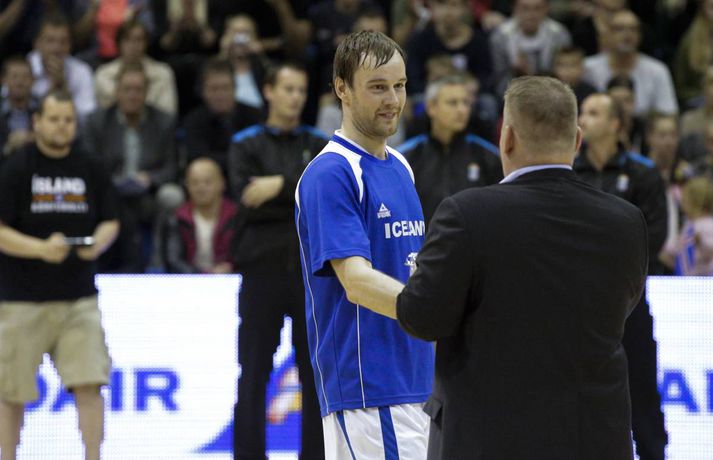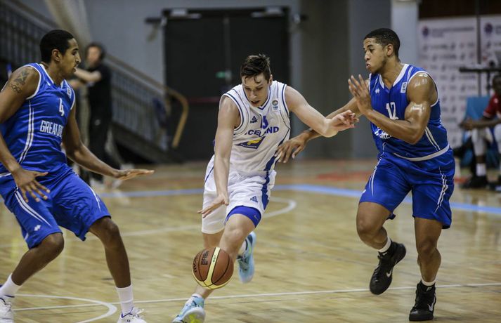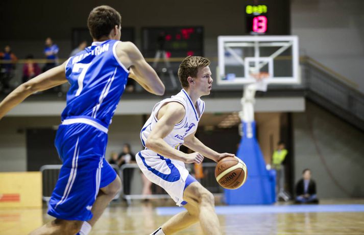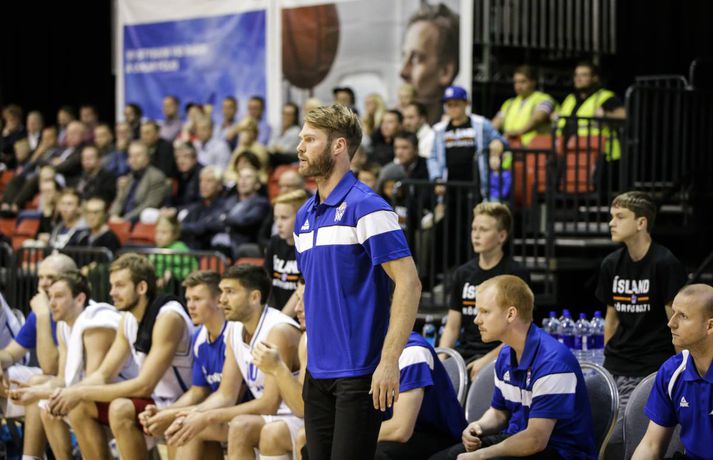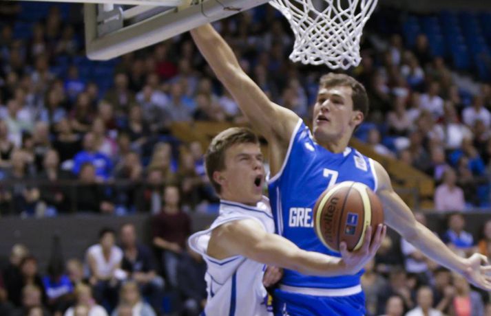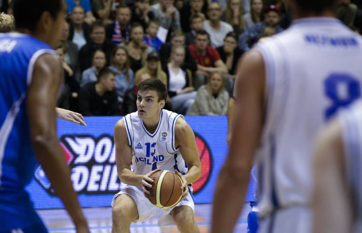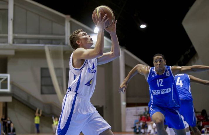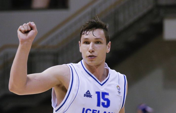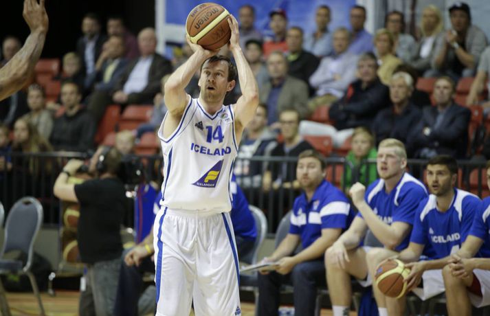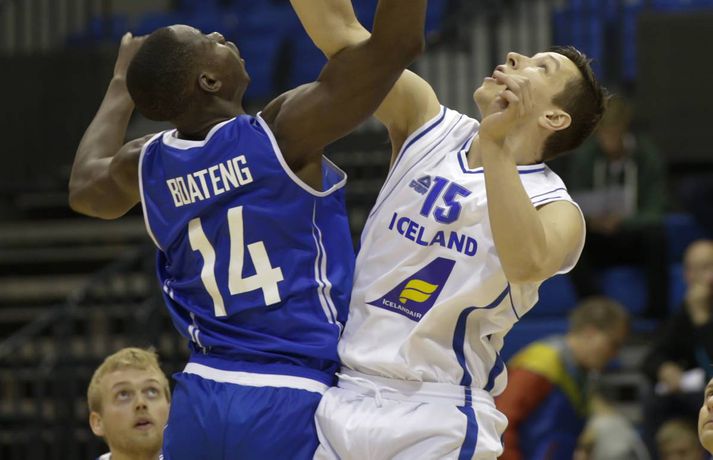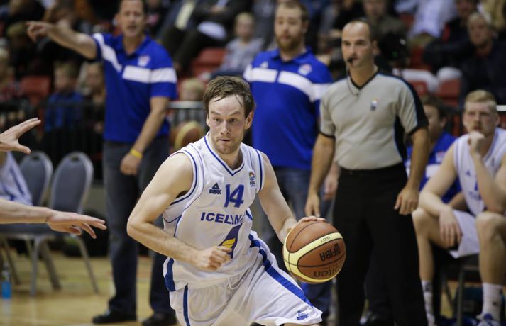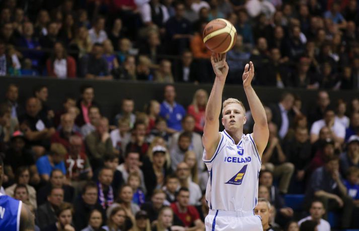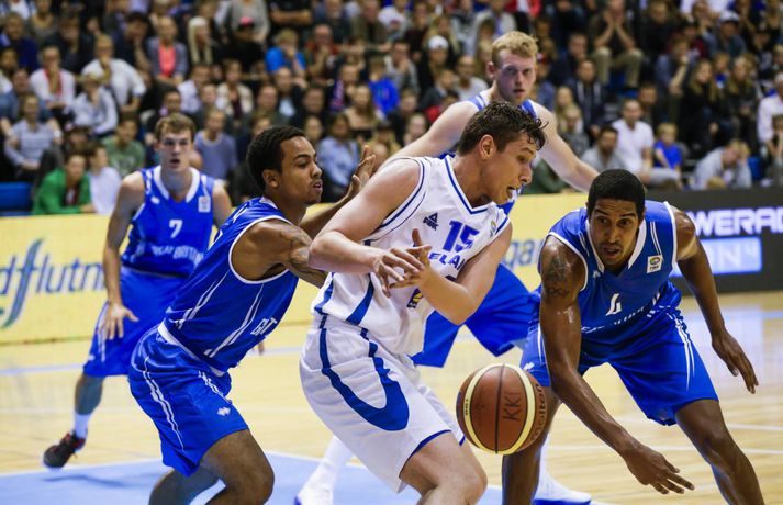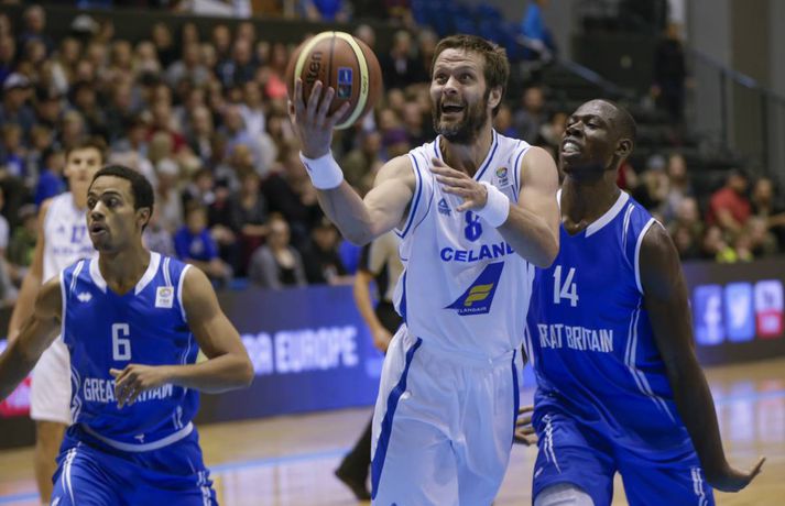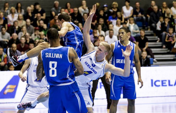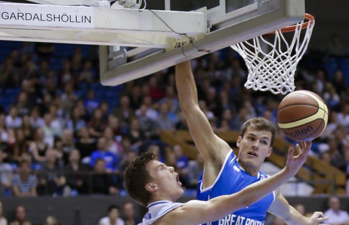 Umfjöllun, viðtöl og myndir: Ísland - Bretland 83-70 | Martin og Haukur Helgi drógu vagninn Ingvi Þór Sæmundsson í Höllinni skrifar 10. ágúst 2014 12:30 Haukur Helgi Pálsson skorar tvö stig á móti Bretum í kvöld. vísir/vilhelm Grasið er grænt, himininn er blár og Martin Hermannsson er góður í körfubolta. Þetta eru staðreyndir lífsins. Það var mikið áfall að missa Jón Arnór Stefánsson, fánabera landsliðsins til margra ára, út, en með samstilltu átaki, (lengst af) góðum varnarleik, áræðni í sóknarleiknum og frábærri frammistöðu frá ungu mönnunum, Martin og Hauki Helga Pálssyni, hafðist 13 stiga sigur á Bretlandi í fyrsta leik A-riðils í undankeppni EM 2015. Íslendingar mættu ákveðnir til leiks; varnarleikurinn var frábær og Haukur fór fyrir sóknarleiknum, en hann skoraði sjö stig í fyrsta leikhluta. Íslendingar náðu mest 16 stiga forystu, 20-4, þegar 1:30 mínúta var eftir af fyrsta leikhluta. Bretar náðu að laga stöðuna aðeins, en þegar leikhlutinn var allur leiddi Ísland með tólf stigum, 22-10.Martin Hermannsson var frábær í leiknum.vísir/vilhelmBretar komu sterkir til leiks í öðrum leikhluta og þeir fóru að saxa á forskot Íslands. Gestirnir breyttu stöðunni úr 24-12 í 24-20 og þeir náðu loks að jafna leikinn, 31-31, þegar 1:30 mínúta var eftir af fyrri hálfleik.Hlynur Bæringsson kom Íslandi aftur yfir, 34-31, en Daniel Clark sá til þess að staðan væri jöfn í leikhléi þegar hann setti niður þriggja stiga skot í þann mund sem leikklukkan gall. Clark var stigahæstur Breta í fyrri hálfleik með 13 stig, auk þess sem hann tók sex fráköst. Haukur var stigahæstur Íslendinga með níu stig, en Logi Gunnarsson kom næstur með sjö stig. Þá skoraði Hlynur sex stig í fyrri hálfleik og tók níu fráköst. Bretarnir voru áfram með undirtökin í upphafi seinni hálfleiks. Sóknarleikur íslenska liðsins var stirður og gestirnir gengu á lagið. Þeir komust í fyrsta skipti yfir, 34-37, í upphafi seinni hálfleiks og þeir leiddu með sex stigum, 43-49, þegar 03:47 voru eftir af þriðja leikhluta.Jón Arnór Stefánsson var líflegur á hliðarlínunni.vísir/vilhelmEn þá sögðu Íslendingar hingað og ekki lengra. Það rann æði á Martin og Hauk og þeir skoruðu hverja körfuna á fætur annarri. Um leið opnaðist fyrir samherja þeirra og Íslendingar keyrðu upp hraðann. Hlynur kom Íslandi yfir, 59-58, með síðasta stigi þriðja leikhluta og Ísland hélt uppteknum hætti í lokaleikhlutanum. Íslendingar juku muninn jafnt og þétt og um miðjan fjórða leikhluta var munurinn kominn í tveggja stafa tölu. Vörnin var frábær á þessum tíma og Bretarnir áttu engin svör. Íslendingar náðu mest 18 stiga forystu, 81-63, en gestirnir frá Bretlandi náðu að laga stöðuna aðeins fyrir leikslok. Lokatölur 83-70, Íslandi í vil. Sigurinn var gríðarlega mikilvægur upp á framhaldið í riðlinum að gera og gefur leikmönnum íslenska liðsins eflaust mikið sjálfstraust fyrir næstu leiki. Haukur og Martin áttu báðir frábæran leik. Haukur skoraði 24 stig, tók níu fráköst, gaf fjórar stoðsendingar og stal þremur boltum. Martin skoraði 22 stig, en hann var gríðarlega mikilvægur á þeim kafla þegar íslenska liðið var að koma sér inn í leikinn á ný. Þá skal framlag Hlyns og Pavels Ermolinskij ekki vanmetið, en þeir áttu báðir afbragðs leik. Hlynur skoraði 14 stig, tók 15 fráköst og spilaði frábæra vörn. Pavel hitti ekki vel (23,1%), en hann gaf 14 stoðsendingar og stjórnaði sóknarleik íslenska liðsins af mikilli festu. Clark var atkvæðamestur í liði Breta með 20 stig og átta fráköst. Kieron Achara kom næstur með 16 stig. Ísland mætir Bosníu í öðrum leik sínum í riðlinum 17. ágúst næstkomandi.Hörður Axel Vilhjálmsson í sókn fyrir Ísland í kvöld.vísir/vilhelmArnar: Þeir eru góðir í körfubolta Arnar Guðjónsson, aðstoðarþjálfari Íslands, var að vonum sáttur eftir 13 stiga sigur á Bretlandi í Laugardalshöllinni í kvöld. Leikurinn var mjög sveiflukenndur, en hvernig fannst Arnari íslenska liðið spila? „Við hægðum aðeins of mikið á leiknum í öðrum leikhluta. Það gerði það að verkum að við klúðruðum nokkrum hraðaupphlaupum sem hleypti þeim aftur inn í leikinn. „Það var mjög dýrkeypt. Þegar við náðum tempóinu aftur upp í seinni hálfleik, þá leit þetta ágætlega út,“ sagði Arnar, en byrjunin á seinni hálfleik var Íslendingum erfið. „Byrjunin reyndist okkur strembin, en við breyttum áherslunum í sóknarleiknum um miðjan þriðja leikhluta og fórum að fórum að sækja meira á (Daniel) Clark og við það opnaðist völlurinn og við fengum auðveldari skot.“ Martin Hermannsson og Haukur Helgi Pálsson áttu báðir stórleik í kvöld. Hvað hafði Arnar um þeirra frammistöðu að segja? „Þeir eru góðir í körfubolta. Haukur var stórkostlegur í Evrópukeppninni í fyrra og allir Íslendingar vitu hversu megnugur Martin er. „Það er svo gaman að horfa á hann spila, því hann er svo öðruvísi leikmaður en flestir. Hann hefur stefnu- og hraðabreytingar sem unun er að horfa á,“ sagði Arnar og bætti við: „Þetta var lífsnauðsynlegur sigur upp á framhaldið að gera. Nú þurfum við að sigra Breta ytra og ef það gengur eftir er það vonandi EM sem bíður okkar.“Martin: Bjóst ekki við að skora svona mikið Martin Hermannsson var að vonum hæstánægður þegar blaðamaður Vísis náði af honum tali eftir sigurinn á Bretlandi í kvöld. „Sigurinn er hrikalega mikilvægur upp á framhaldið að gera. Þetta var akkúrat það sem við þurftum og við höfðum trú á þessu allan tímann,“ sagði Martin sem átti frábæran leik í kvöld. Hann skoraði 22 stig og átti hvað stærstan þátt í því að íslenska liðinu tókst að sn