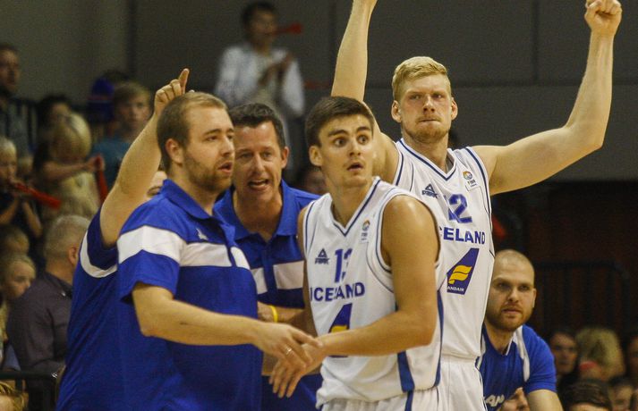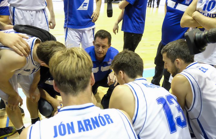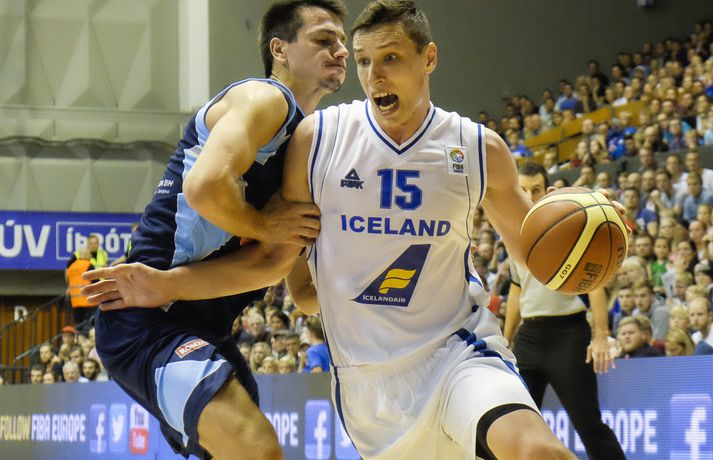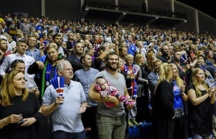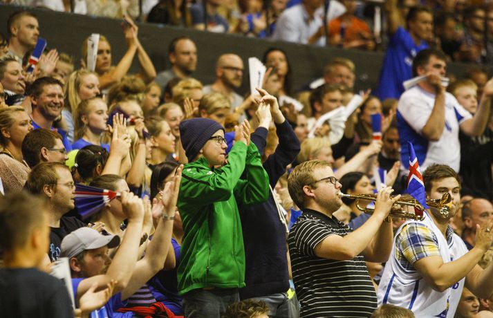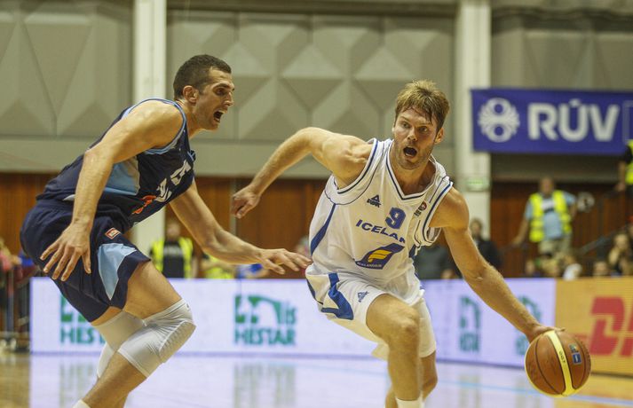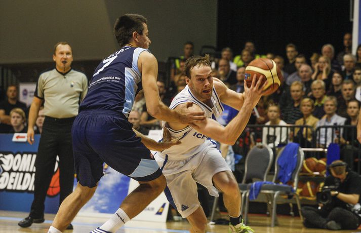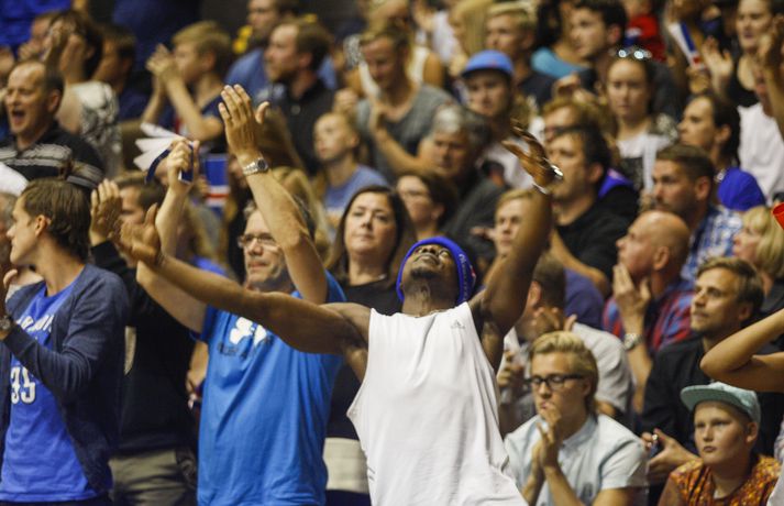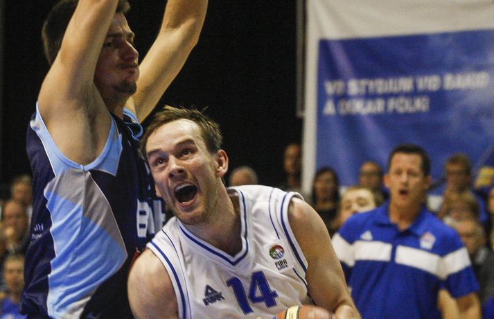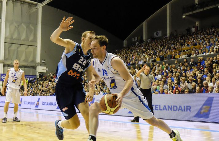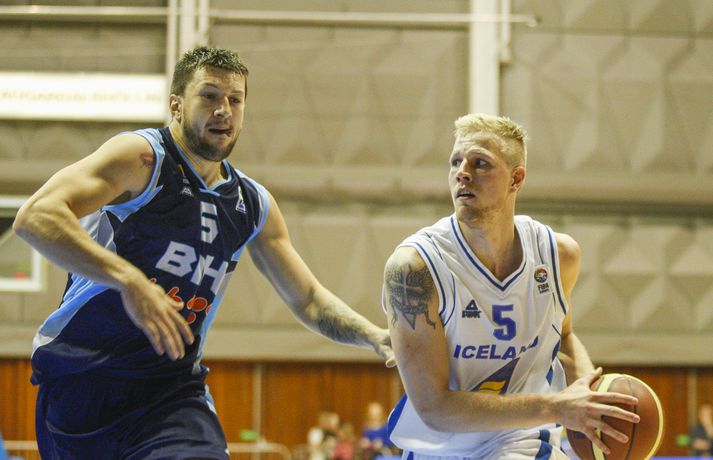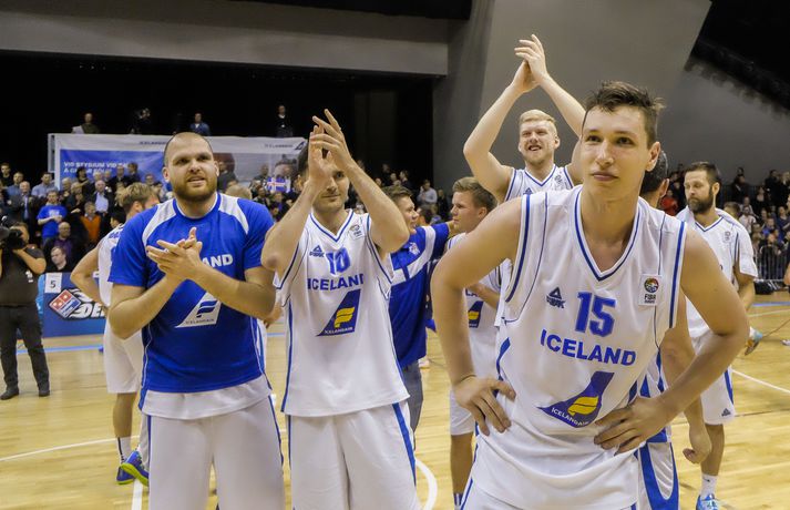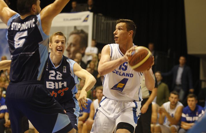 Umfjöllun, myndir og viðtöl: Ísland - Bosnía 70-78 | Ísland í fyrsta sinn á EM! Guðmundur Marinó Ingvarsson í Laugardalshöllinni skrifar 27. ágúst 2014 17:29 Leikmenn íslenska liðsins þökkuðu stuðninginn að leik loknum. Vísir/Anton Ísland er komið á Evrópumeistarmótið í körfuknattleik karla í fyrsta sinn þrátt fyrir 78-70 tap gegn Bosníu í Laugardalshöllinni í kvöld. Ísland hafnar í öðru sæti A-riðils. Það sást glögglega á íslenska liðinu í byrjun hversu mikið var í húfi. Spennustigið var allt of hátt og í raun aðeins Jón Arnór Stefánsson sem kom rétt stilltur inn í leikinn en hann skoraði 12 fyrstu stig Íslands. Bosnía hafði yfirhöndina í fyrsta leikhluta en strax í upphafi annars leikhluta voru íslensku strákarnir komnir niður á jörðina og sýndu hvað býr í liðinu.Hlynur Bæringsson var greinilega ekki heill heilsu og var í bullandi villuvandræðum en það kom ekki að sök því hver leikmaðurinn af fætur öðrum steig upp og þá ekki síst í varnarleiknum sem var frábær. Gríðarleg barátta skilaði því að Ísland var yfir í hálfleik 47-43. Sóknarleikurinn í öðrum leikhluta var stórbrotinn en segja má að nánast allt hafi gengið upp. Leikurinn var í járnum allan þriðja leikhluta og gríðarlega hart barist og lítið skorað. Baráttan á kostnað sóknarleiksins hélt áfram í fjórða leikhluta en Bosnía hafði náð að jafna 58-58 fyrir fjórða leikhluta. Bosnía komst yfir í fyrsta sinn í langan tíma þegar sex mínútur voru eftir af leiknum og íslenska liðið virtist hreinlega bensínlaust eftir hetjulega baráttu og frábæran leik. Ísland skoraði ekki í fjórar mínútur og Bosnía náði átta stiga forystu áður en Hörður Axel Vilhjálmsson fann leiðina í körfuna. Ísland náði að minnka muninn í fjögur stig en nær komst liðið ekki. Það kom þó ekki að sök því liðið hafnar í öðru sæti A-riðils sem dugar liðinu að komast á EM í fyrsta sinn. Frábær árangur hjá íslenska liðinu sem er búið að sýna að það getur staðið í frábærum liðum þó það hafi vantað herslumuninn í kvöld. Jón Arnór Stefánsson var frábær hjá íslenska liðinu og skoraði 21 stig. Hörður Axel Vilhjálmsson skoraði 12 stig og Logi Gunnarsson, Pavel Ermolinskij og Haukur Helgi Pálsson 9 en Haukur tók auk þess 9 fráköst.Jón Arnór Stefánsson: Adrenalínið var bara búið „Við erum að brjóta blað í íslenskri körfuboltasögu. Það verður seint toppað. Þetta er hátindurinn á ferlinum og gera það fyrir framan okkar fólk þrátt fyrir tap. Engu að síður var þetta mjög góður leikur heilt yfir,“ sagði Jón Arnór Stefánsson sem var frábær í íslenska liðinu þó dregið hafi af honum í seinni hálfleik. „Höllin var full. Fólkið svaraði kallinu. Ég vil þakka stuðninginn. Þetta var æðislegt og frábær upplifun að spila fyrir framan fulla höll. „Körfuboltinn var ekkert rosalega góður, í seinni hálfleik aðallega en ég held að þetta hafi verið mikil skemmtun. Ég held að fólk hafi séð okkur leggja sig fram til að vinna leikinn. Það skein held ég úr augunum á okkur,“ sagði Jón sem lék tvo síðustu leiki Íslands í undankeppninni eftir að hafa misst af tveimur fyrstu leikjunum þar sem hann er án samnings og vildi ekki taka áhættuna á að meiðast. „Það kom kannski í ljós æfingaleysið á mér. Ég var ekki búinn að spila neitt og adrenalínið var bara búið. Ég var þungur og lélegur í seinni hálfleik en þá fengum við körfur frá öðrum. Við náðum að hanga í þeim og hleyptum þeim aldrei langt frá okkur.“ Jón Arnór fór á kostum í byrjun leiksins og hélt íslenska liðinu hreinlega inni í leiknum á meðan aðrir leikmenn áttuðu sig á aðstæðum. „Ég var rétt stilltur í byrjun. Ég er búinn að æfa með Gunnari Einarssyni í Keflavík. Hann er búinn að hjálpa mér rosalega mikið með réttum æfingum og ég er í nokkuð góðu standi miðað við æfingaleysi. „Ég er búinn að vera að taka skot líka og var rétt stemmdur. Ég er búinn að spila helling í huganum þó ég hafi ekki verið með í mikið af þessum æfingum og leikjum. Ég var klár í þetta í kvöld. „Ég rann í byrjun og fann fyrir mjöðminni og svo rann ég hinum megin og þá fann ég fyrir mjöðminni hinum megin. Leiðindadúkur svona sleipur en ég er góður. Ég var aðallega bara þreyttur í lokin,“ sagði Jón Arnór. Craig Pedersen: Andinn í hópnum lykillinn„Ég er virkilega ánægður. Ég er sérstaklega ánægður fyrir hönd leikmanna sem hafa lagt mikla vinnu í þetta í mörg ár. Ég kom inn í þetta fyrir fimm mánuðum og það er ótrúlegt að upplifa þetta með þeim,“ sagði Craig Pedersen þjálfari Íslands. „Ástæðan fyrir árangrinum er andinn í hópnum. Auðvitað eru miklir hæfileikar í hópnum en mörg lið sem leika ekki eins vel eiga kannski fleiri og hæfileikaríkari leikmenn en þau lið búa ekki yfir þeim anda sem er í íslenska liðinu. Þeir vinna líka vel og er klárir leikmenn," sagði Pedersen sem var mjög ánægður með hvernig aðrir leikmenn stigu upp þegar ljóst var að Hlynur Bæringsson gat ekki beitt sér sem skildi „Það var mjög mikilvægt að Hlynur var í búningi í dag því hann er hjartað og sálin í liðinu. Hann hefur unnið frábærlega fyrir liðið og var frákastahæsti leikmaðurinn í undankeppninni fyrir leikinn í kvöld. Það er ótrúlegt fyrir leikmenn upp á 2 metra. En aðrir leikmenn komu inn og stóðu sig frábærlega. „Alveg sama hvernig gengur á EM þá er frábær árangur fyrir svona litla þjóð að komast í úrslitakeppni Evrópumótsins. Líka fyrir þjóð sem er svona lágvaxin á vellinum,“ sagði Pedersen. Haukur Helgi: Hefðum unnið með Hlyn„Ég vildi óska þess að við hefðum unnið þetta. 