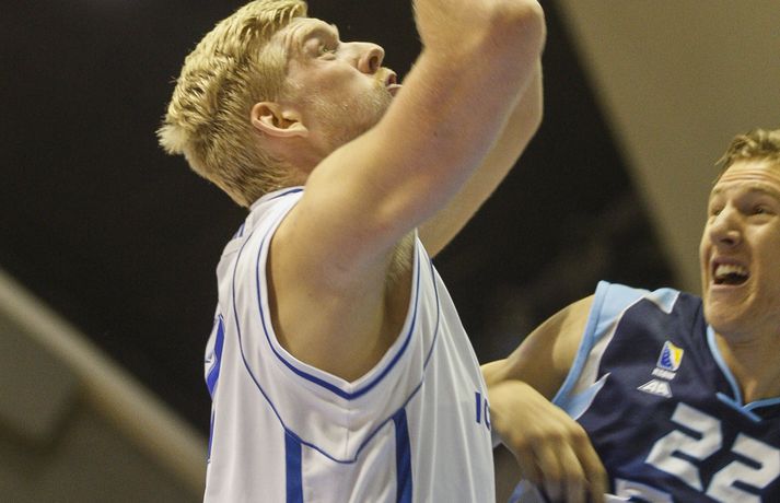 Ísland er komið á Evrópumeistarmótið í körfuknattleik karla í fyrsta sinn þrátt fyrir 78-70 tap gegn Bosníu í Laugardalshöllinni í kvöld. Ísland hafnar í öðru sæti A-riðils. Það sást glögglega á íslenska liðinu í byrjun hversu mikið var í húfi. Spennustigið var allt of hátt og í raun aðeins Jón Arnór Stefánsson sem kom rétt stilltur inn í leikinn en hann skoraði 12 fyrstu stig Íslands. Bosnía hafði yfirhöndina í fyrsta leikhluta en strax í upphafi annars leikhluta voru íslensku strákarnir komnir niður á jörðina og sýndu hvað býr í liðinu.Hlynur Bæringsson var greinilega ekki heill heilsu og var í bullandi villuvandræðum en það kom ekki að sök því hver leikmaðurinn af fætur öðrum steig upp og þá ekki síst í varnarleiknum sem var frábær. Gríðarleg barátta skilaði því að Ísland var yfir í hálfleik 47-43. Sóknarleikurinn í öðrum leikhluta var stórbrotinn en segja má að nánast allt hafi gengið upp. Leikurinn var í járnum allan þriðja leikhluta og gríðarlega hart barist og lítið skorað. Baráttan á kostnað sóknarleiksins hélt áfram í fjórða leikhluta en Bosnía hafði náð að jafna 58-58 fyrir fjórða leikhluta. Bosnía komst yfir í fyrsta sinn í langan tíma þegar sex mínútur voru eftir af leiknum og íslenska liðið virtist hreinlega bensínlaust eftir hetjulega baráttu og frábæran leik. Ísland skoraði ekki í fjórar mínútur og Bosnía náði átta stiga forystu áður en Hörður Axel Vilhjálmsson fann leiðina í körfuna. Ísland náði að minnka muninn í fjögur stig en nær komst liðið ekki. Það kom þó ekki að sök því liðið hafnar í öðru sæti A-riðils sem dugar liðinu að komast á EM í fyrsta sinn. Frábær árangur hjá íslenska liðinu sem er búið að sýna að það getur staðið í frábærum liðum þó það hafi vantað herslumuninn í kvöld. Jón Arnór Stefánsson var frábær hjá íslenska liðinu og skoraði 21 stig. Hörður Axel Vilhjálmsson skoraði 12 stig og Logi Gunnarsson, Pavel Ermolinskij og Haukur Helgi Pálsson 9 en Haukur tók auk þess 9 fráköst.Jón Arnór Stefánsson: Adrenalínið var bara búið „Við erum að brjóta blað í íslenskri körfuboltasögu. Það verður seint toppað. Þetta er hátindurinn á ferlinum og gera það fyrir framan okkar fólk þrátt fyrir tap. Engu að síður var þetta mjög góður leikur heilt yfir,“ sagði Jón Arnór Stefánsson sem var frábær í íslenska liðinu þó dregið hafi af honum í seinni hálfleik. „Höllin var full. Fólkið svaraði kallinu. Ég vil þakka stuðninginn. Þetta var æðislegt og frábær upplifun að spila fyrir framan fulla höll. „Körfuboltinn var ekkert rosalega góður, í seinni hálfleik aðallega en ég held að þetta hafi verið mikil skemmtun. Ég held að fólk hafi séð okkur leggja sig fram til að vinna leikinn. Það skein held ég úr augunum á okkur,“ sagði Jón sem lék tvo síðustu leiki Íslands í undankeppninni eftir að hafa misst af tveimur fyrstu leikjunum þar sem hann er án samnings og vildi ekki taka áhættuna á að meiðast. „Það kom kannski í ljós æfingaleysið á mér. Ég var ekki búinn að spila neitt og adrenalínið var bara búið. Ég var þungur og lélegur í seinni hálfleik en þá fengum við körfur frá öðrum. Við náðum að hanga í þeim og hleyptum þeim aldrei langt frá okkur.“ Jón Arnór fór á kostum í byrjun leiksins og hélt íslenska liðinu hreinlega inni í leiknum á meðan aðrir leikmenn áttuðu sig á aðstæðum. „Ég var rétt stilltur í byrjun. Ég er búinn að æfa með Gunnari Einarssyni í Keflavík. Hann er búinn að hjálpa mér rosalega mikið með réttum æfingum og ég er í nokkuð góðu standi miðað við æfingaleysi. „Ég er búinn að vera að taka skot líka og var rétt stemmdur. Ég er búinn að spila helling í huganum þó ég hafi ekki verið með í mikið af þessum æfingum og leikjum. Ég var klár í þetta í kvöld. „Ég rann í byrjun og fann fyrir mjöðminni og svo rann ég hinum megin og þá fann ég fyrir mjöðminni hinum megin. Leiðindadúkur svona sleipur en ég er góður. Ég var aðallega bara þreyttur í lokin,“ sagði Jón Arnór. Craig Pedersen: Andinn í hópnum lykillinn„Ég er virkilega ánægður. Ég er sérstaklega ánægður fyrir hönd leikmanna sem hafa lagt mikla vinnu í þetta í mörg ár. Ég kom inn í þetta fyrir fimm mánuðum og það er ótrúlegt að upplifa þetta með þeim,“ sagði Craig Pedersen þjálfari Íslands. „Ástæðan fyrir árangrinum er andinn í hópnum. Auðvitað eru miklir hæfileikar í hópnum en mörg lið sem leika ekki eins vel eiga kannski fleiri og hæfileikaríkari leikmenn en þau lið búa ekki yfir þeim anda sem er í íslenska liðinu. Þeir vinna líka vel og er klárir leikmenn," sagði Pedersen sem var mjög ánægður með hvernig aðrir leikmenn stigu upp þegar ljóst var að Hlynur Bæringsson gat ekki beitt sér sem skildi „Það var mjög mikilvægt að Hlynur var í búningi í dag því hann er hjartað og sálin í liðinu. Hann hefur unnið frábærlega fyrir liðið og var frákastahæsti leikmaðurinn í undankeppninni fyrir leikinn í kvöld. Það er ótrúlegt fyrir leikmenn upp á 2 metra. En aðrir leikmenn komu inn og stóðu sig frábærlega. „Alveg sama hvernig gengur á EM þá er frábær árangur fyrir svona litla þjóð að komast í úrslitakeppni Evrópumótsins. Líka fyrir þjóð sem er svona lágvaxin á vellinum,“ sagði Pedersen. Haukur Helgi: Hefðum unnið með Hlyn„Ég vildi óska þess að við hefðum unnið þetta. Ég hélt að við værum að fara að gera það eftir fyrsta leikhlutann,“ sagði Haukur Helgi Pálsson sem átti frábæran leik fyrir íslenska liðið. „Það tók mikið á að spila þennan leik. Sérstaklega fyrir Jón Arnór að þurfa að ha