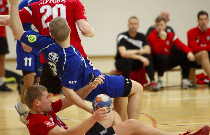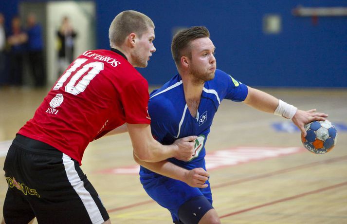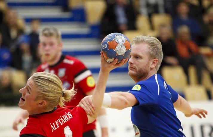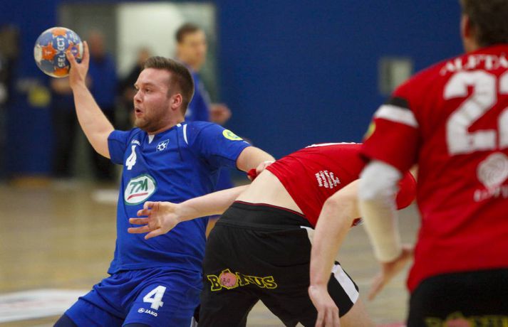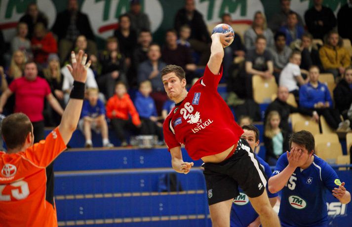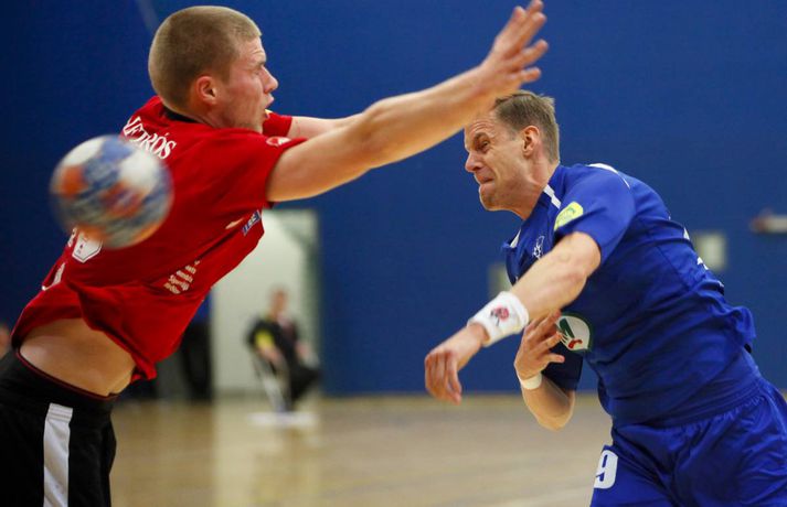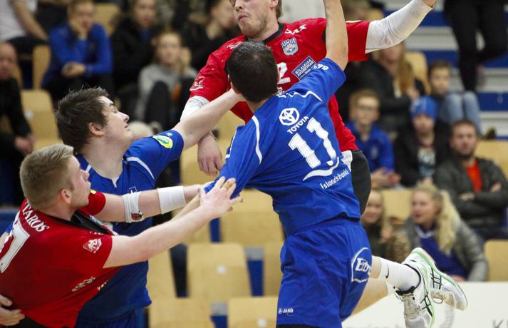 Haukar áttu ekki í vandræðum með að valta yfir Fram, 26-13, í tíundu umferð Olís-deildar karla í handbolta í kvöld, en staðan í hálfleik var 12-7 heimamönnum í vil.Ernir Eyjólfsson, ljósmyndari Fréttablaðsins og Vísis, tók myndirnar sem sjá má hér að ofan á leik Stjörnunna og Aftureldingar í kvöld. Janus Daði Smárason var markahæstur Haukanna með sjö mörk og Vilhjálmur Geir Hauksson skoraði fimm. Hjá gestunum var Kristinn Björgúlfsson markahæstur með þrjú mörk. Eftir tvö töp í röð er Afturelding aftur komin á sigurbraut, en hún lagði Stjörnuna í Garðabænum með sex marka mun, 28-22. Jóhann Gunnar Einarsson var markahæstur Aftureldingar með sex mörk en Ari Magnús Þorgeirsson skoraði jafnmikið fyrir Stjörnuna. Afturelding áfram á toppnum með 15 stig líkt og Valur en Haukarnir eru með ellefu stig í fimmta sæti. Stjarnan er með fimm stig í áttunda sæti og Framarar á botninum með fjögur stig.Stjarnan - Afturelding 22-28 (11-16) Mörk Stjörnunnar: Ari Magnús Þorgeirsson 6, Víglundur Jarl Þórsson 4, Þórir Ólafsson 3, Andri Hjartar Grétarsson 2, Starri Friðrikssno 2, Hilmar Pálsson 2, Hrannar Bragi Eyjólfsson 1. Mörk Aftureldingar: Jóhann Gunnar Einarsson 6/3, Gestur Ingvarsson 5, Böðvar Páll Ásgeirsson 3, Örn Ingi Bjarkason 3, Pétur Júníusson 2, Hrafn Ingvarsson 2, Jóhann Jóhannsson 2, Elvar Ásgeirsson 2, Gunnar Malmquist 2, Birkir Benediktsson 1.Haukar - Fram 26-13 (12-7) Mörk Hauka: Janus Daði Smárason 7, Vilhjálmur Geir Hauksson 5, Þröstur Þráinsson 4, Árni Steinn Steinþórsson 3, Tjörvi Þorgeirsson 2, Heimir Óli Heimisson 2, Adam Haukur Baumruk 1, Jón Þorbjörn Jóhannsson 1, Einar Pétur Pétursson 1. Mörk Fram: Kristinn Björgúlfsson 3, Ólafur Jóhann Magnússon 2, Þröstur Bjarkason 2, Sigurður Örn Þorsteinsson 2, Elías Bóasson 1, Garðar Benedikt Sigurjónsson 1, Stefán Baldvin Stefánsson 1, Kristófer Fannar Guðmundsson 1.