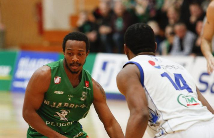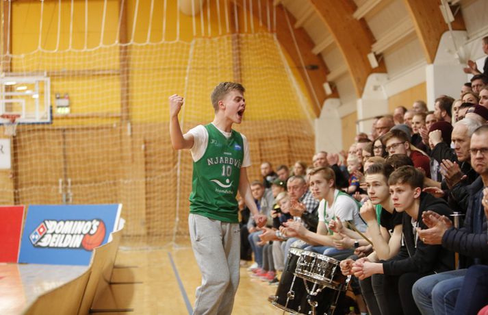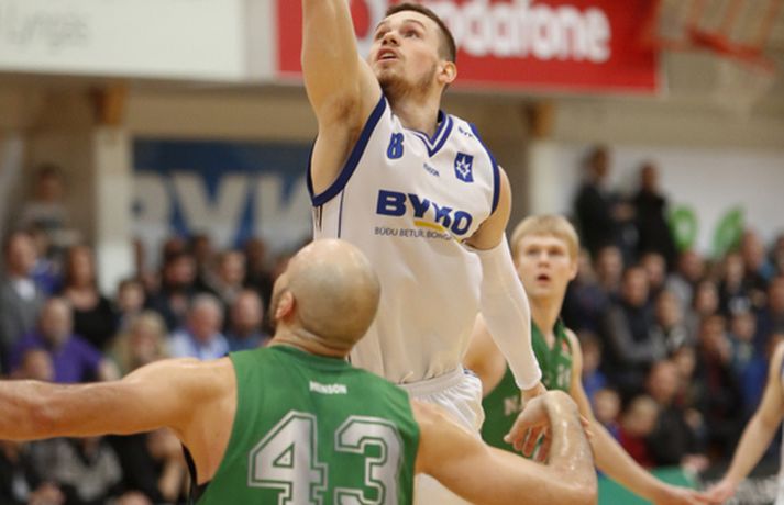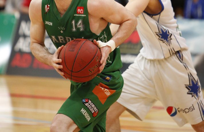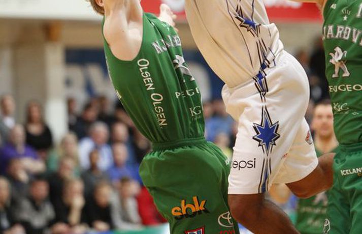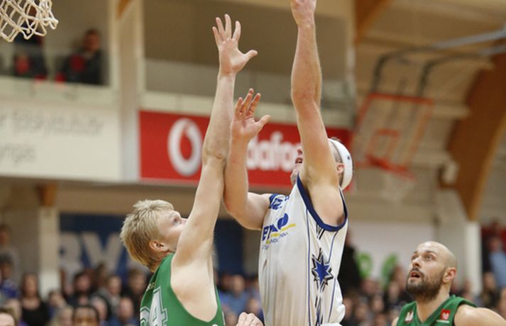 Stjarnan jafnaði metin í rimmu sinni gegn Njarðvík í 8-liða úrslitum úrslitakeppni Domino's-deildar karla eftir sigur í jöfnum og spennandi leik liðanna í kvöld.Ernir Eyjólfsson, ljósmyndari Vísis og Fréttablaðsins, var á leiknum í kvöld og náði þessum myndum hér fyrir ofan. Njarðvík var oftast með undirtökin í kvöld en Stjarnan jafnaði metin þegar fjórar mínútur voru til leiskloka og voru svo sterkari á lokasprettinum, þegar mest á reyndi. Svekkjandi niðurstaða fyrir gestina sem hefðu getað komið sér í kjörstöðu með sigri í kvöld. Leikmenn löguðu skotnýtinguna eftir því sem leið á leikinn en lykilmenn hafa oft spilað betur en í kvöld. Það var þó mikill hugur í báðum liðum og útlit fyrir áframhaldandi spennandi rimmu þeirra sem gæti allt eins ráðist í oddaleik. Leikmenn skutu illa í fyrri hálfleik, sérstaklega Stjörnumenn sem voru í miklu basli utan þriggja stiga línunnar (1/12). Dagur Kár Jónsson, hin frábæra skytta, fann sig engan veginn og var stigalaus eftir sex skottilraunir. Leikurinn var þó jafn þó svo að Njarðvíkingar hafi oftar verið skrefi framar, og það þrátt fyrir að Bonneau hafi verið langt frá sínu besta með níu stig og 2/11 skotnýtingu. Aðrir stigu upp og skoruðu átta leikmenn stig fyrir Njarðvík í fyrri hálfleik, þar af Logi tólf. Ágúst Angantýsson var ekki með Stjörnunni vegna veikinda og munaði um minna. Jón Orri Kristjánsson spilaði af þeim sökum meira en hann er vanur en Stjörnumönnum gekk illa að finna hann í teignum og var hann stigalaus í fyrri hálfleik. Atkinson var aðalmaður Stjörnunnar fyrir leikhlé og skoraði hann nítján stig, tæplega helming allra stiga heimamanna. Án hans hefðu Garðbæingar verið í miklu basli en þeir þurftu meira til fá fleiri mönnum til að taka frumkvæðið í seinni hálfleik. Síðari hálfleikur byrjaði með látum og átti eftir að gefa tóninn fyrir það sem koma skyldi. Bonneau skoraði fyrstu þrjú stig hálfleiksins en Stjarnan svaraði skyndilega með tólf stigum í röð og náði forystu. Það stóð þó stutt yfir og gestirnir voru fljótir að ná áttum. Eftir það var jafnræði með liðunum og magnaðist spennan með hverri mínútunni. Dagur Kár var enn stigalaus þegar fjórði leikhluti hófst og eftir ellefu misheppnuð skot í röð kom loksins að því að hann hitti. Við það hrökk hann í gang, skoraði sjö stig á stuttum tíma og sá til þess að Njarðvíkingar náðu ekki að stinga af. Justin Shouse hefur oft látið meira til sín taka en í kvöld en hann er mikill stemningsmaður og brást ekki sínum mönnum á ögurstundu. Hann setti niður tvo þrista í röð þegar rúmar þrjár mínútur voru eftir og reyndist það vítamínssprautan sem Stjörnumenn þurftu til að taka af skarið. Shouse skoraði síðustu fjögur stig sinna manna á vítalínunni þó svo að þristur Ágústar Orrasonar hafi gefið gestunum tækifæri. Maciej Baginski fékk tækifæri til að tryggja Njarðvík framlengingu á lokasekúndunni en Atkinson, sem var öflugur í kvöld, varði skot hans og tryggði sigur heimamanna. Atkinson skoraði 28 stig, tók þrettán fráköst og gaf sex stoðsendingar í kvöld en Shouse kom næstur með 23 stig. Marvin var svo drjúgur eins og oft áður með átján stig. Hjá Njarðvík var Logi bestur með 27 stig en Bonneau hefur oft hitt betur (7/23) og skoraði 20 stig. Hann tók þó fjórtán fráköst og hætti aldrei að berjast. Næsti leikur fer fram í Njarðvík á fimmtudagskvöldið.Dagur Kár: Ég átti erfitt uppdráttar Dagur Kár Jónsson hefur oft hitt betur en í kvöld en hann skoraði þó afar mikilvæg stig fyrir sína menn á mikilvægu augnabliki í fjórða leikhluta. „Það var frábært að spila á okkar heimavelli, fyrir framan okkar áhorfendur. Það fékk okkur til að halda einbeitingu allan tímann,“ sagði Dagur. „Við vorum að spila vel, fannst mér að mestu leyti. Þó svo að við misstum þá aðeins fram úr okkur þá náðum við alltaf að koma til baka.“ Dagur klikkaði á fyrstu ellefu skotunum sínum í kvöld en skoraði þó sjö mikilvæg stig í fjórða leikhluta. „Ég átti bara erfitt uppdráttar í kvöld, eins og gengur og gerist. Mér fannst ég skjóta boltanum ágætlega en hann vildi bara ekki ofan í. En ég á frábæra liðsfélaga sem héldu áfram að berjast og kláruðu þetta.“ „Það er varla hægt að lýsa því hversu mikilvægt það var að vinna þennan leik. Það hefði verið nánast búið að vera 2-0 undir og eiga útileik í þriðja leik.“ „En nú er jafntefli í seríunni og við erum tilbúnir að klára þetta. Við eigum fullt inni og hlökkum til að mæta í Ljónagryfjuna aftur.“ k.“Hrafn: Atkinson hleypur stundum kapp í kinn Hrafn Kristjánsson segist aldrei hafa misst trúna á sínum mönnum þó svo að Njarðvík hafi oftar verið skrefi framar en hans menn í kvöld. „Þetta stóð tæpt en við náðum að hanga í þeim. Við vorum ákveðnir í að breyta ákveðnum hlutum fyrir leikinn og þeir gengu loksins upp í fjórða leikhluta,“ sagði Hrafn án þess að fara nánar út í þau áhersluatriði. „Við reynum að byggja áfram á því fyrir næsta leik. Þetta eru ákveðnir taktískir þættir sem við sáum að virkuðu vel í fyrsta leiknum, eftir að við skoðuðum hann betur á upptökum en það er stutt á milli leikja og við náðum ekki að framkvæma þá nógu vel í byrjun leiks.“ Hann missti aldrei trúna á sínum mönnum í kvöld. „Dagur Kár er ofboðslega sterkur karakter og kemur inn þegar okkur gengur illa og setur sjö stig í röð. Það hélt okkur inn í leiknum þá og skipti miklu máli.“ Jeremy Atkinson, sem skoraði 38 stig og tók þrettán fráköst, var mikilvægur í kvöld og varði til að mynda síðasta skot leiksins. Hrafn ákvað þó að hv