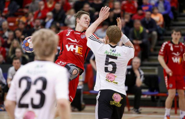 Haukar slógu nágranna sína í FH út úr úrslitakeppni Olís-deildar karla með fjögurra marka sigri, 28-24, í hörkuleik að Ásvöllum í kvöld. Leikurinn var jafn og spennandi í fyrri hálfleik en Haukar höfðu betur með feykigóðum varnarleik í síðari hálfleik.Ernir Eyjólfsson, ljósmyndari Vísis og Fréttablaðsins, var á leiknum í kvöld og tók þessar myndir hér fyrir ofan. Fyrri hálfleikur var mikil skemmtun. Bæði lið voru að spila góðan sóknarleik, leikurinn var hraður og vel leikinn af beggja hálfu. Jafnt var á öllum tölum svo gott sem allan hálfleikinn. Haukar náðu mest þriggja marka forystu í fyrri hálfleik, 11-8, en það virtist engin áhrif hafa á FH liðið. Upp úr sauð um miðjan fyrri hálfleik þegar þeim Einari Pétri Péturssyni Haukamanni og Halldóri Inga Jónassyni FH-ingi lenti saman. Halldór Ingi braut þá á Einari og fylgdi brotinu helst til of harkalega eftir, ýtti Einari út í vegg og upp hófust heilmiklar stimpingar. Einar virtist reyna að skalla til Halldórs en hvorugur þeirra fékk refsingu. FH náði að vinna upp það forskot Haukamanna og staðan að loknum fyrri hálfleik var jöfn, 16-16. Magnús Óli Magnússon fór mikinn í liði FH í fyrri hálfleik, skoraði 6 mörk, en hjá Haukum var téður Einar Pétur markahæstur í fyrri hálfleik með 5 mörk í 5 skotum. Vörn Hauka vaknaði heldur betur til lífsins í síðari hálfleik og heimamenn tóku að síga fram úr. Haukar náðu mest sex marka forystu og það var ekki fyrr en að FH fór að spila mjög framliggjandi vörn, þegar um 12 mínútur voru eftir af leiknum sem Haukar lentu í einhverjum vandræðum í sínum sóknarleik. Vörn Hauka stóðst þó áhlaup FH-inga og að lokum fóru heimamenn með fjögurra marka sigur af hólmi, 28-24. FH náði því miður ekki að halda í við Hauka allan leikinn. Fyrri hálfleikur var jafn og spennandi en sigur Hauka var þegar upp er staðið nokkuð öruggur, miðað við þróunina í síðari hálfleik. Það er því ljóst að FH hefur lokið keppni á Íslandsmótinu þetta tímabilið. Haukar eru hins vegar á góðu róli og eru satt best að segja til alls líklegir. Það efast enginn um að Haukar eru með lið sem getur farið langt. Haukar enduðu tímabilið í fimmta sæti en hugsanlega er liðið að toppa á hárréttum tíma.Patrekur Jóhannesson: Breytt vörn lagði grunninn að sigrinum Patrekur Jóhannesson, þjálfari Hauka, var kampakáttur með leik sinna manna gegn FH í kvöld og brosti út af eyrum þegar blaðamaður Vísis náði af honum tali. "Bæði lið voru að spila sex núll vörn í fyrri hálfleik og það var skorað mikið af mörkum þá. Það var mjög skemmtilegt á að horfa en mér fannst við eiga að geta verið þéttari í okkar varnarleik. Við breyttum í seinni hálfleik yfir í fimm einn vörn og fáum bara fjögur mörk á okkur á fyrstu 25 mínútunum eða svo. Það var aðeins í lokinn sem þeir ná að saxa á forskotið. En ég held að það hafi lagt grunninn og líka það hvað menn héldu ákveðni ró," sagði Patrekur. Þrátt fyrir að hann hafi ekki verið alveg sáttur við varnarleikinn í fyrri hálfleik segir Patrekur að liðið hafi ekki haft miklar áhyggjur af framhaldinu. "Í hálfleik vorum við ósköp rólegir og vissum að við gætum þetta. Ég er hrikalega ánægður með liðið. Þetta var alvöru liðsheild, ég róteraði mannskapnum og það voru allir sem tóku þátt í leiknum. Ég er bara virkilega stoltur af liðinu í dag," sagði Patrekur. "Við þjálfarar erum með einhverja fullkomnunaráráttu, viljum hafa frábæra vörn, hraðaupphlaup, góðan sóknarleik og helst stöðuna 16-8 í hálfleik. En FH var að spila vel í fyrri hálfleik líka. Þeir eru með öflugar skyttur og við áttum í miklum erfiðleikum með Magnús allan leikinn. Magnús er frábær leikmaður og í stöðunni einn á einn held ég að fáir séu jafngóðir og hann hér á Íslandi. En við náðum að halda öðrum niðri og stjórna leiknum í seinni hálfleik," sagði Patrekur að lokum.Ásbjörn Friðriksson: Vafasamir dómar féllu þeim í hag "Þetta er ömurleg staðreynd og klárlega ekki það sem við ætluðum okkur," sagði grautfúll Ásbjörn Friðriksson, leikmaður FH, eftir leikinn og var alls ekki sáttur með að vera kominn í sumarfrí svona snemma. "Við vorum klaufar í fyrsta leiknum. Spiluðum honum svolítið frá okkur. En í þessum leik fannst mér við spila vel. Þeir voru kannski skrefinu á undan í seinni hálfleik. En mér fannst líka vafasamir dómar falla þeim í hag. Það skilur kannski ekki á milli en ég upplifði það þannig að það sem var víti öðru megin var fríkast hinum megin," bætti Ásbjörn við. "Við fengum þrjár brottvísanir í upphafi síðari hálfleiks og það tók taktinn úr okkar spili. Haukarnir eru sterkir einum fleiri og náðu forskoti sem við vorum að reyna að kroppa í. Það forskot var bara aðeins of stórt, leikurinn hefði þurft að vera fimm mínútum lengur," sagði Ásbjörn. FH breytti um varnarafbrigði þegar um 12 mínútur voru eftir og Haukarnir lentu í smá vandræðum með þá vörn. "Við prófuðum að spila framarlega gegn þeim í fyrri hálfleik en náðum ekki að skipta þá. Við höfum trú á sex núll vörninni okkar. Eftir á að hyggja hefðum við kannski átt að fara fyrr í þessa vörn í síðari hálfleik en kannski hefði það verið of langur tími til að spila maður á mann. Það er erfitt að segja eftir á. En mér fannst þessi kafli þar sem við erum mikið einum færri í síðari hálfleik ráða úrslitum," sagði Ásbjörn að lokum.Jón Þorbjörn Jóhannsson: Töluðum vel saman í hálfleik og þetta var mjög einfalt "Þetta er ekki leiðinlegt. Maður gæti alveg vanist þessu," sagði varnartröllið Jón Þorbjörn Jóhannsson, leikmaður Hauka, eftir að ljóst va