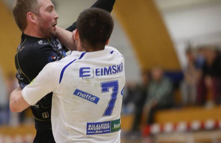 ÍR er komið í 1-0 forystu gegn Akureyri í rimmu liðanna í 8-liða úrslitum úrslitakeppni Olísdeildar karla efti sigur í Breiðholtinu í kvöld.Ernir Eyjólfsson, ljósmyndari Vísis og Fréttablaðsins, var á leiknum í kvöld og tók þessar myndir hér fyrir ofan ÍR, sem hafði tapað fjórum leikjum í röð og ekki unnið leik í rúman mánuð, var með undirtökin frá upphafi. Það var þó mjótt á munum lengst af en Svavar Ólafsson fór mikinn í marki heimamanna gegn slappri sókn gestanna. ÍR gerði nóg í sínum sóknarleik til að vinna leikinn og náði að síga fram úr á lokamínútunum. Björgvin Hólmgeirsson var aftur mættur í lið ÍR eftir að hafa misst af síðustu leikjum vegna meiðsla. Hans krafta naut við í um stundarfjórðung en á þeim tíma náði hann að skora þrjú mörk og leggja upp nokkur önnur. ÍR náði þá að byggja upp forystu sem nýttist ÍR-ingum allt til loka leiksins. Akureyringar hertu varnarleikinn eftir því sem leið á leikinn og fór Björgvin af velli eftir að hafa einmitt fengið byltu eftir átök við varnarmann gestanna. Gestirnir keyrðu sinn leik áfram á baráttu, bæði í vörn og sókn. Varnarlínan stóð sína vakt ágætlega og framan af nýttust hornin vel og þeir Kristján Orri og Heiðar Þór klikkuðu varla á skoti. Að öðru leyti gekk sókn gestanna út á að hnoða boltanum inn á teig og fiska víti ef markið kom ekki. Það gaf góða raun og Akrueyringar náðu að jafna metin á lokamínútu fyrri hálfleiks. En það var líka hugur í ÍR-ingum og tók Sturla skot af eigin vallarhelmingi þegar örfáar sekúndur voru eftir. Kristján Orri fór fyrir skotið og var fótur dæmdur. Kristján Orri fékk brottvísun og bekkurinn líka hjá Akureyri fyrir mótmæli Atla Hilmarssonar þjálfara. Daníel Ingi Guðmundsson skoraði þar að auki úr aukakastinu sem dæmt var og héldu ÍR-ingar því til búningsklefa með eins marks forystu. Baráttan hélt áfram í síðari hálfleik en þrátt fyrir fjarveru Björgvins náði ÍR að halda dampi í sínum sóknarleik og munaði þar miklu um framlag Arnars Birkis, skyttu ÍR, sem skilaði sínum mörkum á meðan að skyttur Akureyringa áttu afar erfitt uppdráttar, rétt eins og í fyrri hálfleik. ÍR-ingar stóðu áfram í þéttri 6-0 vörn sem gestirnir leystu ekki jafn vel og í fyrri hálfleik. Svavar Ólafsson hélt einnig áfram að verja fyrir aftan góða vörn ÍR og skilaði frábærum tölum, 18 vörðum skotum og 55% hlutfallsmarkvörslu. Hann og Arnar Birkir drógu vagninn fyrir ÍR í kvöld en fleiri lögðu hönd á plóg, ekki síst í varnarleiknum. Akureyringar geta mun betur en þeir sýndu í kvöld en ljóst er að þeir þurfa að stórbæta sóknarleikinn hjá sér til að eiga möguleika í seríunni. Þeir hafa þó aðeins tvo daga til að finna lausnir fyrir næsta leik, sem verður á Akureyri á föstudagskvöld.Bjarni: Áhættan borgaði sig Bjarni Fritzson var ánægður með frammistöðu sinna manna í kvöld og er liðið komið í góða stöðu í einvígi sínu gegn Akureyri. „Við vorum með yfirhöndina allan tímann sem var mikilvægt enda komu þeir með sín áhlaup,“ sagði Bjarni eftir leikinn í kvöld. „Vörnin okkar góð og það komu mikilvæg augnablik í síðari hálfleik sem við nýttum okkur vel.“ Hann hrósaði sóknarleik sinna manna og sagði að vinna síðustu vikna væri að skila sér. „Sóknin var góð og ég er mjög ánægður með strákana. Þeir voru að gera vel, tóku skynsamlegar ákvarðanir og skiluðu þessu vel af sér. Ég er hrikalega ánægður með þá,“ sagði hann. „Það var svo skemmtileg áhætta að kýla á 6-0 vörn í fyrsta sinn í vetur hjá okkur og það hefur sjálfsagt komið þeim talsvert á óvart. Jón Heiðar og Davíð voru hriklega öflugir í þristunum og Svavar tók svo mikilvæg skot á síðasta korterinu sem gaf okkur mjög mikið.“ Þetta var fyrsti sigur ÍR síðan í byrjun mars en þrátt fyrir það segir Davíð að hann hafi tekið eftir stíganda hjá sínum mönnum. „Síðustu tveir leikir hafa verið fínir hjá okkur. En við höfum misst nokkra menn og það tekur tíma að púsla því saman aftur og fá rútínuna aftur í gang. Mér finnst að við höfum náð að finna taktinn á ný og gott að geta tekið næsta skref og unnið í dag.“ Hann vissi ekki hvernig staðan væri á Björgvini sem spilaði fyrsta stundarfjórðunginn í dag. Hann hefur verið að glíma við meiðsli í fæti og misst af síðustu leikjum. „Hann gaf okkur þrjú mörk í dag og byrjaði af miklum krafti. En við eigum fleiri menn í þessari stöðu og við verðum bara að sjá til hvort að Björgvin geti spilað eitthvað meira með okkur.“Atli: Mér fannst þetta rangur dómur Atli Hilmarsson, þjálfari Akureyrar, segir að hans menn hafi einfaldlega ekki spilað nógu vel gegn ÍR í kvöld. Niðurstaðan var fjögurra marka tap. „Við vorum ekki góðir í dag og komumst aldrei almennilega í gang. Við eigum fullt inni, bæði í vörn og sókn. Það féll fullmikið með þeim í dag,“ sagði Atli sem sagði að sóknarleikurinn hafi brugðist í dag. „Þar að auki fengum við ódýr mörk á okkur og nýttum illa tækifæri sem við fengum í yfirtölu og annað slíkt. Vörnin var að standa ágætlega en samt gekk illa að refsa þeim með hraðaupphlaupum.“ „Við höfum sýnt í síðustu leikjum að við getum spilað mun betur en við gerðum í kvöld og við verðum að framkalla það aftur. Nú er að duga eða drepast á föstudaginn og ekkert annað að gera en að treysta á okkur sjálfa og okkar fólk.“ Umdeilt atvik átti sér stað í lok fyrri hálfleiks er Kristján Orri Jóhannsson fékk brottvísun fyrir að verja skot með fætinum. Kristján Orri fékk brottvísun og Atli líka fyrir mótmæli. Til að bæta gráu á svart skoruðu ÍR-ingar úr 