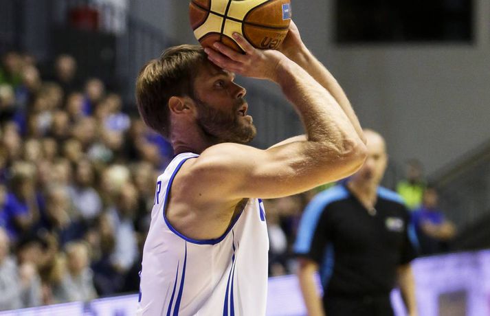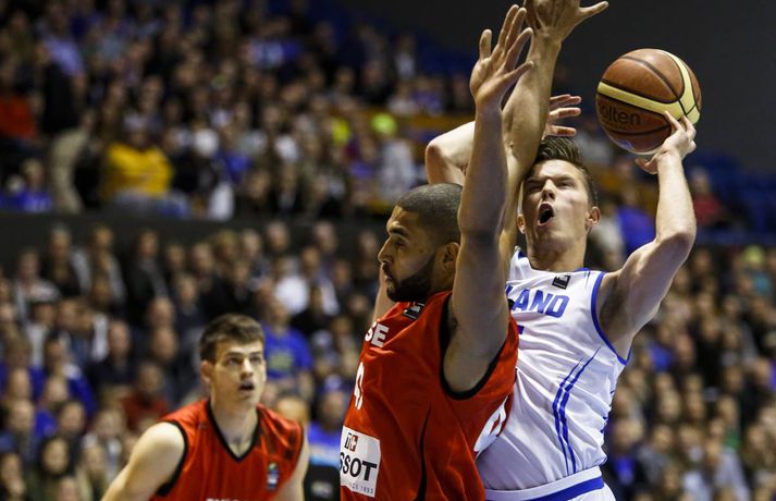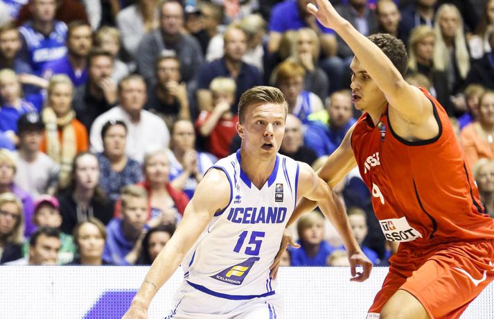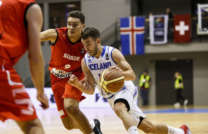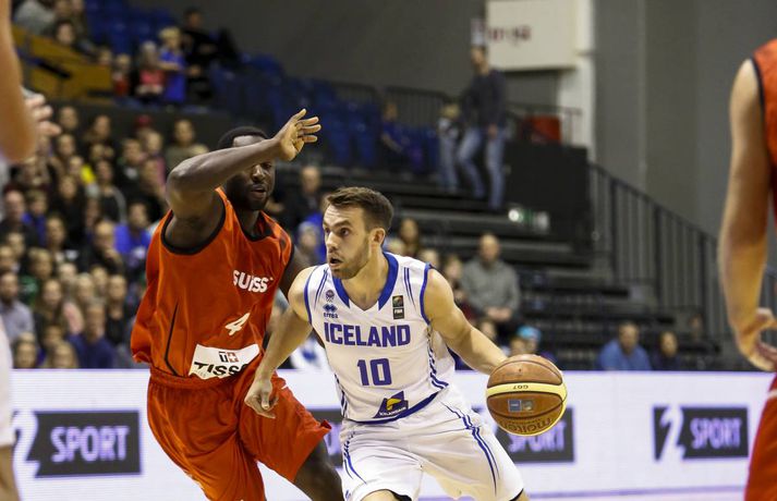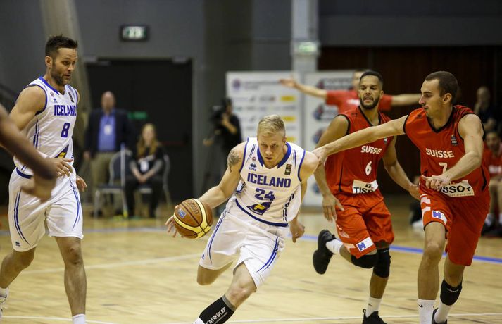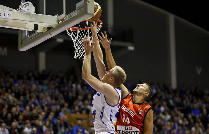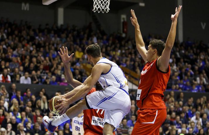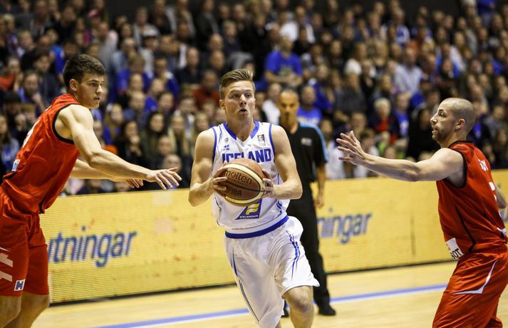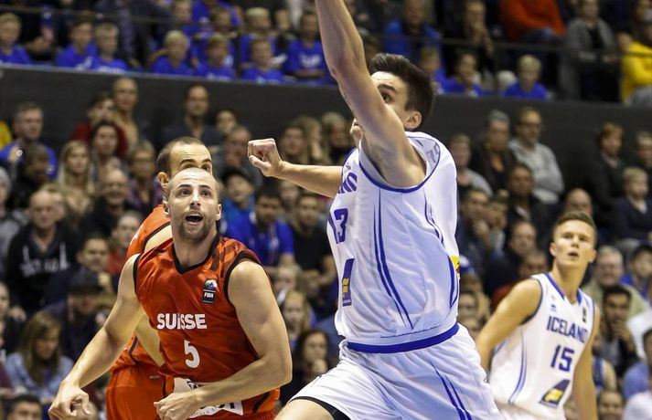 Umfjöllun, viðtöl og myndir: Ísland - Sviss 88-72 | Svisslendingar afgreiddir í Höllinni Stefán Árni Pálsson og Tómas Þór Þórðarson skrifa 31. ágúst 2016 22:00 Haukur Helgi Pálsson stóð fyrir sínu. vísir/ernir Strákarnir okkar í íslenska landsliðinu í körfubolta unnu í kvöld frábæran sextán stiga sigur á liði Sviss, 88-72, í fyrsta leik liðanna í undankeppni EM 2017.Ernir Eyjólfsson, ljósmyndari Fréttablaðsins og Vísis, var í Laugardalshöllinni í kvöld og tók meðfylgjandi myndir. Íslenska liðið hefur ekki spilað betur í langan tíma en ljóst er að það kemur mjög vel undirbúið til leiks og er varnarleikurinn sem það spilaði í kvöld ummerki um að góð undankeppni gæti verið í kortunum. Það er óhætt að segja að fyrsta sókn leiksins sem var Svisslendinga hafi sett tóninn fyrir það sem átti eftir að gerast. Leikstjórnandi gestanna bar upp boltann en var búinn að missa hann út af eftir nokkrar sekúndur vegna frábærs varnarleiks Harðar Axels Vilhjálmssonar. Íslenska liðið byrjaði af þvílíkum krafti jafnt í vörn sem sókn og gekk hreinlega allt upp. Ef Ísland ætlar að vinna körfuboltaleiki þarf þessi smávaxna vörn að vera aktív og á mikilli hreyfingu og á hinum enda vallarins þurfa skotin að detta. Strákarnir skutu 16 af 28 í fyrri hálfleik eða 57 prósent, þar af átta af 16 fyrir utan sem gerir 50 prósent. Þannig var fyrri hálfleikurinn hjá strákunum okkar allt að því fullkominn. Varnarleikurinn var á köflum magnaður þar sem hver einasta skipting á skríni heppnaðist og urðu Svisslendingarnir stundum svo ráðalausir að þeir tóku smá steppdans með boltann og fengu dæmd á sig skref. Sviss var búið að missa boltann sex sinnum í fyrsta leikhluta og leikmenn liðsins hittu nánast ekkert enda voru þeir trekk í trekk neyddir í erfið skot. Ísland komst í 14-5, 19-7 og 22-9. Þá gafst þjálfari gestanna upp og tók leikhlé. Hann gat ekki annað enda var íslenska liðið við það að stinga af með Höllina á bakvið sig. Stuðningsmennirnir vissu ekki alveg við hverju þeir áttu að búast og var rólegt í húsinu til að byrja með en þessi frammistaða íslenska liðsins var fljót að kveikja í fólkinu.Bakverðirnir frábærir Sviss minnkaði muninn í 24-16 fyrir leik annars leikhluta en lenti svo 26 stigum undir, 47-21, í öðrum leikhluta þar sem íslenska liðið var nánast óstöðvandi. Þar spilaði inn í frábær innkoma reynsluboltans Loga Gunnarssonar sem var alveg magnaður. Logi fór bara út í vinstra hornið sem honum líður svo vel í og plantaði niður þrettán stigum með þremur þristum og tveimur tveggja stiga körfum; allt af sama blettinum. Hann skoraði meira að segja tvær þriggja stiga körfur í sömu sókninni eftir að dæmd var villa inn í teig þegar fyrra skotið var í loftinu. Nýja bakvarðaparið var einnig mjög gott. Á æfingamótinu á dögunum voru Craig Pedersen og aðstoðarmenn hans að slípa saman þá Hörð Axel og Martin Hermannsson og það virðist hafa virkað. Martin hefur bætt sig gríðarlega í varnarleiknum eftir dvölina í Bandaríkjunum og allir vita hvað Hörður getur í vörninni. Í sókninni var Martin svo búinn að skila þrettán stigum og Hörður Axel fimm plús sjö stoðsendingum. Sextán stig, átta stoðsendingar og frábært varnarframlag á ekki nema 20 mínútur. Þetta er bakvarðapar framtíðarinnar. Eftir mikið bras í sóknarleiknum tókst þjálfara Sviss aðeins að berja smá lífi í sína menn sem skoruðu átta síðustu stig fyrri hálfleiks og fóru "ekki nema" 18 stigum undir til búningsklefa, 47-29.Sviss vaknaði Svisslendingarnir virtust vakna af vondum draumi í seinni hálfleiknum og skoruðu fyrstu fimm stig leiksins og voru tiltölulega fljótir að koma muninum á liðunum niður fyrir tuginn í níu stig, 50-41. Liðið sem virtist ekki geta hitt hlöðu né varist í fyrri hálfleik var mætt til leiks. Varnarleikur gestanna var miklu betri og tók það okkar menn smá tíma að komast aftur í takt eftir smá ráðleysi í byrjun þriðja leikhluta. En stórar körfur eins og þristur frá fyrirliðanum Hlyni Bæringsson og geggjað snúningssniðskot frá Herði Axel (og vítaskot að auki) héldu íslenska liðinu gangangi. Sviss minnkaði engu að síður muninn niður í tíu stig fyrir lokafjórðunginn, 64-54. Þar munaði gríðarlega um ömurlega vítanýtingu íslenska liðsins. Það hitti ekki bema úr sjö af fjórtán vítaskotum eða 50 prósent í fyrri hálfleik og aðeins tveimur af níu í þriðja leikhluta. Mörgum ókeypis stigum var kastað í ruslið. Sem betur fer urðu þau liðinu ekki að falli. Strákarnir voru ekkert á því að gefa frá sér sigurinn fyrir framan næstum fulla Laugardalshöllina. Martin Hermannsson kveikti næstum í kofanum með ruglaðri keyrslu að körfunni og fékk vítaskot að auki.Frábær endir Þar með var björninn unninn. Varnarleikurinn varð aftur frábær og þegar fimm mínútur voru eftir af fjórða leikhluta munaði 22 stigum á liðunum, 81-59. Það verður þó að gera svissneska liðinu það, að þegar það leit út fyrir að vera algjörlega dautt og grafið spýtti það í lófana, en sem betur fer of seint. Strákarnir okkar höfðu á endanum 16 stiga sigur, 88-72, sem hefði hæglega getað verið stærri. Leikmennirnir og þjálfarateymið fagnar þessum sigri í kvöld en grætur kannski að hafa ekki látið kné fylgja kviði og valtað yfir Svisslendingana því stigamunur getur skipt máli. En frábær sigur og ein besta frammistaða íslenska liðsins í langan tíma staðreynd. Framlag frá mörgum í sókninni og á löngum köflum einhver besti varnarleikur sem liðið hefur spilað. Hörður Axel Vilhjálmsson var stigahæstur hjá Íslandi í kvöld með 16 stig auk þess sem hann gaf átta stoðsendingar og spilaði frábæran 