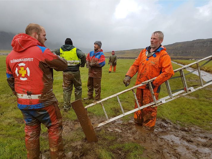 Á þriðja tug kinda bjargað undan aurskriðu Kristín Ólafsdóttir skrifar 28. september 2017 18:00 Um 20 til 30 kindum var bjargað í dag eftir að skriða féll neðan við bæinn Hamarssel í Hamarsfirði. Landsbjörg Björgunarsveitarmenn björguðu á þriðja tug kinda sem lent höfðu undir aurskriðu í Hamarsfirði í morgun. Talið er að enn sé eitthvert fé undir skriðunni en gríðarlegir vatnavextir eru á Suðaustur- og Austurlandi vegna úrkomu í gær og í dag. Um 15 til 20 manns frá björgunarsveitinni Báru á Djúpavogi komu að björgunaraðgerðunum í dag eftir að skriða féll neðan við bæinn Hamarssel í Hamarsfirði um klukkan ellefu í morgun. Jökull Fannar Helgason, stjórnarmaður í svæðisstjórn björgunarsveita á Austurlandi, segir í samtali við Vísi að vel hafi gengið að koma kindunum undan skriðunni. „Það féll þarna skriða um ellefuleytið í morgun, gríðarlega stór og kom niður úr giljum og yfir tún. Það varð eitthvað fé undir,“ segir Jökull Fannar en ekki er enn vitað hversu margar kindur urðu fyrir skriðunni. „Þeir náðu að bjarga einhverjum 20 til 30 kindum.“Um 20 til 30 kindum var bjargað undan aurskriðunni í dag.Landsbjörg„Það er náttúrulega bara allt gegnsósa af vatni“ Miklar annir hafa verið hjá björgunarsveitum á Suðausturlandi í gær og í dag vegna gríðarlegra vatnavaxta og úrkomu á svæðinu. Jökull Fannar segist ekki muna eftir öðru eins votviðri. „Það er náttúrulega bara allt gegnsósa af vatni. Ég veit um menn sem hafa búið í Hamarsfirði frá því fyrir 1970 og þeir hafa ekki séð annað eins.“ Talið er að tugir kinda hafi drepist þegar Jökulsá á Fljótsdal flæddi yfir bakka sína við Valþjófstaðanes eftir mikla úrkomu í gær. Þá voru á milli 20 og 25 bæir innlyksa vegna vatnavaxtanna laust eftir hádegi í dag. Ekki er heldur útlit fyrir að hringvegurinn opni fyrr en í fyrsta lagi á sunnudag en hann er lokaður við Hólmsá á Mýrum.Allt er gegnsósa af vatni á svæðinu að sögn Jökuls Fannars Helgasonar, stjórnarmanns í svæðisstjórn björgunarsveita á Austurlandi. Björgunarmenn voru því drullugir á vettvangi í dag.Landsbjörg Veður Tengdar fréttir Bílaleigur leggja þung gjöld á ferðamenn vegna flóðanna Lögregluþjónn og ljósmóðir eru meðal þeirra sem fengið hafa far með þyrlu til Hafnar í Hornafirði í morgun enda þjóðvegurinn í sundur. 28. september 2017 15:23 Hringvegurinn lokaður á tveimur stöðum Búið er að loka fyrir alla umferð yfir brúna á þjóðvegi 1 yfir Steinavötn í Suðursveit. 28. september 2017 10:40 Áfram mun rigna á Austurland Veðurstofan gerir áfram ráð fyrir fyrir talsverðri, samfelldri úrkomu fram undir kvöld. 28. september 2017 06:09 Þyrlan flýgur með nauðsynjavörur á bæi sem eru innlyksa vegna vatnavaxta Von er á þyrlu Landhelgisgæslunnar innan skamms á Suðausturland þar sem gríðarlegir vatnavextir eru vegna úrkomu í gær og í dag. 28. september 2017 12:23 Mest lesið Virðist ekki vera hægt á Íslandi Innlent Hyggst kæra dyraverði Auto til lögreglu Innlent Hiti geti mest náð átján stigum Veður „Ótrúlega sorglegt að pabbi sé búinn að vera svona lengi í þessari stöðu“ Innlent Ný könnun Maskínu: „Væri alveg ný staða í íslenskum stjórnmálum“ Innlent Stytting framhjá Blönduósi ekki á samgönguáætlun Innlent Gaf fingurinn á Miklubraut Innlent „Bandaríkin eiga ekki að taka yfir Grænland“ Erlent Breiddi út faðminn fyrir rasista: „Þið þurfið ekki að biðjast afsökunar á að vera hvít lengur“ Erlent „Ég hef aldrei upplifað annan eins harm“ Innlent Fleiri fréttir Fjölgun eldri kvenna í Kvennaathvarfi: „Þessar konur bíða ekki“ Ráðist á pilt á heimleið Virðist ekki vera hægt á Íslandi Stytting framhjá Blönduósi ekki á samgönguáætlun Vestmannaeyingar fá að eiga Vestmannaeyjar Hyggst kæra dyraverði Auto til lögreglu „Ótrúlega sorglegt að pabbi sé búinn að vera svona lengi í þessari stöðu“ Höfðu samband við dönsku herstjórnina á Grænlandi Ný könnun Maskínu: „Væri alveg ný staða í íslenskum stjórnmálum“ Glæný Maskínukönnun og jólaóveður Ársæll hringdi beint í utanríkisráðherra eftir fundinn Ósannað að fimmtán ára stúlka hafi stungið sextán ára pilt tvisvar Sameina Farice, Öryggisfjarskipti og hluta Neyðarlínunnar Gaf fingurinn á Miklubraut Birtir drög að lögum um lagareldi: Hyggst leggja niður Fiskeldissjóð Hundrað og fjörutíu milljarða bótakrafa á Samherja sé súrrealísk Skemmdir í kirkjugörðum vegna aksturs utan vegar Ólýsanlegur harmur fyrir fjölskylduna og söfnun hleypt af stokkunum „Ég hef aldrei upplifað annan eins harm“ Vill leiða lista Sjálfstæðismanna í Reykjanesbæ „Þetta hefur verið þungur tími“ Naut aðstoðar samskiptasérfræðinga vegna veiðigjaldamálsins Hrindir af stað söfnun fyrir móður stúlkunnar sem lést í Suður-Afríku Varð vitni að ótrúlegum norðurljósum: „Mér fannst þetta magnað“ Færir nýársboðið fram á þrettándann Fjórir fluttir á sjúkrahús eftir bílveltu á Suðurlandi Leggur aftur til hverfislögreglustöð í Breiðholti Nú má heita Love, Tóní, Ranimosk og Draumur Kvartar til umboðsmanns og vonar að Vegagerðin sjái að sér Ætlar ekki að beita sér í máli starfsmanns Útlendingastofnunar Sjá meira