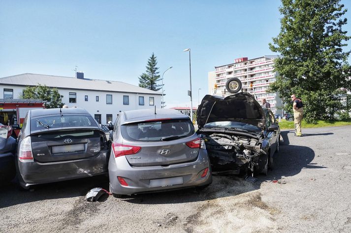 Slökkvilið og sjúkraflutningamenn voru kallaðir til vegna áreksturs á gatnamótum Hæðargarðs og Grensásvegar á ellefta tímanum í dag. Svo virðist vera sem ökumaður hafi misst stjórn á bíl sínum er hann ók norður eftir Grensásvegi með þeim afleiðingum að hann hafnaði á kyrrstæðum bílum á bílastæði í Hæðargarði. Fjórir bílar skemmdust; bíll ökumannsins og þrír bílar á stæðinu. Ennþá er unnið á vettvangi en Guðmundur Guðjónsson, varðstjóri hjá slökkviliði höfuðborgarsvæðisins, gerir ráð fyrir að aðgerðum verði lokið upp úr klukkan 11. Þrífa þurfi upp brak úr bílunum og hreinsa upp olíu.Frá vettvangi.Vísir/vilhelmHann segir einhverja hafa verið flutta á slysadeild eftir áreksturinn en hafði ekki nákvæman fjölda. Varðstjórinn gerir þó ekki ráð fyrir að alvarleg meiðsl hafi orðið á fólki, þó svo að það sé ekki hægt að útiloka fullkomlega. Guðmundur tekur undir með blaðamanni að árekstur á þessum gatnamótum, sem eru ljósastýrð og umferðarhraði alla jafna ekki mikill, sé óvenjulegur. „En þetta getur alltaf komið fyrir,“ segir Guðmundur.