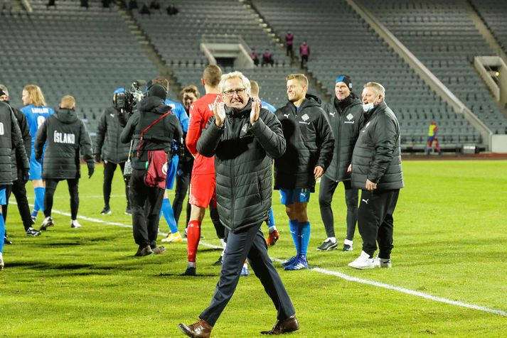 Svona var blaðamannafundur KSÍ Ingvi Þór Sæmundsson skrifar 6. nóvember 2020 14:06 Tekst Erik Hamrén að koma Íslandi á EM? vísir/vilhelm Vísir var með beina útsendingu og textalýsingu frá blaðamannafundi KSÍ þar sem Erik Hamrén, þjálfari íslenska karlalandsliðsins í fótbolta, tilkynnti hópinn fyrir leikina gegn Ungverjalandi, Danmörku og Englandi. Útsendingu og textalýsingu frá fundinum má nálgast hér fyrir neðan. Hamrén valdi 24 leikmenn í íslenska hópinn fyrir leikina gegn Ungverjum, Dönum og Englendingum. Hópinn má sjá hér fyrir neðan. Íslenski landsliðshópurinn.ksí Íslenska liðið æfir í Augsburg í Þýskalandi fyrir leikinn mikilvæga gegn Ungverjalandi á fimmtudaginn. Strákarnir okkar fara svo til Búdapest á miðvikdaginn. Leikur Íslands og Ungverjalands fer fram á hinum glæsilega Puskás Arena í Búdapest fimmtudaginn 12. nóvember klukkan 19:45. Sigurvegarinn tryggir sér sæti á EM á næsta ári. Íslendingar mæta svo Dönum á Parken 15. nóvember og Englendingum á Wembley þremur dögum síðar í síðustu tveimur leikjum sínum í riðli 2 í A-deild Þjóðadeildarinnar. Allir þrír landsleikirnir verða sýndir beint á Stöð 2 Sport. Leikur Ungverjalands og Íslands verður sýndur í beinni útsendingu á Stöð 2 Sport 2 fimmtudaginn 12. nóvember klukkan 19.45 en upphitun hefst klukkan 18.45. Áskrift er hægt að kaupa hér en einnig verður í boði að kaupa stakan viðburð á myndlyklum Vodafone og Símans á kr. 990, sem og í vefsjónvarpi Stöðvar 2.