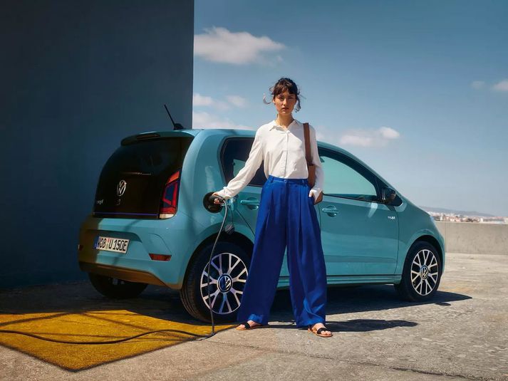 Útlit Bíllinn er frekar kassalaga. Það virðist koma til af því hann á að bjóða upp á frekar upprétta sætisstöðu og það þarf að reikna inn í dæmið nægjanlegt höfuðpláss fyrir sem flesta og svo er hann hannaður til að vera smábíll. Þar af leiðir er að hann er ekki langur og verður því fremur kassalaga. Hann hefur sígilt Volkswagen útlit, smekklegt, vandað og ekkert sem gæti verið fráhrindandi fyrir neinn. Ekkert að því, nema hvað að það eru engar áhættur teknar, allt spilað frekar öruggt. Aksturseiginleikar Bíllinn er léttur af rafbíl að vera og snöggur, upp í svona 60-70 km/klst. Ekki það að hann sé hægur frá 70-90 km/klst, hann er bara ekki eins snöggur, honum var að sjálfsögðu ekki ekið hraðar í reynsluakstrinum. Hann er lipur í akstri og ljúfur, það er ofboðslega gott að skjótast á honum. Amstur dagsins verður til þess að maður glotti yfir getu bílsins til að stinga sér, skjóta sér og sniglast eitthvað. Svo er ekki slæmt að leggja honum. Innra rými í e-Up. Skjárinn beint fyrir neðan baksýnisspegilinn er snjallsími, festur í snjallsímafestingu bílsins. Notagildi Bíllinn er lítill, honum var ætlað að vera lítill. Hann er þar af leiðandi ekki með stærsta skott sem finnst, fótaplássið er fínt miðað við stærðarflokk. Hann er auðvitað fjögurra manna sem er ákveðið strik í notagildis reikninginn. En hann er virkilega góður í annað, eins og að snattast. Þetta er ekki flutningabíll. Innra rými Áður hefur verið fjallað um að bíllinn sé hressilega einfaldur. Skjárinn er lítill og er ekki snertiskjár. Í ofanálag er lykill sem þarf að snúa eins og í sprengihreyfilsbílum framleiddum snemma á síðasta áratug. Innra rýmið er smekklegt og sama má segja um það og ytra byrði, hann er stílhreinn og engir sénsar teknir. E-Up veitir ekkert af armpúða. Hann er með haldara fyrir snjallsíma, svo að einhverju leyti má segja að hann geti verið með snertiskjá. Volkswagen e-Up stungið í hleðslu. Drægni og hleðsla Rafhlöðurnar í e-Up eru 32,3 kWh og 36,8 kWh. Þær koma bílnum 180-260 kílómetra miðað við uppgefnar tölur. Ekkert í reynsluakstrinum gefur tilefni til að efast um þessar tölur. Uppgefin hleðslutími frá tómum rafhlöðum og upp í 80% í DC hleðslu er 1 klst. Á AC er það 5 klst og 30 mínútur. Á venjulegri innstungu er hann 16 klst og 15 mínútur að hlaða sig alveg upp í 100% frá tómum rafhlöðum. Verð og samantekt Volkswagen e-Up! kostar frá 3.690.000kr. og upp í 3.990.000 kr. fyrir Style útgáfuna. E-Up er góður rafborgarbíll sem sinnir hlutverki sínu vel. Það er gaman að aka rafbíl sem er ekki með rafbílastæla. Bíllinn er bara bíll. Það er ekki verið að reyna að snobba fyrir fínu og flottu afþreyingar kerfi og einhverjum krúsidúllum sem eru skemmtilegar en í grunninn óþarfar, þegar markmiðið er að snattast frá A-B.