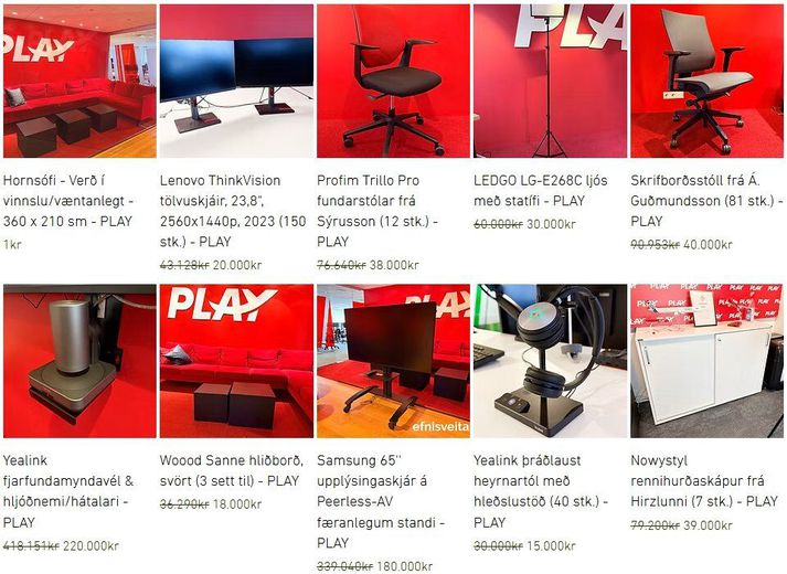 Munirnir, sem eru meðal annars borð, stólar, sjónvarp, heyrnartól og ræðupúlt, hafa verið auglýstir til sölu á vef Efnisveitunnar, fyrirtækis sem sérhæfir sig í að selja notuð húsgögn og fleira. Af vef Efnisveitunnar. Bogi Auðarson, annar eigenda Efnisveitunnar, segir í samtali við Vísi að skiptastjórar þrotabúsins hafi haft samband og óskað eftir aðstoð fyrirtækisins við að koma húsgögnum Play í verð. Hann segir að munirnir séu enn í höfuðstöðvum Play að Suðurlandsbraut en einhver eintök af hlutum sem mikið er til af séu til sýnis í verslun Efnisveitunnar. Hafi fólk áhuga á að kaupa úr búinu þurfi að hafa samband við Efnisveituna og einn afhendingardagur fyrir alla munina verði ákveðinn síðar. Hann verði sennilega strax í næstu viku.