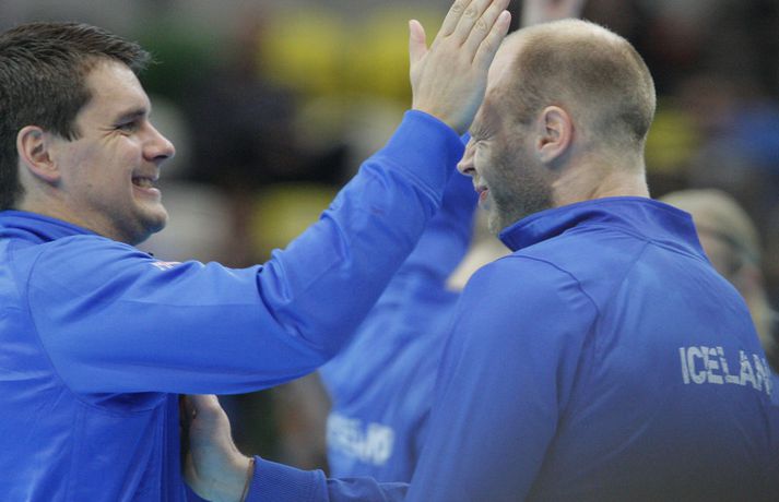 Íslendingar eru komnir á mikið og gott skrið á Ólympíuleikunum í London eftir tvo sigra í fyrstu tveimur leikjum íslenska handboltalandsliðsins. Strákarnir okkar sýndu heimsklassaframmistöðu gegn Túnisum nú í morgunsárið. Staðan eftir 20 mínútur var orðin 13-3 og Túnisar einfaldlega búnir á því. Íslenska vörnin var sem ókleifur múr í fyrri hálfleik enda vissu leikmenn Túnis ekki sitt rjúkandi ráð. Niðurstaðan var tíu marka sigur, 32-22, en strákarnir gátu leyft sér að slaka aðeins á klónni í seinni hálfleik og spara aðeins kraftana fyrir næsta leik, sem er gegn Svíum á fimmtudagskvöldið. Valgarður Gíslason, ljósmyndari Vísis og Fréttablaðsins, var í Koparboxinu í London og tók þessar myndir.Mynd/Valli