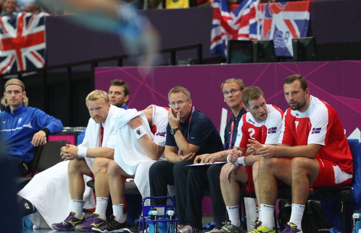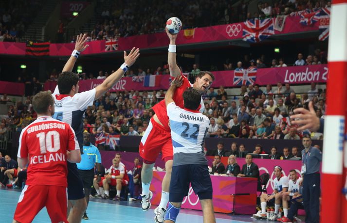 Leik lokið: Ísland - Bretland 41-24 | Öruggt eftir erfiða fæðingu Eiríkur Stefán Ásgeirsson í London skrifar 6. ágúst 2012 12:33 Mynd/Valli Ísland kláraði riðlakeppnina á Ólympíuleikunum í London með öruggum sigri á Bretum í Koparboxinu. Fyrri hálfleikur var þó afspyrnuslakur af hálfu strákanna okkar. Bretar náðu að skora fimmtán mörk á íslensku vörnina í fyrri hálfleik - jafn mörg og Frakkar gerðu í síðasta leik okkar á undan. Allt annað var að sjá til liðsins í síðari hálfleik og tókst þeim þá að klára verkefnið sómasamlega. Ísland mætir Ungverjalandi í fjórðungsúrslitum keppninnar á miðvikudaginn en þá færist keppnin úr Koparboxinu og yfir í körfuboltahöllina. Fyrri hálfleikur var með ólíkindum og fyrsta viðvörunarbjallan hringdi eftir um átta mínútna leik. Þá misstu Bretar mann af velli í tvær mínútur en á þeim leikkafla tókst þeim engu að síður að galopna íslensku vörnina og skora tvö mörk gegn einu. Skyndilega föttuðu gestgjafarnir að þeir ættu greiða leið í gegnum íslenska vörnina og nýttu þeir hana óspart. Steven Larsson, hægri skytta breska liðsins, fór þar fremstur í flokki og var óhræddur við að láta vaða. Árangurinn var átta mörk í fyrri hálfleik. Eftir ellefu mínútuna leik náðu Bretar að jafna metin með sínu sjötta marki í leiknum. Þar var á ferðinni Mark Hawkins, leikmaður Aftureldingar, en hann gerði sér lítið fyrir og fór inn úr vinstra horninu, framhjá Ólafi Stefánssyni og lét vaða á nærstöng úr þröngu færi. Björgvin Páll Gústavsson kom engum vörnum við. Markvörður Breta fór einnig á kostum en sá heitir Robert White. Hann varði oft glæsilega frá íslensku strákunum í dauðafærum, hvað eftir annað. Svipurinn á honum sagði allt sem segja þurfti - hann var hissa, mjög hissa. En svo fagnaði sem óður maður og áhorfendur tóku vel undir. White varði átta skot í fyrri hálfleik - meira en Hreiðar Levý (6) og Björgvin Páll (1) samanlagt. Það sem einkenndi fyrri hálfleik íslenska liðsins var hversu slakur varnarleikurinn var. Það kom á óvart enda vörnin búin að vera frábær hingað til gegn miklu, miklu sterkari liðum en Bretlandi. Alls skoruðu Bretar fimmtán mörk í fyrri hálfleik og hverju einasta var fagnað með gríðarlegum látum áhorfenda í Koparboxinu. Strákarnir skoruðu sjálfir átján mörk og höfðu því þriggja marka forystu í hálfleik. Síðari hálfleikur byrjaði eins og sá síðari endaði. Larsson skoraði og White varði. En strákarnir voru einbeittir á svip og hafði greinilega verið sagt í búningsklefanum að vinsamlegast gyrða sig í brók. Bretar héldu áfram að berjast og skora einstaka mark en þegar strákarnir fóru að spila eins og þeir áttu að gera frá upphafi jókst munurinn á liðunum hratt og örugglega. Það eina jákvæða við þennan leik er að leikmennirnir vissu upp á sig sökina og kláruðu leikinn almennilega, fram á síðustu sekúndu. Allir leikmenn Íslansd komust á blað nema Sverre Jakobsson og markverðirnir. Larsson náði að skora aðeins eitt mark í seinni hálfleik og markvarsla White datt einnig niður eftir því sem leið á leikinn. Viðtöl eru væntanleg á Vísi innan skamms. Handbolti Mest lesið Ekkert bit í snáknum: „Hörmulegur og ætti að hætta“ Sport United horfir til Þýskalands eftir höfnun Semenyo Enski boltinn „Þú birtir falsfrétt um mig, þú ert í banni“ Fótbolti Goðsögn fallin frá Enski boltinn Þessi tíu eru tilnefnd sem Íþróttamaður ársins 2025: 23 ára aldursmunur Sport Kynntu Sigurð á slaginu sex á aðfangadag Íslenski boltinn Zidane sá soninn spila á Afríkumótinu Fótbolti „Ég elska peninga“ Sport Féll úr skíðalyftu og lést Fótbolti Kærður af knattspyrnusambandinu Enski boltinn Fleiri fréttir Ekkert spilað í vetur en gæti mætt Íslandi í fyrsta leik á EM Arnar Daði rekinn frá Stjörnunni en áfram þjálfari kvennaliðsins Öll höllin æpti nafn Gísla í spennutrylli Sakaður um niðurlægingu: „Við viljum ekki hafa hann sem þjálfara“ Haukur getur náð hundrað plús hundrað fyrir EM-fríið Rúnar sótti sinn fyrsta sigur sem þjálfari Wetzlar Haukur með sjö mörk og Magdeburg rétt marði botnliðið Rúmlega áttræður Moustafa endurkjörinn forseti IHF með yfirburðum Slæm fjárhagsstaða HSÍ kemur ekki niður á EM Donni fagnaði EM vali með skotsýningu Sigvaldi Björn fjarri góðu gamni í sjaldséðu tapi Kolstad Eva Björk með stórleik í fyrsta sigri Stjörnunnar „Hann er ein stærsta ástæðan fyrir því“ KA-menn fengu góða jólagjöf Flautumark hjá FH og ÍR með þeim í Höllina KA í undanúrslit á kostnað bikarmeistaranna Stærsti leikur ársins í Eyjum fer fram í kvöld „Er því miður kominn í jólafrí“ „Þetta var mjög skrítinn leikur“ Haukakonur í fjórða sætið KA/Þór - Valur 23-30 | Ótrúlegur viðsnúningur gestanna Ómar óstöðvandi og Magdeburg í undanúrslit Ómar Ingi fær meiri ábyrgð og tekur við kyndlinum af Aroni Ekkert stríð við Porto og einstakur Þorsteinn nítjándi maður Síðasta verkefni reyndist dýrt fyrir Sigvalda Teitur fer á EM sem hornamaður í stað Sigvalda Snorri kynnti EM-strákana okkar Hleyptu Þorsteini ekki heim og vilja ekki að hann fari á EM Kári og Logi vilja henda Ými út úr landsliðinu Sagður utan hóps fyrir Bjarka og Orra Sjá meira