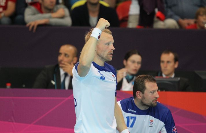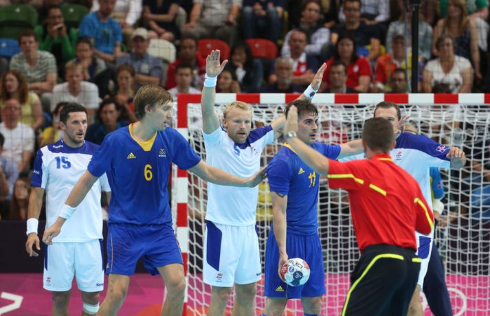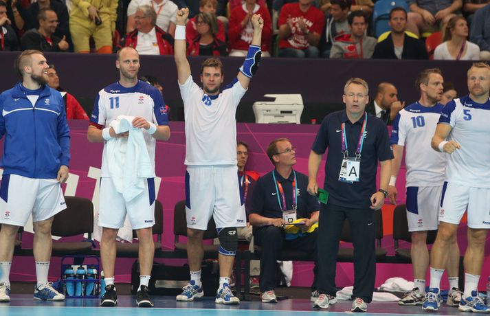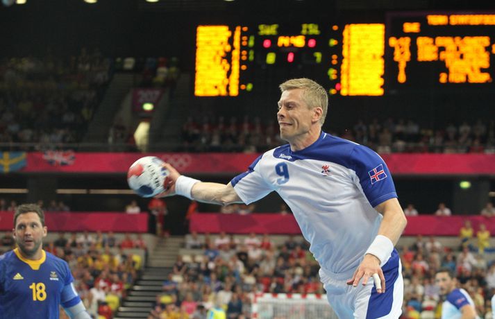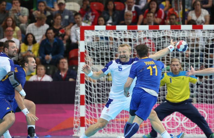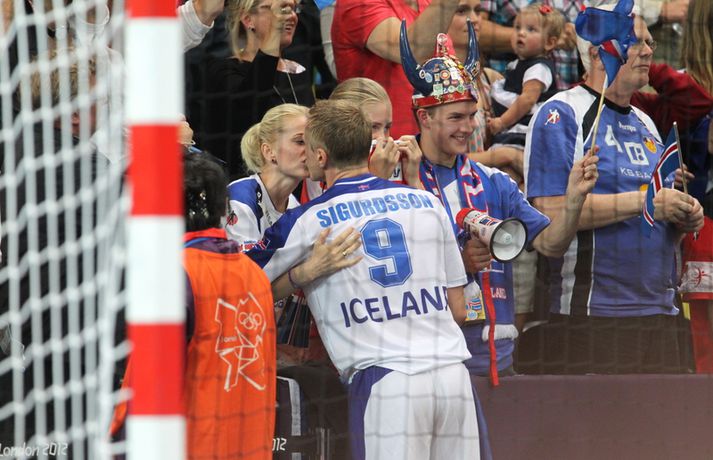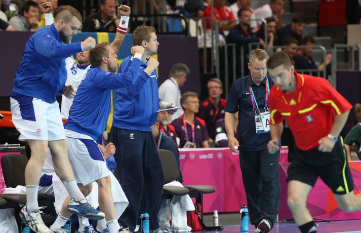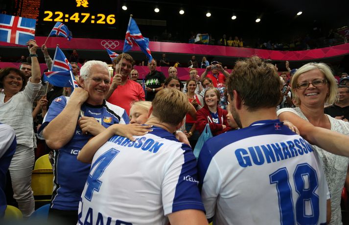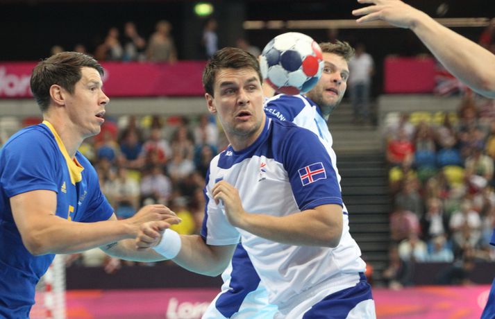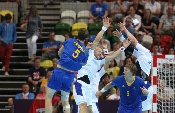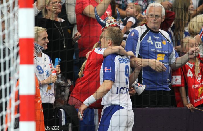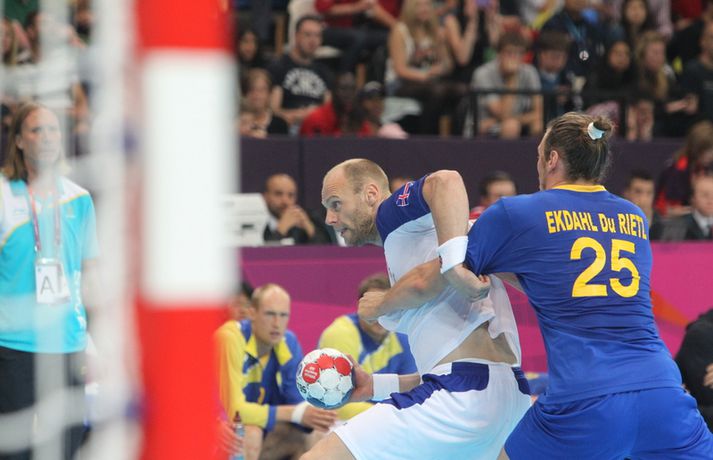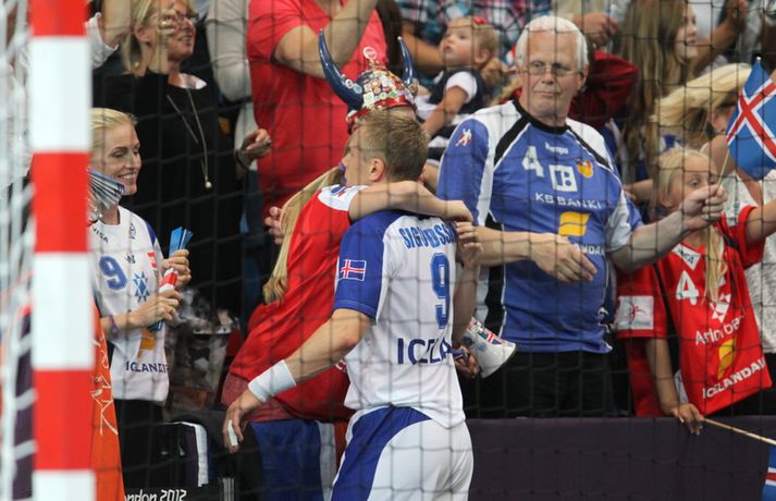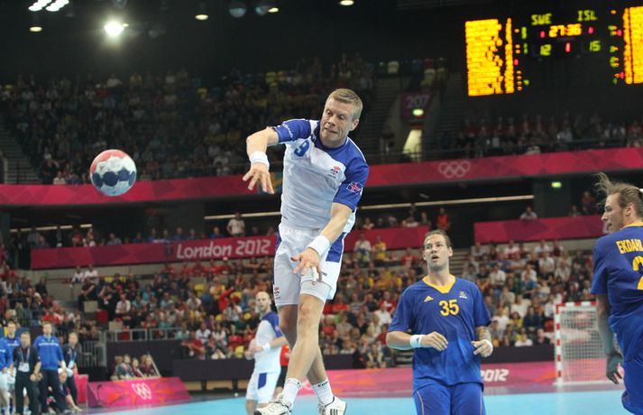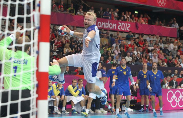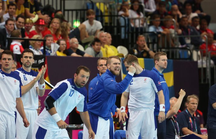 Íslenska karlalandsliðið í handknattleik vann í kvöld langþráðan sigur á Svíum á stórmóti í handknattleik. Sigurinn var þó mun tæpari en hann hefði þurft að vera en strákarnir okkar sluppu með skrekkinn undir lokin. Íslenskir stuðningsmenn voru líklega færri en þeir sænsku í Koparhöllinni í London í kvöld en létu þó vel í sér heyra. Þeir urðu líka vitni að sögulegum sigri en Ísland hafði ekki lagt Svía að velli í níu viðureignum þjóðanna á stórmóti. Síðast vannst sigur á Svíum á HM í Tékkóslóvakíu 1964 12-10. Eins og lokatölurnar gefa til kynna hefur margt breyst í handboltanum síðan þá og til marks um hve langþráður sigurinn í dag var. Valgarður Gíslason, ljósmyndari Fréttablaðsins og Vísis, varð þess heiðurs aðnjótandi að fylgjast með leiknum í kvöld og náði þessum fínu myndum.
