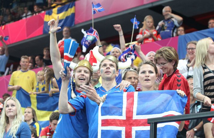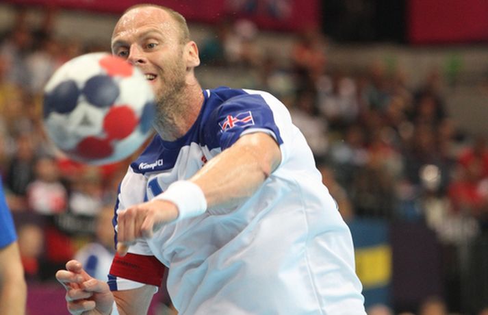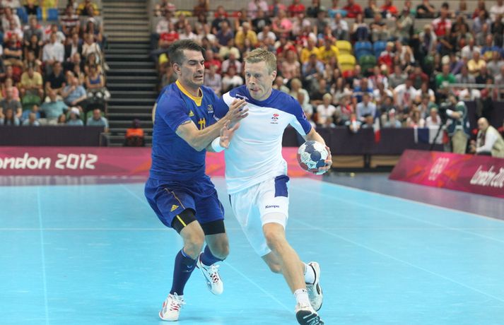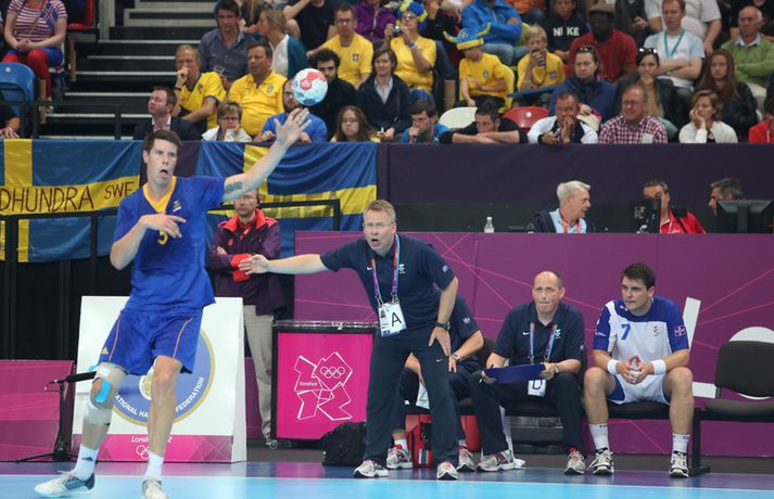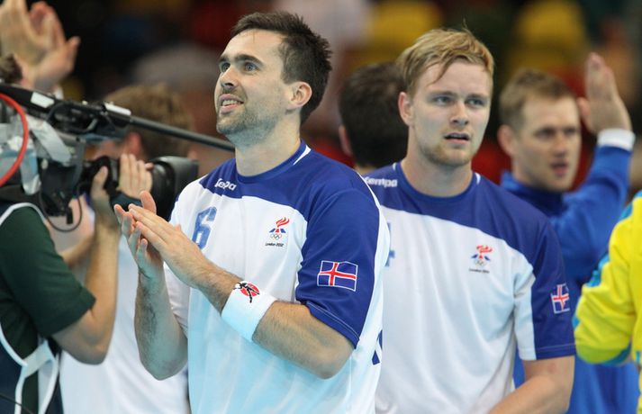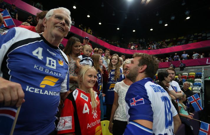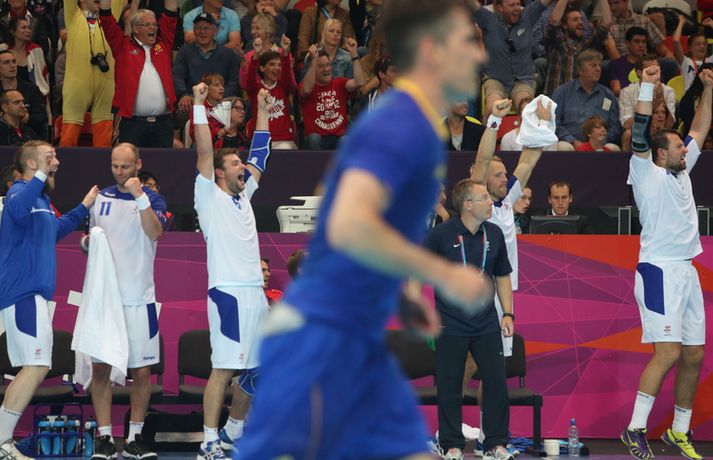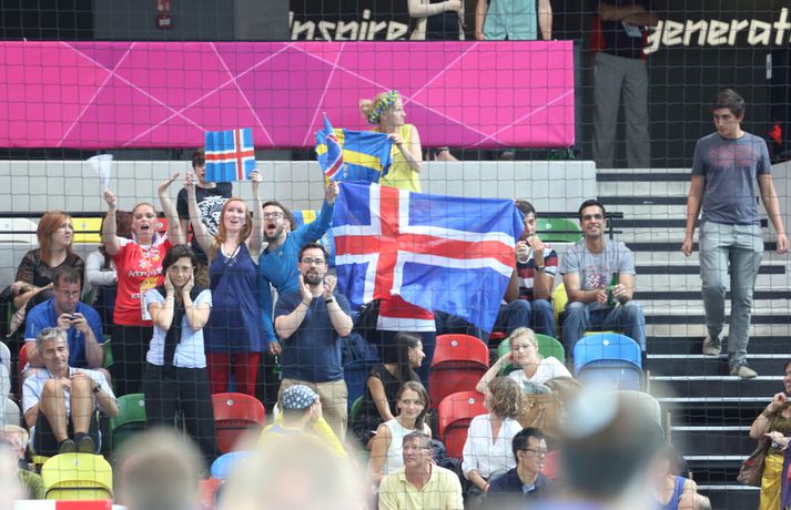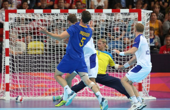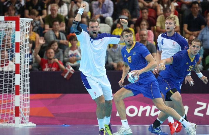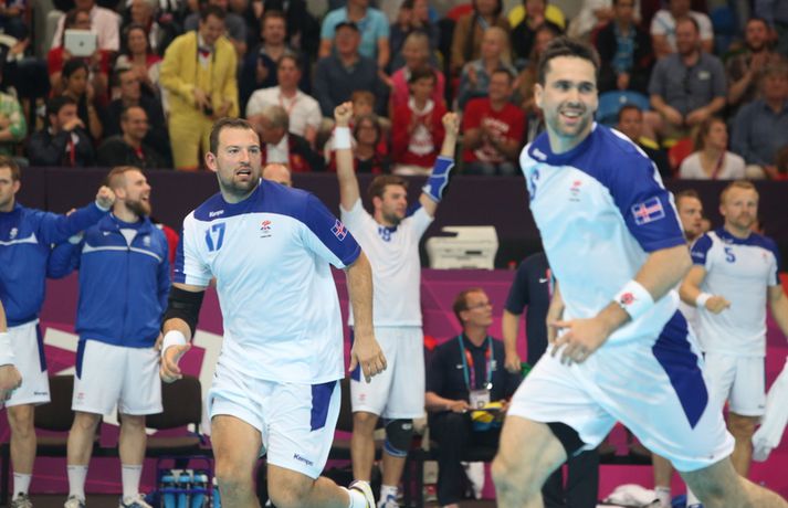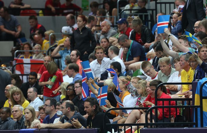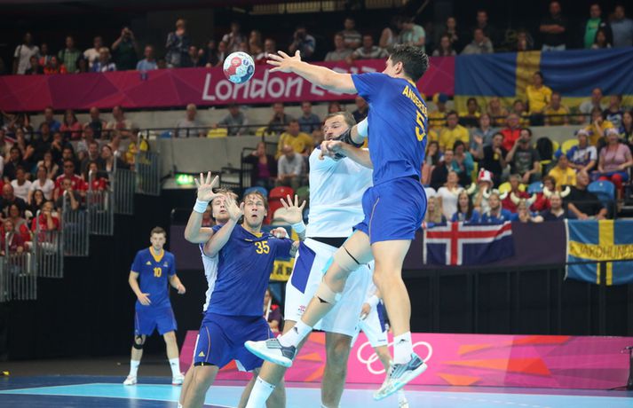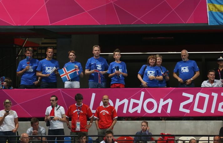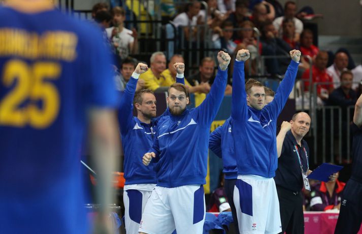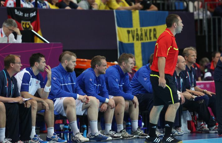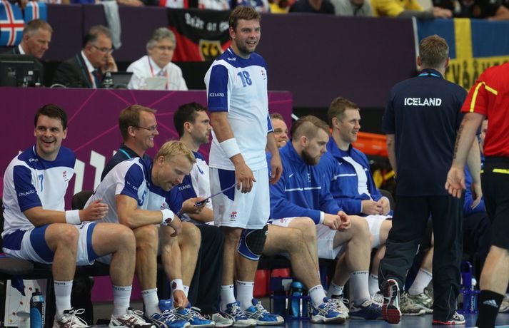 Íslenska karlalandsliðið í handknattleik vann í kvöld langþráðan sigur á Svíum á stórmóti í handknattleik. Sigurinn var þó mun tæpari en hann hefði þurft að vera en strákarnir okkar sluppu með skrekkinn undir lokin. Íslenskir stuðningsmenn voru líklega færri en þeir sænsku í Koparhöllinni í London í kvöld en létu þó vel í sér heyra. Þeir urðu líka vitni að sögulegum sigri en Ísland hafði ekki lagt Svía að velli í níu viðureignum þjóðanna á stórmóti. Síðast vannst sigur á Svíum á HM í Tékkóslóvakíu 1964 12-10. Eins og lokatölurnar gefa til kynna hefur margt breyst í handboltanum síðan þá og til marks um hve langþráður sigurinn í dag var. Valgarður Gíslason, ljósmyndari Fréttablaðsins og Vísis, varð þess heiðurs aðnjótandi að fylgjast með leiknum í kvöld og náði þessum fínu myndum.