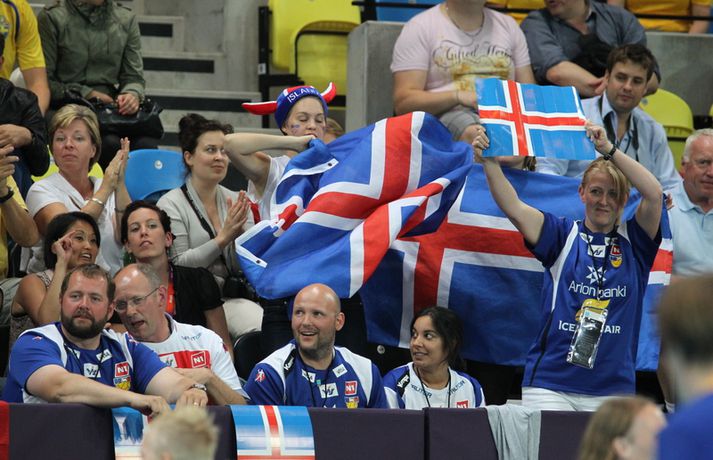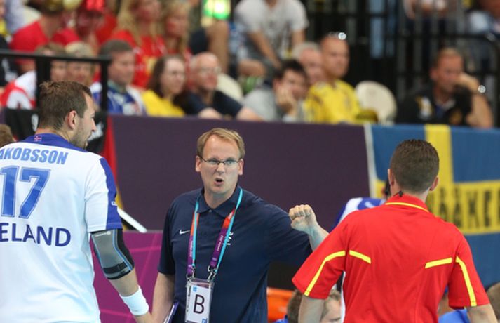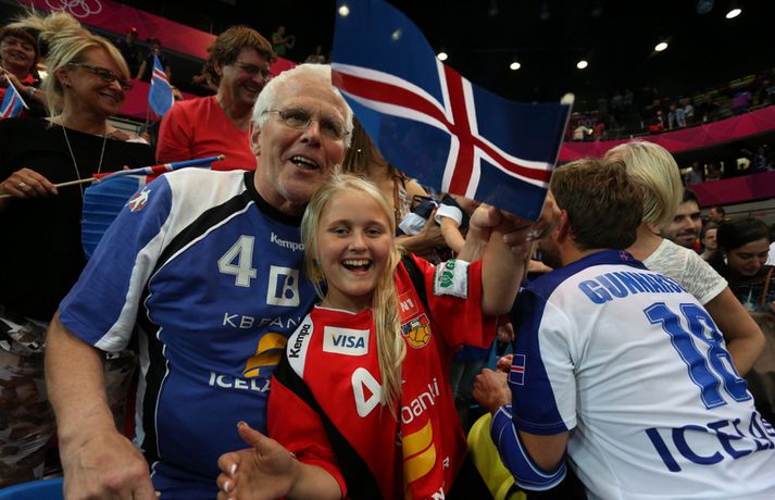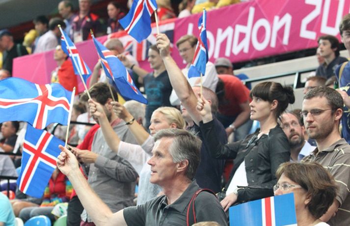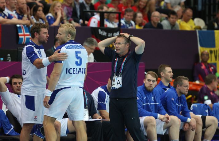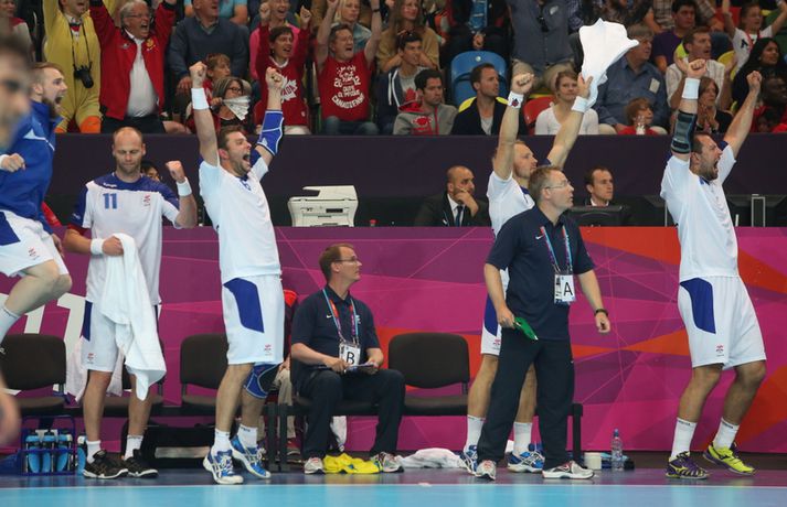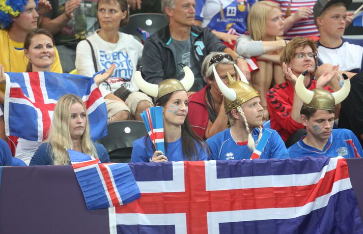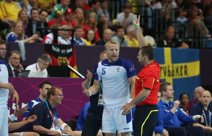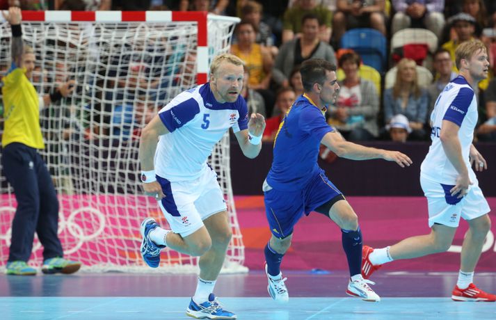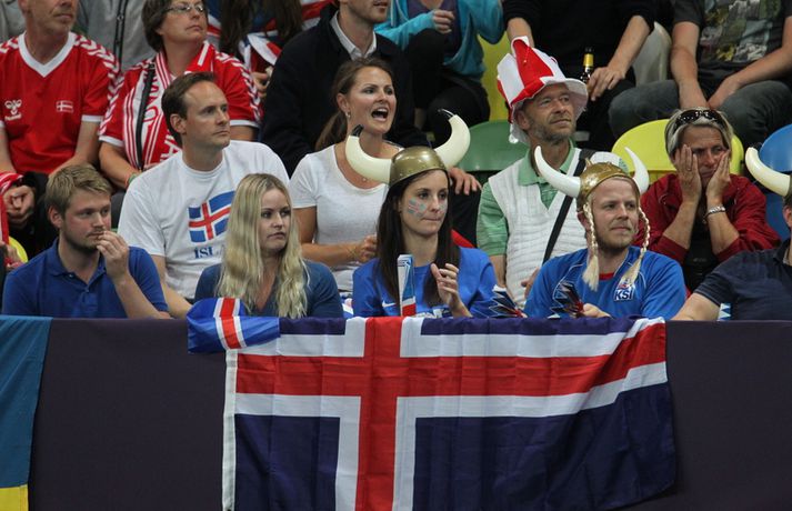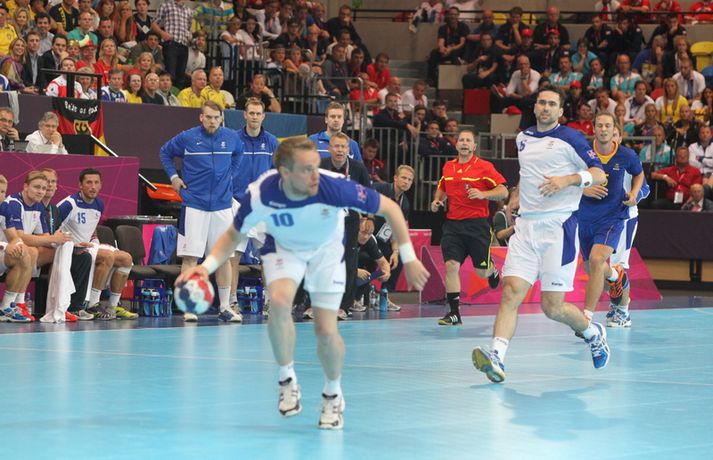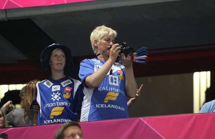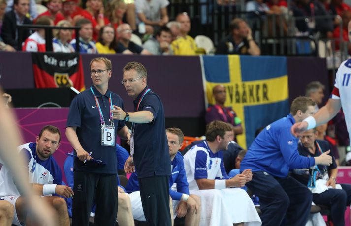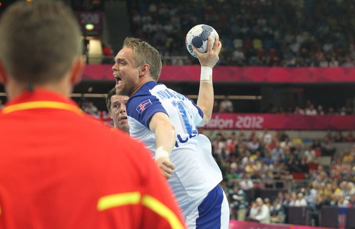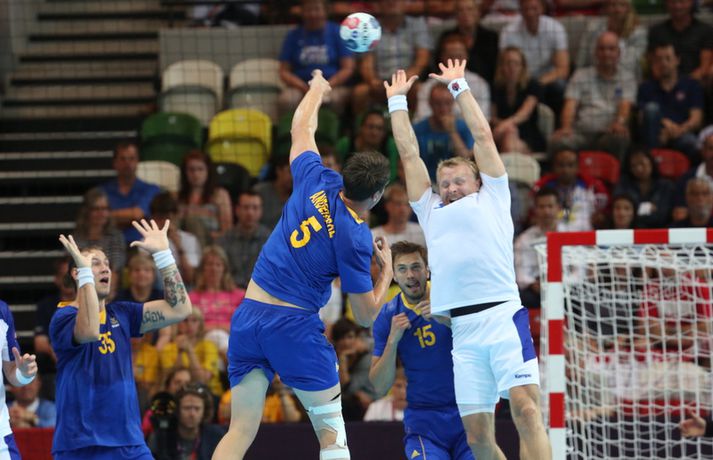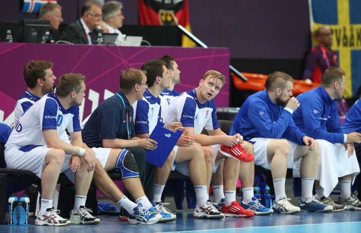 Íslenska karlalandsliðið í handknattleik vann í kvöld langþráðan sigur á Svíum á stórmóti í handknattleik. Sigurinn var þó mun tæpari en hann hefði þurft að vera en strákarnir okkar sluppu með skrekkinn undir lokin. Íslenskir stuðningsmenn voru líklega færri en þeir sænsku í Koparhöllinni í London í kvöld en létu þó vel í sér heyra. Þeir urðu líka vitni að sögulegum sigri en Ísland hafði ekki lagt Svía að velli í níu viðureignum þjóðanna á stórmóti. Síðast vannst sigur á Svíum á HM í Tékkóslóvakíu 1964 12-10. Eins og lokatölurnar gefa til kynna hefur margt breyst í handboltanum síðan þá og til marks um hve langþráður sigurinn í dag var. Valgarður Gíslason, ljósmyndari Fréttablaðsins og Vísis, varð þess heiðurs aðnjótandi að fylgjast með leiknum í kvöld og náði þessum fínu myndum.