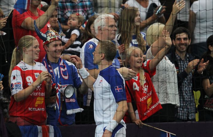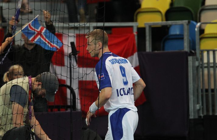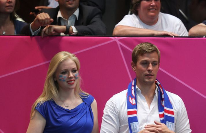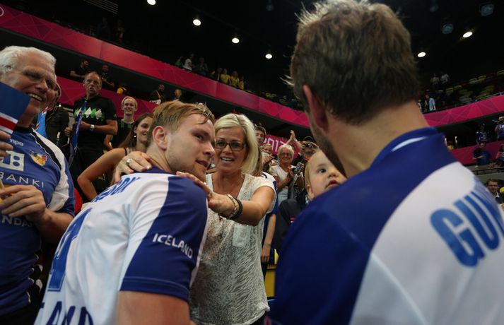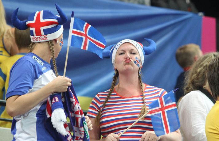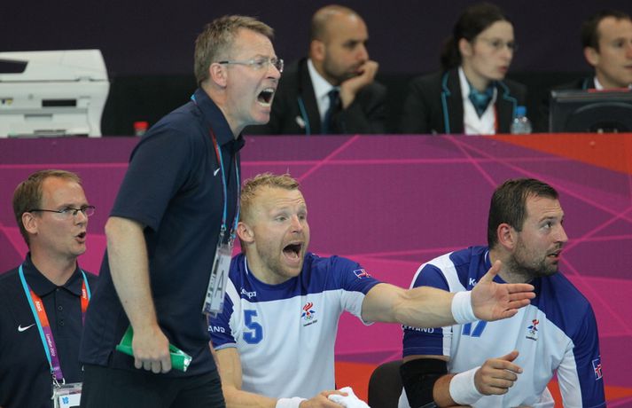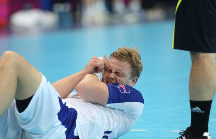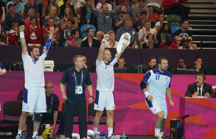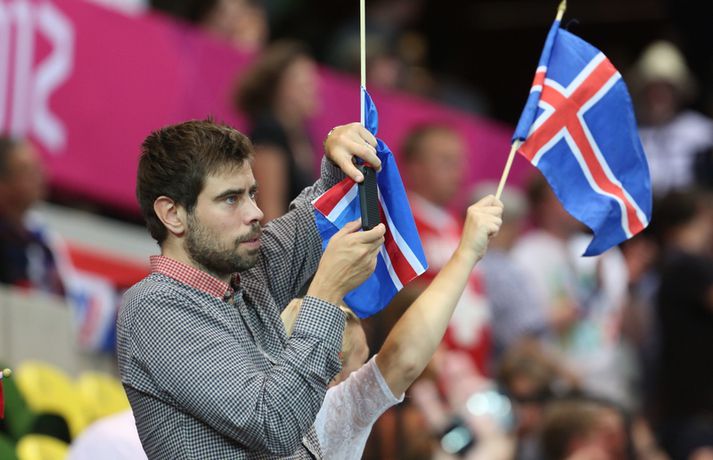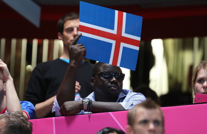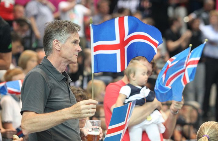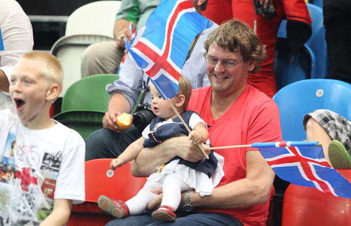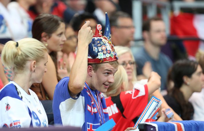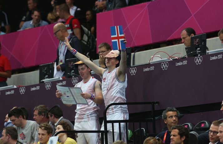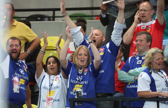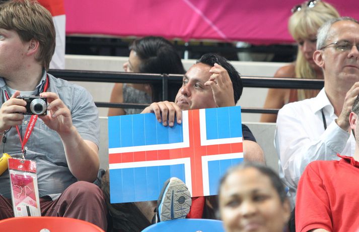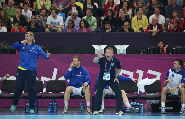 Íslenska karlalandsliðið í handknattleik vann í kvöld langþráðan sigur á Svíum á stórmóti í handknattleik. Sigurinn var þó mun tæpari en hann hefði þurft að vera en strákarnir okkar sluppu með skrekkinn undir lokin. Íslenskir stuðningsmenn voru líklega færri en þeir sænsku í Koparhöllinni í London í kvöld en létu þó vel í sér heyra. Þeir urðu líka vitni að sögulegum sigri en Ísland hafði ekki lagt Svía að velli í níu viðureignum þjóðanna á stórmóti. Síðast vannst sigur á Svíum á HM í Tékkóslóvakíu 1964 12-10. Eins og lokatölurnar gefa til kynna hefur margt breyst í handboltanum síðan þá og til marks um hve langþráður sigurinn í dag var. Valgarður Gíslason, ljósmyndari Fréttablaðsins og Vísis, varð þess heiðurs aðnjótandi að fylgjast með leiknum í kvöld og náði þessum fínu myndum.