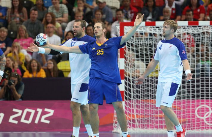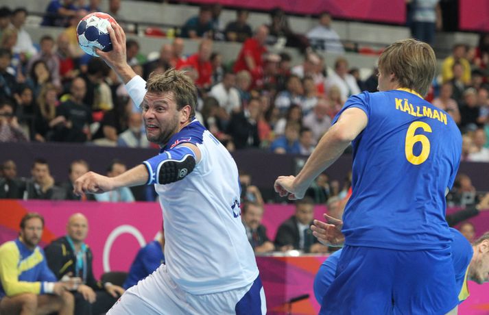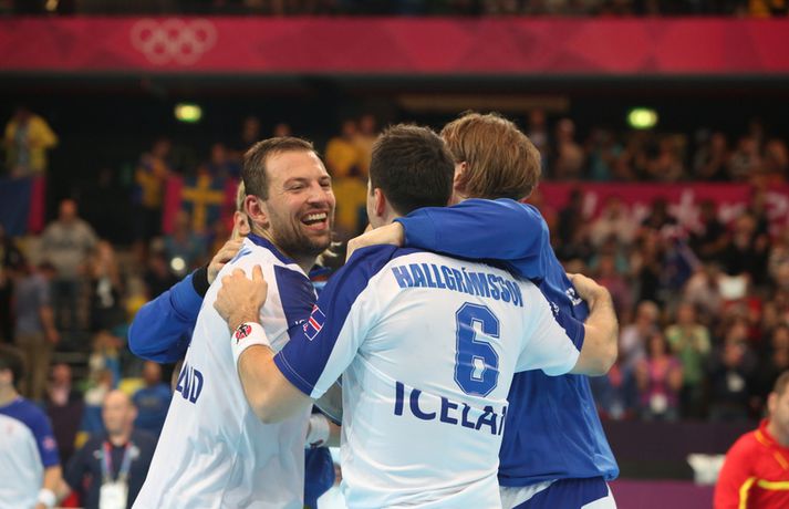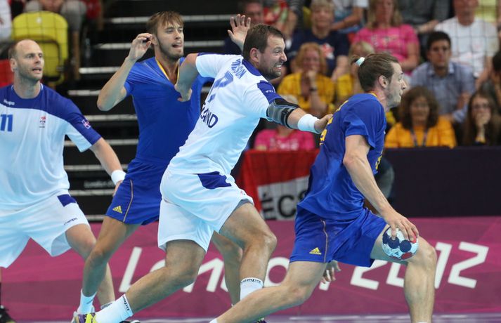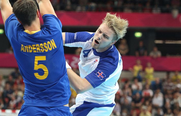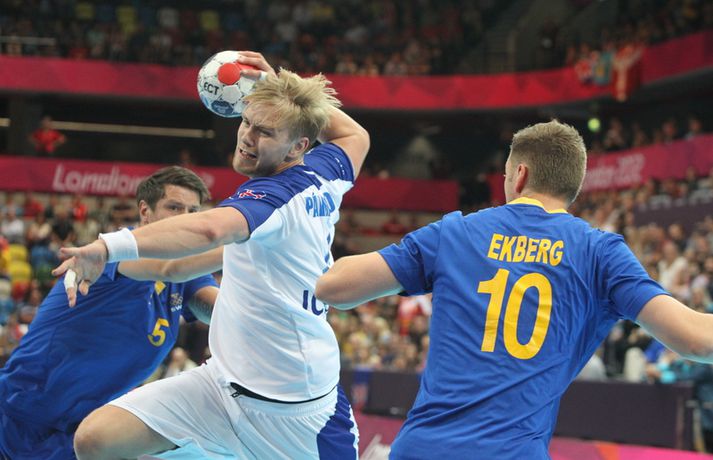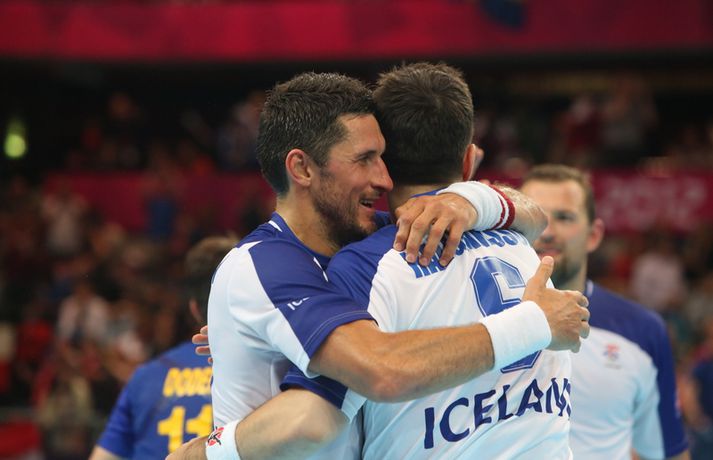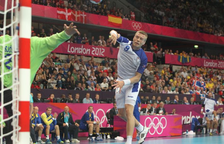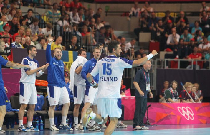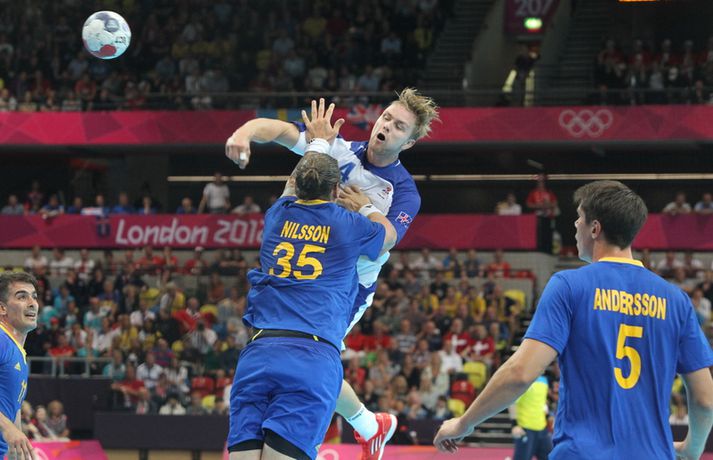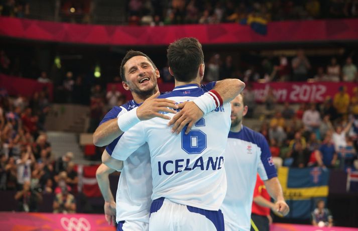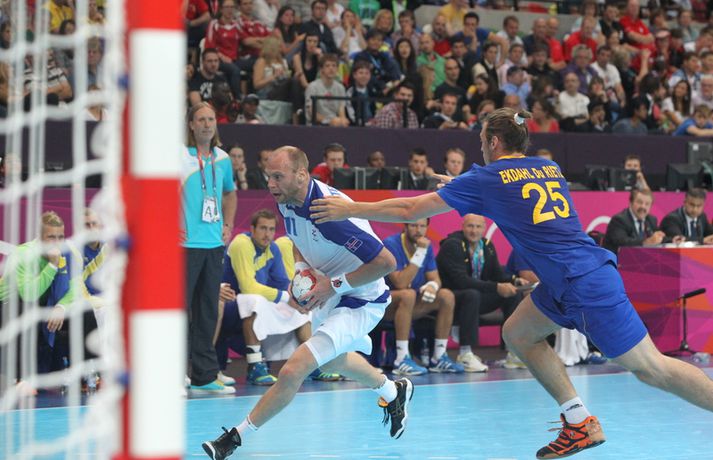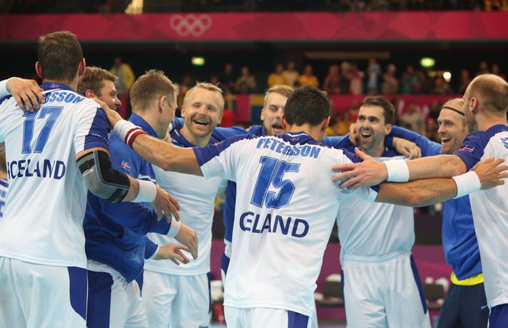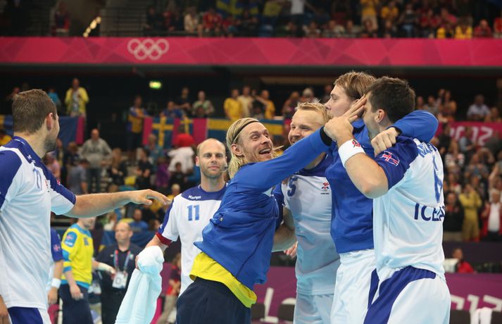 Hundrað myndir af sögulegum sigri Íslendinga Kolbeinn Tumi Daðason skrifar 2. ágúst 2012 23:33 Alexander Petersson faðmar Ásgeir Örn Hallgrímsson sem innsiglaði sigur Íslands í kvöld. Mynd/Valli Íslenska karlalandsliðið í handknattleik vann í kvöld langþráðan sigur á Svíum á stórmóti í handknattleik. Sigurinn var þó mun tæpari en hann hefði þurft að vera en strákarnir okkar sluppu með skrekkinn undir lokin. Íslenskir stuðningsmenn voru líklega færri en þeir sænsku í Koparhöllinni í London í kvöld en létu þó vel í sér heyra. Þeir urðu líka vitni að sögulegum sigri en Ísland hafði ekki lagt Svía að velli í níu viðureignum þjóðanna á stórmóti. Síðast vannst sigur á Svíum á HM í Tékkóslóvakíu 1964 12-10. Eins og lokatölurnar gefa til kynna hefur margt breyst í handboltanum síðan þá og til marks um hve langþráður sigurinn í dag var. Valgarður Gíslason, ljósmyndari Fréttablaðsins og Vísis, varð þess heiðurs aðnjótandi að fylgjast með leiknum í kvöld og náði þessum fínu myndum. Handbolti Mest lesið Ekkert bit í snáknum: „Hörmulegur og ætti að hætta“ Sport Stoltur af stráknum en ætlar ekki að kaupa hann aftur Handbolti „Þú birtir falsfrétt um mig, þú ert í banni“ Fótbolti United horfir til Þýskalands eftir höfnun Semenyo Enski boltinn Haaland stóðst vigtun eftir jólin Enski boltinn Goðsögn fallin frá Enski boltinn Þessi tíu eru tilnefnd sem Íþróttamaður ársins 2025: 23 ára aldursmunur Sport Zidane sá soninn spila á Afríkumótinu Fótbolti Kynntu Sigurð á slaginu sex á aðfangadag Íslenski boltinn „Ég elska peninga“ Sport Fleiri fréttir Stoltur af stráknum en ætlar ekki að kaupa hann aftur Ekkert spilað í vetur en gæti mætt Íslandi í fyrsta leik á EM Arnar Daði rekinn frá Stjörnunni en áfram þjálfari kvennaliðsins Öll höllin æpti nafn Gísla í spennutrylli Sakaður um niðurlægingu: „Við viljum ekki hafa hann sem þjálfara“ Haukur getur náð hundrað plús hundrað fyrir EM-fríið Rúnar sótti sinn fyrsta sigur sem þjálfari Wetzlar Haukur með sjö mörk og Magdeburg rétt marði botnliðið Rúmlega áttræður Moustafa endurkjörinn forseti IHF með yfirburðum Slæm fjárhagsstaða HSÍ kemur ekki niður á EM Donni fagnaði EM vali með skotsýningu Sigvaldi Björn fjarri góðu gamni í sjaldséðu tapi Kolstad Eva Björk með stórleik í fyrsta sigri Stjörnunnar „Hann er ein stærsta ástæðan fyrir því“ KA-menn fengu góða jólagjöf Flautumark hjá FH og ÍR með þeim í Höllina KA í undanúrslit á kostnað bikarmeistaranna Stærsti leikur ársins í Eyjum fer fram í kvöld „Er því miður kominn í jólafrí“ „Þetta var mjög skrítinn leikur“ Haukakonur í fjórða sætið KA/Þór - Valur 23-30 | Ótrúlegur viðsnúningur gestanna Ómar óstöðvandi og Magdeburg í undanúrslit Ómar Ingi fær meiri ábyrgð og tekur við kyndlinum af Aroni Ekkert stríð við Porto og einstakur Þorsteinn nítjándi maður Síðasta verkefni reyndist dýrt fyrir Sigvalda Teitur fer á EM sem hornamaður í stað Sigvalda Snorri kynnti EM-strákana okkar Hleyptu Þorsteini ekki heim og vilja ekki að hann fari á EM Kári og Logi vilja henda Ými út úr landsliðinu Sjá meira
