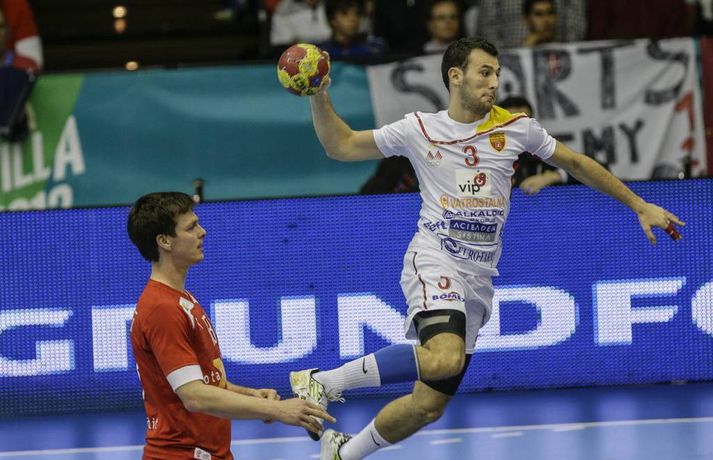 Nú er ljóst að Ísland mun mæta heims- og Ólympíumeisturum Frakklands í 16-liða úrslitum HM í handbolta. Leikurinn fer fram í Barcelona á sunnudag og hefst klukkan 19.15. Þetta varð niðurstaðan eftir að Danmörk hafði betur gegn Makedóníu í lokaleik B-riðils í kvöld, 33-30. Ísland endar í þriðja sæti riðilsins. Fyrirfram bjuggust flestir við því að Ísland myndi sleppa við Frakka í 16-liða úrslitunum, ef strákarnir ynnu Katar og Danir hefðu betur gegn Makedóníu - sem varð svo raunin. Hins vegar tapaði Frakkland heldur óvænt fyrir Þýskalandi fyrr í dag og þeir þýsku hirtu um leið toppsæti A-riðils. Þá var ljóst í hvað stefndi fyrir strákana okkar. Makedónía stóð reyndar lengi vel í Dönum og gott betur. Staðan í hálfleik var 14-13, Makedóníu í vil, sem hélt frumkvæðinu lengi vel í síðari hálfleik. En leikurinn breyttist þegar stundarfjórðungur var eftir og Danir gáfu í. Þeir skoruðu fimm mörk í röð og létu þá forystu aldrei af hendi. Allir útileikmenn Dana nema einn komust á blað í dag og báðir markverðir fengu að spila. Markahæstur var Mikkel Hansen með fimm mörk en hjá Makedóníu skoruðu Lazarov-bræðurnir Kiril og Filip Lazarov fimm mörk hvor.