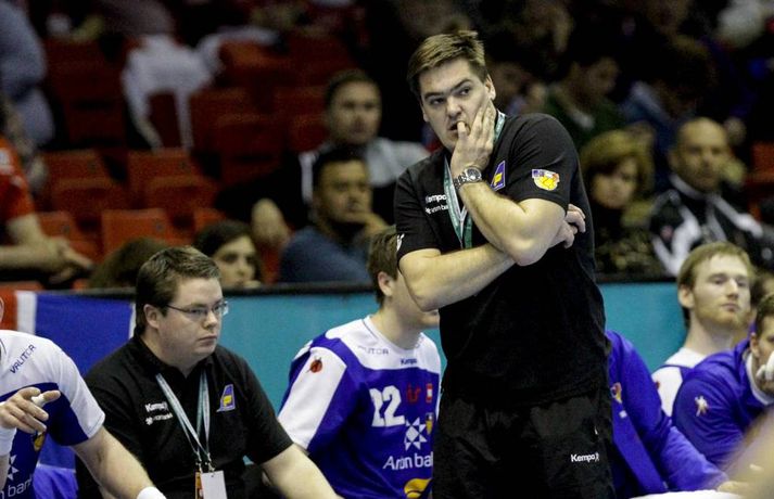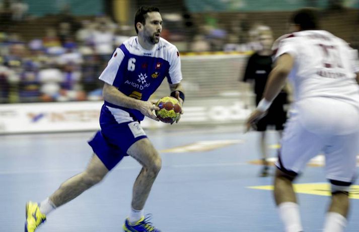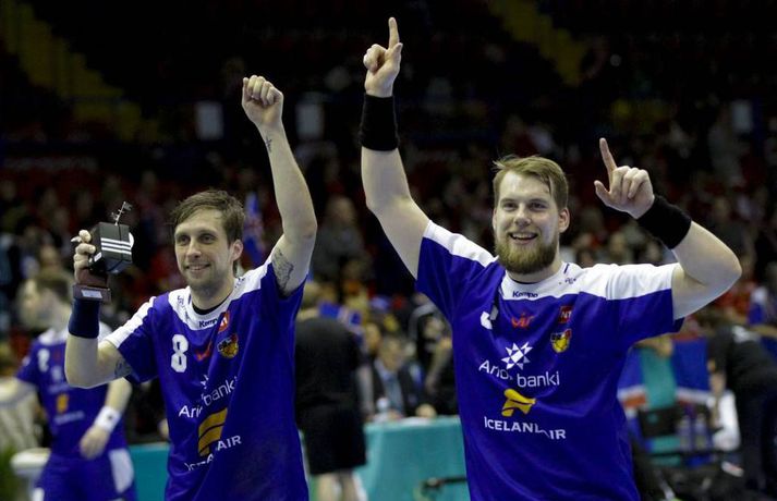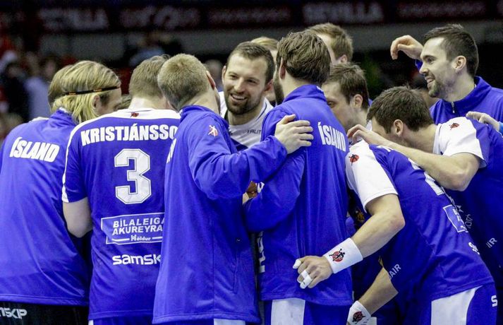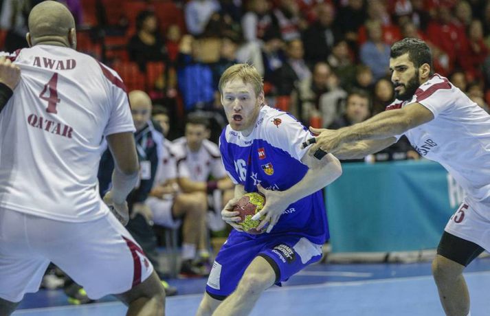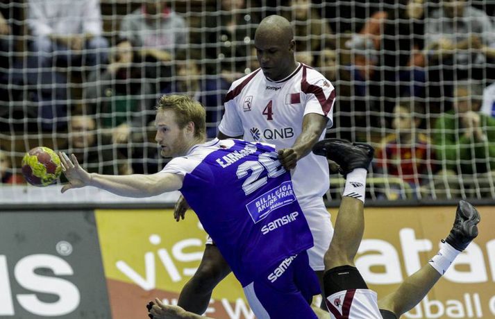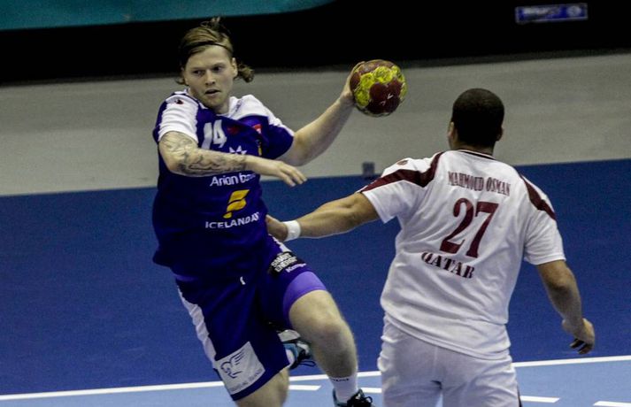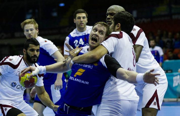 Leik lokið: Ísland - Katar 39-29 | Öruggir í 16 liða úrslitin Sigurður Elvar Þórólfsson í Sevilla skrifar 18. janúar 2013 10:47 Íslendingar áttu ekki í vandræðum með að landa tíu marka sigri, 39-29, gegn Katar í lokaleik Íslands í B-riðli heimsmeistaramótsins í handbolta í Sevilla í kvöld. Staðan var 20-15 í hálfleik og sigurinn var aldrei í hættu. Guðjón Valur Sigurðsson var markahæsti leikmaður Íslands með 10 mörk og Þórir Ólafsson skoraði 9. Þegar þetta er skrifað er ekki vitað hver mótherji Íslands í 16-liða úrslitunum verður en það veltur á úrslitum í leik Danmerkur og Makedóníu sem nú stendur yfir. Frakkar eru líklegustu mótherjarnir en Makedónía getur valið sér mótherja – með sigri mæta þeir Frökkum en Þjóðverjum ef þeir tapa. Aron Kristjánsson gerði þrjár breytingar á byrjunarliðinu; Aron Rafn Eðvarsson byrjaði í markinu og hann varði alls 14 skot, flest í síðari hálfleik, Róbert Gunnarsson byrjaði á línunni í sókninni, og Þóri Ólafsson kom inn í hægra hornið á ný eftir að hafa hvílt gegn Dönum. Það tók Íslendinga um 15 mínútur að hrista slakt lið Katar af sér. Ísland náði tveggja marka forskoti eftir 14 mínútur þegar staðan var 9-7 og íslensku strákarnir litu aldrei um öxl eftir það. Staðan var 15-10 í hálfleik og í þeim síðari breyttist lítið – lokatölur 39-29. Þórir Ólafsson og Guðjón Valur Sigurðsson drógu vagninn í sóknarleiknum og skoruðu alls 19 mörk. Aron Pálmarsson hafði frekar hægt um sig og skoraði 3 mörk en hann tók aðeins 4 skot í leiknum – og fékk hann góða hvíld þegar Ólafur Gústafsson leysti hann af. Ólafur skoraði alls 4 mörk en hann var lengi í gang en fann sig þegar á leið. Róbert Gunnarsson skoraði 1 mark en hann virðist vera ná sér eftir meiðslin sem hann varð fyrir í fyrsta leiknum gegn Rússum. Leikurinn gegn Katar fer ekki í sögubækurnar fyrir spennu og tilþrif. Skyldusigur sögðu leikmenn Íslands fyrir og eftir leik. Katar á enn langt í land með sitt lið en þeir verða gestgjafar á næst heimsmeistaramóti sem fram fer eftir tvö ár.Aron: Áttum von á baráttuleik Aron Kristjánsson, þjálfari íslenska landsliðsins, var ánægður með margt í leik Íslands gegn Katar í dag. „Við vissum að þeir myndu selja sig dýrt. Þeir börðust og það tók tíma að hrisa þá af sér," sagði Aron í samtali við Arnar Björnsson eftir leikinn í dag. „En sem betur fer náðu við góðri forystu í hálfleik og komust svo fljótlega í þægilega forystu í þeim síðari." „Ég var ánægður með sóknarleikinn og hraðaupphlaupin í dag. Við fengum mikið af færum, sama hvernig við spiluðum. Ég hefði viljað fá betri vörn og markvörslu í fyrri hálfleik, en Aron kom sterkur inn í síðari hálfleik." Ekki lá fyrir hver næsti andstæðingur Íslands yrði þegar viðtalið var tekið. „Við tökum bara því liði sem við fáum í 16-liða úrslitunum," sagði Aron.Þórir: Aðalmálið að vinna Þórir Ólafsson var valinn maður leiksins gegn Katar í dag en hann skoraði níu mörk í leiknum, sem er persónulegt met á stórmóti. „Við vorum að spila vel í dag. Okkur tókst að opna hornið oft og nýttum hraðaupphlaupin vel, sem er gaman," sagði Þórir í samtali við Arnar Björnsson eftir leikinn. „Það er auðvitað alltaf gaman að skora en við ætluðum fyrst og fremst að vinna leikinn. Það tókst og er númer eitt." „Við eru mnú búnir að gera okkar í dag og svo sjáum við til hvað gerist. Ég á ekki óskamótherja en við tökum því sem kemur."Guðjón Valur: Þeir héldu ekki í við okkur Guðjón Valur Sigurðsson segir að sama hver næsti andstæðingur Íslands verði sé ljóst að strákarnir muni mæta klárir til leiks. Ísland vann Katar í dag og tryggði sér þar með sæti í 16-liða úrslitum keppninnar. Andstæðingur Íslands verður Frakkland, ef Danmörk vinnur Makedóníu í kvöld. „Þetta var eins og ég bjóst við. Þetta var erfiður og leiðinlegur fyrri hálfleikur. Við vorum pirraðir og þeir fengu að spila langar sóknir," sagði Guðjón Valur við Arnar Björnsson eftir leikinn. „En svo náðum við að keyra upp hraðann og þeir náðu ekki að halda í við okkur. Við breyttum í 5-1 vörn í seinni hálfleik til að rugla taktinn hjá þeim. Það gekk ágætlega og um leið og við komumst 5-6 mörkum yfir var þetta aldrei spurning." „Ég myndi helst vilja sleppa við Frakkana en í raun er mér alveg sama. En ef við fáum Frakkana þá verðum við tilbúnir í þann slag. Við verðum bara að bíða og sjá til."Vignir: Þetta hafðist „Þetta var ekki okkar besti leikur í dag en þetta hafðist. Aðalmálið var að vinna leikinn," sagði varnarmaðurinn Vignir Svavarsson eftir sigurinn á Katar í dag. Vignir sagði í viðtali við Arnar Björnsson eftir leik að íslenska liðið geti spilað betri varnarleik en í dag. „Ég held samt að vörnin sé ekki vandamál hjá okkur. Við getum alltaf gert betur, eins og í öllum leikjum. Þetta er einfaldlega verkefni sem við þurfum að leysa - þetta er ekki vandamál." Það kemur í ljós í kvöld hvaða lið mætir Íslandi í 16-liða úrslitum keppninnar. „Mér er alveg sama um næsta mótherja. Þetta verður bikarkeppni og við munu mæta trylltir til leiks og gera allt til að vinna hann - sama hverjum við mætum." „Við erum klárir í næsta leik og verður spennandi að sjá hverja við fáum. Nú förum við í langt ferðalag á morgun og munum hefja undirbúning strax í kvöld."Sverre: Gerðum nóg til að vinna Sverre Jakobsson, leikmaður Íslands, var ánægður með að sæti Íslands í 16-liða úrslitum HM í handbolta væri tryggt. Ísland vann Katar í lokaumferð riðlakeppninnar í dag og kemur í ljós síðar í kvöld hvaða andstæðingur bíður í 1