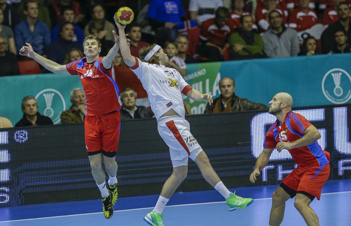 HM 2013 | Danir höfðu betur gegn Rússum Eiríkur Stefán Ásgeirsson skrifar 13. janúar 2013 20:46 Myndir / Vilhelm Gunnarsson Danir unnu í kvöld góðan sigur á Rússum, 31-27, í B-riðli HM í handbolta í kvöld. Danmörk er því með fullt hús stiga eftir fyrstu tvo leikina í Sevilla. Danir byrjuðu betur og náðu snemma ágætri forystu. En Rússar komu til baka og var munurinn í hálfleik eitt mark, 14-13. Jafnræði var með liðunum framan af seinni hálfleik en Danir náðu að síga fram úr á lokakaflanum og tryggja sér sigur. Niklas Landin átti stórleik í marki Dana og varði oft á tíðum glæsilega. Nikolaj Markussen átti einnig góðan leik og skoraði sex mörk. Markahæstur hjá Rússum var Timur Dibirov með sjö mörk. Danmörk og Makedónía eru á toppi B-riðils með fjögur stig en Ísland og Rússland eru með tvö. Ísland mætir Makedóníu á þriðjudag.Úrslit, staða og næstu leikir á HM 2013. Mest lesið Þreytt á umræðu um líkamann sinn: „Á ekki að tjá sig um það“ Sport Hneysklaður á ósönnum orðrómum Fótbolti Ekkja Jota þakklát: „Hefur meiri þýðingu en orð geta lýst“ Enski boltinn Hættir ekki fyrr en hann skorar þúsund mörk Fótbolti Yfirgefur Keflavík vegna komu Martins Körfubolti Skynjar stress hjá Arsenal Enski boltinn Segja að Wirtz græði á fjarveru Salah: „Sé hann fljúga í gang“ Enski boltinn Enn kvarnast úr liði Blika Íslenski boltinn Ótrúleg tölfræði Jokic Körfubolti Dagskráin í dag: Pílukast og Íslandsmeistarar Sport Fleiri fréttir Óðinn bikarmeistari fjórða árið í röð Kolstad tapaði bikarúrslitaleiknum í vítakeppni Segir starfið í húfi hjá Alfreð Haukur náði hundrað og hundrað fyrir EM Íslendingarnir í miklum ham fyrir EM Handarbrotinn og missir af úrslitaleiknum Reynir farinn að láta til sín taka í þýsku deildinni Elín Klara atkvæðamikil og sigursæl í jólaleiknum Birgir byrjaði rólega eftir jólafrí en fagnaði sigri Stoltur af stráknum en ætlar ekki að kaupa hann aftur Ekkert spilað í vetur en gæti mætt Íslandi í fyrsta leik á EM Arnar Daði rekinn frá Stjörnunni en áfram þjálfari kvennaliðsins Öll höllin æpti nafn Gísla í spennutrylli Sakaður um niðurlægingu: „Við viljum ekki hafa hann sem þjálfara“ Haukur getur náð hundrað plús hundrað fyrir EM-fríið Rúnar sótti sinn fyrsta sigur sem þjálfari Wetzlar Haukur með sjö mörk og Magdeburg rétt marði botnliðið Rúmlega áttræður Moustafa endurkjörinn forseti IHF með yfirburðum Slæm fjárhagsstaða HSÍ kemur ekki niður á EM Donni fagnaði EM vali með skotsýningu Sigvaldi Björn fjarri góðu gamni í sjaldséðu tapi Kolstad Eva Björk með stórleik í fyrsta sigri Stjörnunnar „Hann er ein stærsta ástæðan fyrir því“ KA-menn fengu góða jólagjöf Flautumark hjá FH og ÍR með þeim í Höllina KA í undanúrslit á kostnað bikarmeistaranna Stærsti leikur ársins í Eyjum fer fram í kvöld „Er því miður kominn í jólafrí“ „Þetta var mjög skrítinn leikur“ Haukakonur í fjórða sætið Sjá meira