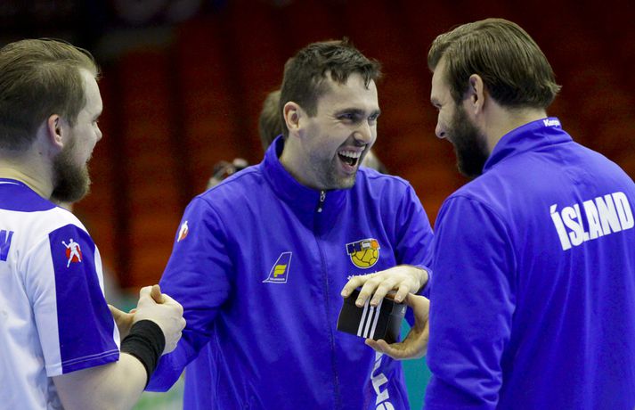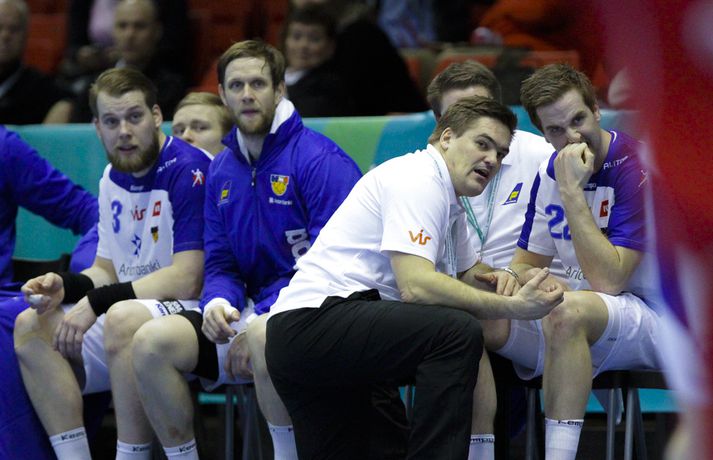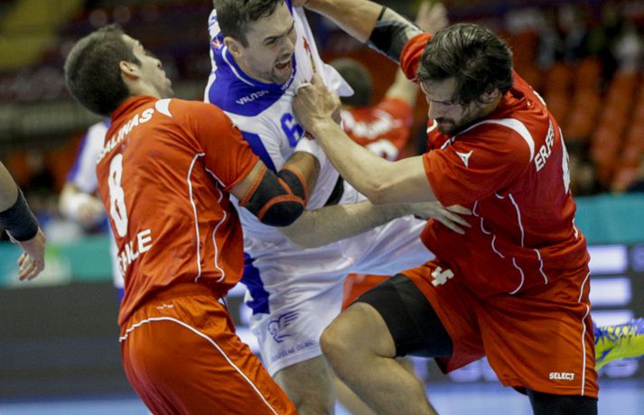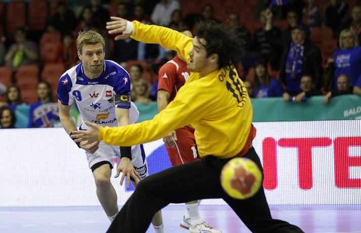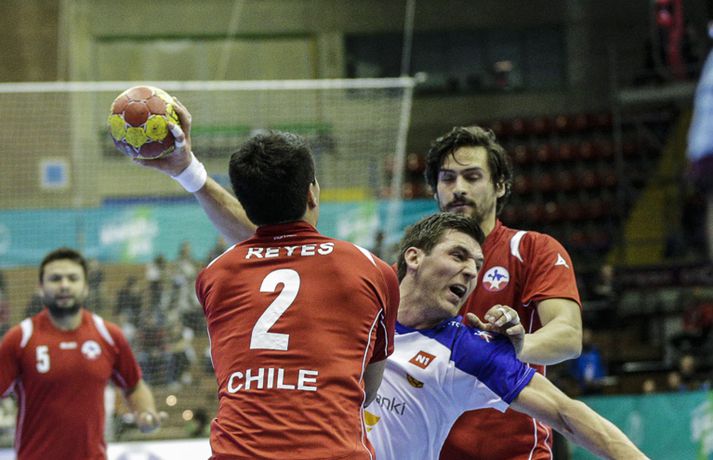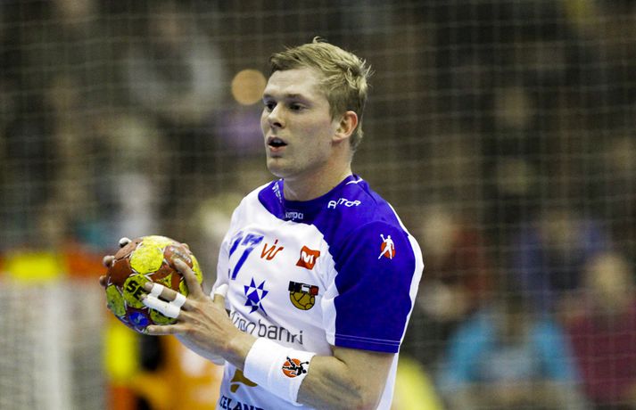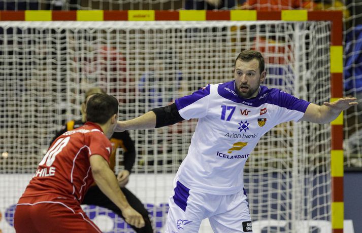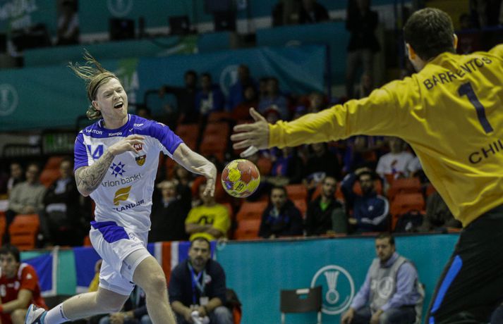 Íslenska karlalandsliðið í handbolta landaði öruggum 38-22 sigri gegn liði Síle í B-riðli heimsmeistaramótsins sem fram fer á Spáni. Það tók íslenska liðið um 20 mínútur að hrista Síle af sér og Aron Kristjánsson þjálfari liðsins nýtti tækifærið og lét yngri leikmenn liðsins draga vagninn í síðari hálfleik. Hornamaðurinn Arnór Þór Gunnarsson var markahæstur í liði Íslands með alls 7 mörk en hann var í byrjunarliðinu í stað Þóris Ólafssonar. Eftir tapleikinn gegn Rússum í fyrsta leik mótsins lýsti Aron Kristjánsson eftir meira púðri frá hægri væng liðsins í sóknarleiknum. Arnór Þór og Ásgeir Örn Hallgrímsson tóku hann á orðinu og létu vita af sér frá fyrstu mínútu. Arnór skoraði tvö mörk snemma og kom sér inn í leikinn. Ásgeir Örn Hallgrímsson skoraði sitt fyrsta mark eftir fimm mínútur, og ætlaði sér meira en gegn Rússum. Ásgeir Örn var valinn maður leiksins af dómnefnd í leikslok en hann skoraði alls 4 mörk úr 5 skottilraunum. Björgvin Páll Gústavsson byrjaði í markinu og ætlaði sér stóra hluti eftir að hafa verið settur á bekkinn fyrir leikinn gegn Rússum. Björgvin byrjaði ágætlega, varði vítaskot, en Björgvin varði alls 6 skot á þeim 24 mínútum sem hann lék. Rene Oliva, markvörður Síle, náði að stöðva nokkur skot frá íslenska liðinu – hélt þeim á floti fyrstu 20 mínúturnar þegar staðan var 10-9 fyrir Ísland. Smátt og smátt náði íslenska liðið tökum á leiknum þrátt fyrir að lykilmaður á borð við Aron Pálmarssin hafi skorað sitt fyrsta mark eftir 19 mínútur. Alls skoraði Aron 2 mörk en hann tók aðeins 4 skot. Stefán Rafn Sigurmannsson skipti við Guðjón Val Sigurðsson í vinstra horninu eftir aðeins 15 mínútna leik. Stefán Rafn, sem lék með Haukum fyrr í vetur og er nú leikmaður Rhein Neckar Löwen í Þýskalandi, nýtti tækifærið vel og skoraði hann alls 5 mörk úr alls 7 skotum. Aron Kristjánsson henti yngri leikmönnum liðsins út í „djúpu laugina" og lét þá takast á við verkefni dagsins. Flestir þeirra stóðu undir því kalli og eldri og reyndari leikmenn liðsins fengu kærkomna hvíld. Öllum mörkum var fagnað innilega og mest var fagnað þegar Fannar Friðgeirsson skoraði sitt fyrsta mark á stórmóti á 46. mínútu og kom íslenska liðinu í 27-14. Ekki má gleyma því að varnarleikur Íslands var mjög öflugur í upphafi síðari hálfleiks og í lok þeim fyrri. Aron Rafn Eðvarsson stóð til að mynda í markinu í tæplega 7 mínútur undir lok fyrri hálfleiks án þess að fá á sig skot. Íslenska liðið fékk ekki mark á sig í tæplega 12 mínútur undir lok fyrri háfleiks og í upphafi þess síðari. Staðan í hálfleik var 18-11 Íslendingum í vil og fjörið hélt áfram í þeim síðari. Þar léku ungu leikmennirnir aðalhlutverkið á meðan þeir eldri og reyndari hvíldu sig fyrir komandi átök gegn Makedóníu og Danmörku. Aron Kristjánsson fékk svör við ýmsum spurningum sem hann hafði sett fram fyrir leikinn – og það er ljóst að leikmenn eins og Arnór Þór er tilbúinn í slaginn, sem og Stefán Rafn Sigurmannsson og Ólafur Gústafsson. Ólafur Guðmundsson náði ekki að skora og var hann eini útileikmaðurinn sem komst ekki á blað hjá Íslandi fyrir utan Sverre Jakobsson – en það er ávallt fréttaefni þegar varnartröllið Sverre skorar mark á stórmóti.Mynd / Vilhelm Aron: Gott að komast á blað Aron Kristjánsson, þjálfari íslenska landsliðsins, var vitanlega ánægður með sigur sinna manna á Síle í dag. Ísland vann stórsigur, 38-21, og fékk því sín fyrstu stig í mótinu þar sem að liðið tapaði fyrir Rússum í gær. „Það er léttir að hafa unnið og gott að hafa komist á blað. Þetta var sannfærandi sigur," sagði Aron í viðtali við Arnar Björnsson eftir leikinn. „Það var líka gott að fá menn inn í mótið sem áttu ekki sinn besta dag í gær. Svo var hugsunin líka að nota sem flesta leikmenn," bætti hann við. Ísland náði að síga fram úr á síðustu tíu mínútum fyrri hálfleiks og eftir það var sigurinn aldrei í hættu. „Við vorum nokkuð grimmir í upphafi leiks en eftir að við fórum aftur í 6-0 vörn þá gekk þetta betur og við vorum heilt yfir þéttari." „Björgvin Páll féll svo niður þrátt fyrir að hafa byrjað vel og þá kom Aron Rafn sterkur inn." Hann sagði ósamræmi í dómgæslunni í dag. „Mér fannst við oft fara út af fyrir litlar sakir," sagði hann. „En þetta var fínn leikur og öruggur sigur. Næsti leikur verður erfiður enda Makedónía með sterka og hættulega einstaklinga. Við þurfum að skoða þá vel."Mynd / Vilhelm Ásgeir Örn: Ég var mjög einbeittur í dag Ásgeir Örn Hallgrímsson var valinn besti maður íslenska liðsins af mótshöldurum á Spáni. Ísland vann í dag öruggan sigur á Síle. „Mér fannst ég skulda síðan í gær," sagði Ásgeir Örn sem náði sér ekki á strik í tapleiknum gegn Rússlandi í dag. „Maður var í því í dag að lúðra á markið og var heilt yfir ákveðnari í öllum aðgerðum. Maður var óttalegur ræfill í gær." „Þetta gekk vel heilt yfir og því gengur maður mjög sáttur frá borði í dag." Hann á von á erfiðum leik gegn Makedóníu á þriðjudaginn. „Þeir eru flottir og með gott lið. Hægra skyttan þeirra (Kiril Lazarov) er frábær og þeir eiga það til að vera grófir." „Við þurfum að vera vel undirbúnir fyrir þann leik."Mynd / Vilhelm Arnór Þór: Fékk fiðring í magann Arnór Þór Gunnarsson var markahæstu í íslenska liðinu gegn Síle í dag með sjö mörk. Ísland vann sautján marka sigur, 38-21. „Mér leið mjög vel í dag," sagði Arnór við Arnar Björnsson eftir leikinn í dag en hann var nokkuð óvænt í byrjunarliðinu í stað Þóris Ólafssonar. „Þegar Aron þjá