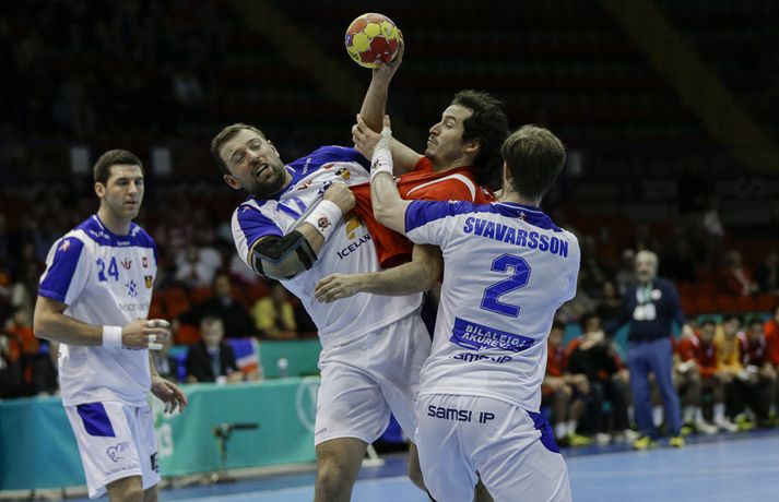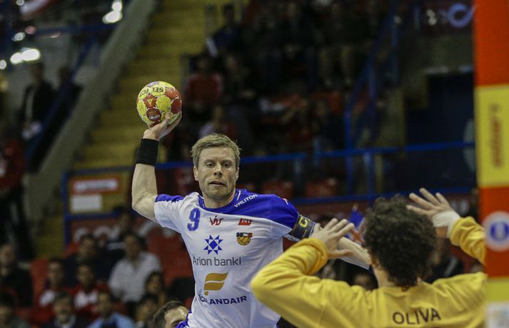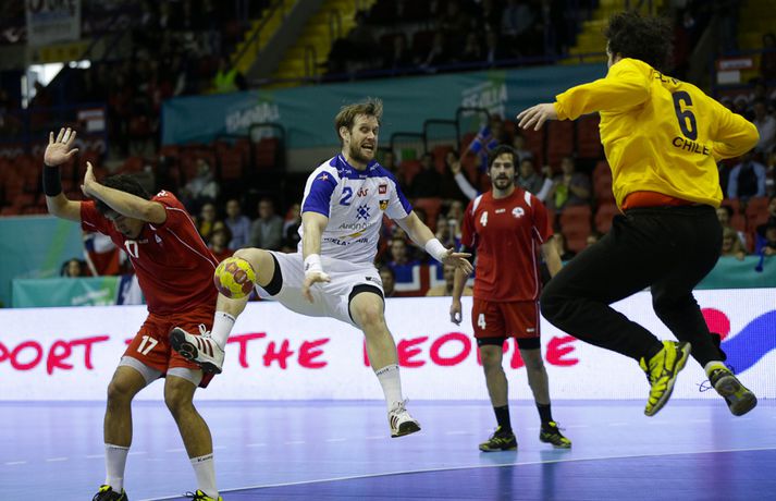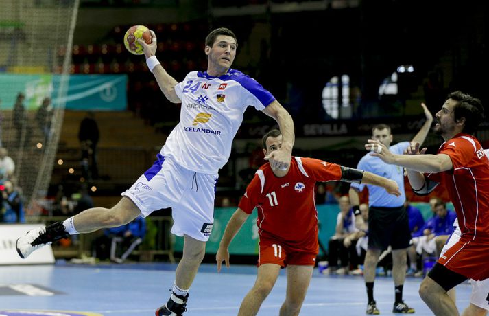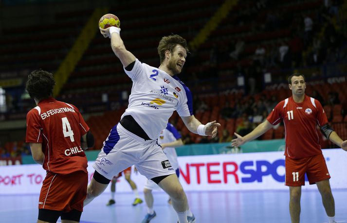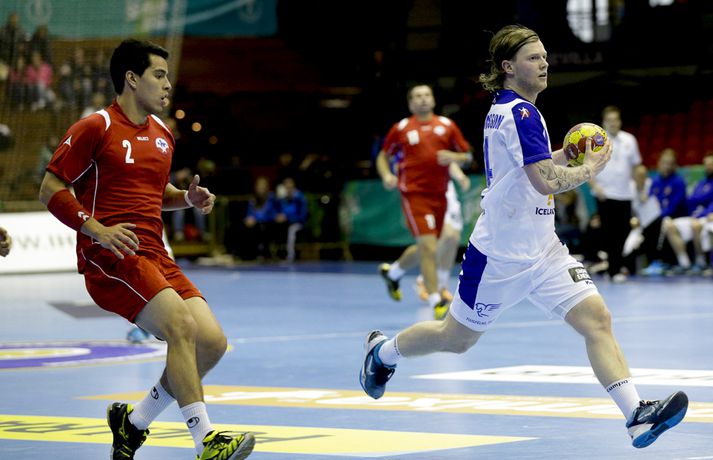 Umfjöllun, viðtöl og myndir: Síle - Ísland 22-38 Sigurður Elvar Þórólfsson í Sevilla skrifar 13. janúar 2013 13:25 Guðjón Valur Sigurðsson skorar hér gegn Síle í Sevilla. Mynd/Vilhelm Íslenska karlalandsliðið í handbolta landaði öruggum 38-22 sigri gegn liði Síle í B-riðli heimsmeistaramótsins sem fram fer á Spáni. Það tók íslenska liðið um 20 mínútur að hrista Síle af sér og Aron Kristjánsson þjálfari liðsins nýtti tækifærið og lét yngri leikmenn liðsins draga vagninn í síðari hálfleik. Hornamaðurinn Arnór Þór Gunnarsson var markahæstur í liði Íslands með alls 7 mörk en hann var í byrjunarliðinu í stað Þóris Ólafssonar. Eftir tapleikinn gegn Rússum í fyrsta leik mótsins lýsti Aron Kristjánsson eftir meira púðri frá hægri væng liðsins í sóknarleiknum. Arnór Þór og Ásgeir Örn Hallgrímsson tóku hann á orðinu og létu vita af sér frá fyrstu mínútu. Arnór skoraði tvö mörk snemma og kom sér inn í leikinn. Ásgeir Örn Hallgrímsson skoraði sitt fyrsta mark eftir fimm mínútur, og ætlaði sér meira en gegn Rússum. Ásgeir Örn var valinn maður leiksins af dómnefnd í leikslok en hann skoraði alls 4 mörk úr 5 skottilraunum. Björgvin Páll Gústavsson byrjaði í markinu og ætlaði sér stóra hluti eftir að hafa verið settur á bekkinn fyrir leikinn gegn Rússum. Björgvin byrjaði ágætlega, varði vítaskot, en Björgvin varði alls 6 skot á þeim 24 mínútum sem hann lék. Rene Oliva, markvörður Síle, náði að stöðva nokkur skot frá íslenska liðinu – hélt þeim á floti fyrstu 20 mínúturnar þegar staðan var 10-9 fyrir Ísland. Smátt og smátt náði íslenska liðið tökum á leiknum þrátt fyrir að lykilmaður á borð við Aron Pálmarssin hafi skorað sitt fyrsta mark eftir 19 mínútur. Alls skoraði Aron 2 mörk en hann tók aðeins 4 skot. Stefán Rafn Sigurmannsson skipti við Guðjón Val Sigurðsson í vinstra horninu eftir aðeins 15 mínútna leik. Stefán Rafn, sem lék með Haukum fyrr í vetur og er nú leikmaður Rhein Neckar Löwen í Þýskalandi, nýtti tækifærið vel og skoraði hann alls 5 mörk úr alls 7 skotum. Aron Kristjánsson henti yngri leikmönnum liðsins út í „djúpu laugina" og lét þá takast á við verkefni dagsins. Flestir þeirra stóðu undir því kalli og eldri og reyndari leikmenn liðsins fengu kærkomna hvíld. Öllum mörkum var fagnað innilega og mest var fagnað þegar Fannar Friðgeirsson skoraði sitt fyrsta mark á stórmóti á 46. mínútu og kom íslenska liðinu í 27-14. Ekki má gleyma því að varnarleikur Íslands var mjög öflugur í upphafi síðari hálfleiks og í lok þeim fyrri. Aron Rafn Eðvarsson stóð til að mynda í markinu í tæplega 7 mínútur undir lok fyrri hálfleiks án þess að fá á sig skot. Íslenska liðið fékk ekki mark á sig í tæplega 12 mínútur undir lok fyrri háfleiks og í upphafi þess síðari. Staðan í hálfleik var 18-11 Íslendingum í vil og fjörið hélt áfram í þeim síðari. Þar léku ungu leikmennirnir aðalhlutverkið á meðan þeir eldri og reyndari hvíldu sig fyrir komandi átök gegn Makedóníu og Danmörku. Aron Kristjánsson fékk svör við ýmsum spurningum sem hann hafði sett fram fyrir leikinn – og það er ljóst að leikmenn eins og Arnór Þór er tilbúinn í slaginn, sem og Stefán Rafn Sigurmannsson og Ólafur Gústafsson. Ólafur Guðmundsson náði ekki að skora og var hann eini útileikmaðurinn sem komst ekki á blað hjá Íslandi fyrir utan Sverre Jakobsson – en það er ávallt fréttaefni þegar varnartröllið Sverre skorar mark á stórmóti.Mynd / Vilhelm Aron: Gott að komast á blað Aron Kristjánsson, þjálfari íslenska landsliðsins, var vitanlega ánægður með sigur sinna manna á Síle í dag. Ísland vann stórsigur, 38-21, og fékk því sín fyrstu stig í mótinu þar sem að liðið tapaði fyrir Rússum í gær. „Það er léttir að hafa unnið og gott að hafa komist á blað. Þetta var sannfærandi sigur," sagði Aron í viðtali við Arnar Björnsson eftir leikinn. „Það var líka gott að fá menn inn í mótið sem áttu ekki sinn besta dag í gær. Svo var hugsunin líka að nota sem flesta leikmenn," bætti hann við. Ísland náði að síga fram úr á síðustu tíu mínútum fyrri hálfleiks og eftir það var sigurinn aldrei í hættu. „Við vorum nokkuð grimmir í upphafi leiks en eftir að við fórum aftur í 6-0 vörn þá gekk þetta betur og við vorum heilt yfir þéttari." „Björgvin Páll féll svo niður þrátt fyrir að hafa byrjað vel og þá kom Aron Rafn sterkur inn." Hann sagði ósamræmi í dómgæslunni í dag. „Mér fannst við oft fara út af fyrir litlar sakir," sagði hann. „En þetta var fínn leikur og öruggur sigur. Næsti leikur verður erfiður enda Makedónía með sterka og hættulega einstaklinga. Við þurfum að skoða þá vel."Mynd / Vilhelm Ásgeir Örn: Ég var mjög einbeittur í dag Ásgeir Örn Hallgrímsson var valinn besti maður íslenska liðsins af mótshöldurum á Spáni. Ísland vann í dag öruggan sigur á Síle. „Mér fannst ég skulda síðan í gær," sagði Ásgeir Örn sem náði sér ekki á strik í tapleiknum gegn Rússlandi í dag. „Maður var í því í dag að lúðra á markið og var heilt yfir ákveðnari í öllum aðgerðum. Maður var óttalegur ræfill í gær." „Þetta gekk vel heilt yfir og því gengur maður mjög sáttur frá borði í dag." Hann á von á erfiðum leik gegn Makedóníu á þriðjudaginn. „Þeir eru flottir og með gott lið. Hægra skyttan þeirra (Kiril Lazarov) er frábær og þeir eiga það til að vera grófir." „Við þurfum að vera vel undirbúnir fyrir þann leik."Mynd / Vilhelm Arnór Þór: Fékk fiðring í magann Arnór Þór Gunnarsson var markahæstu í íslenska liðinu gegn Síle í dag með sjö mörk. Ísland vann sautján marka 