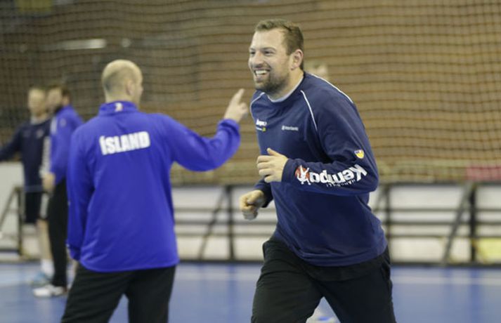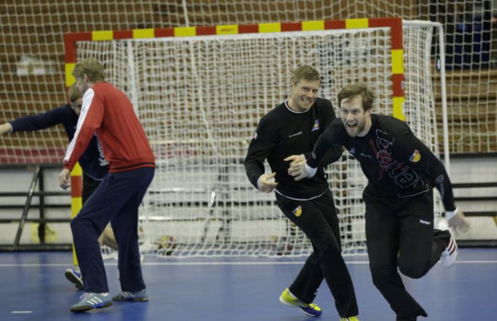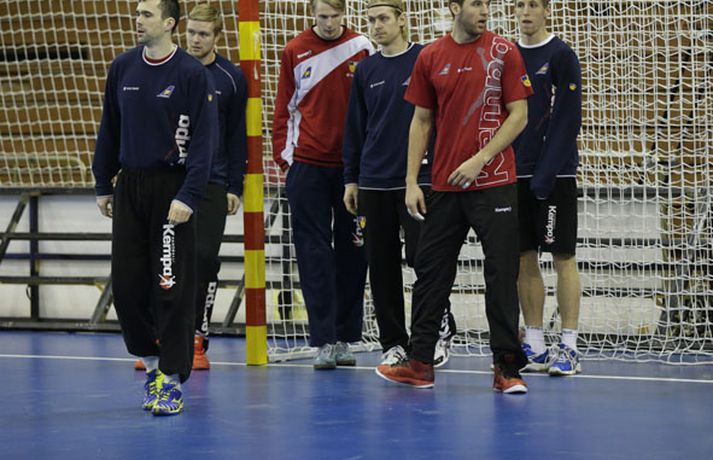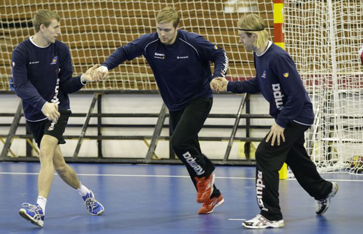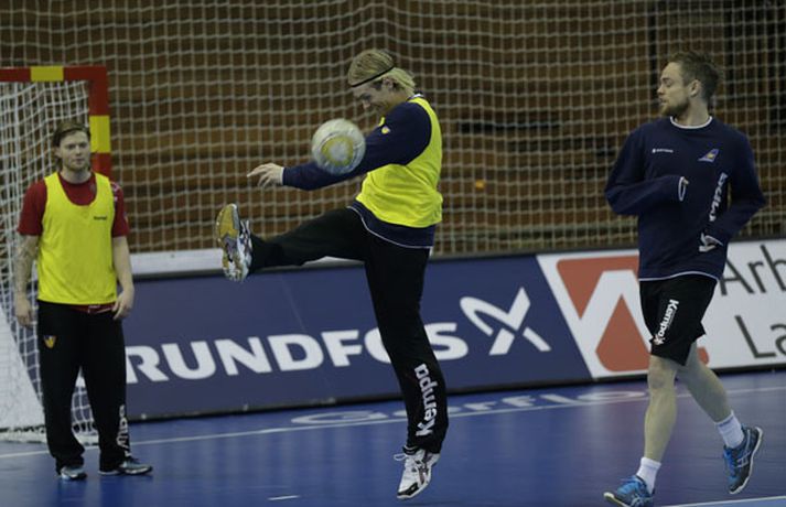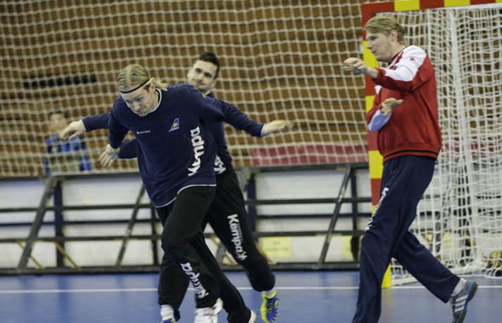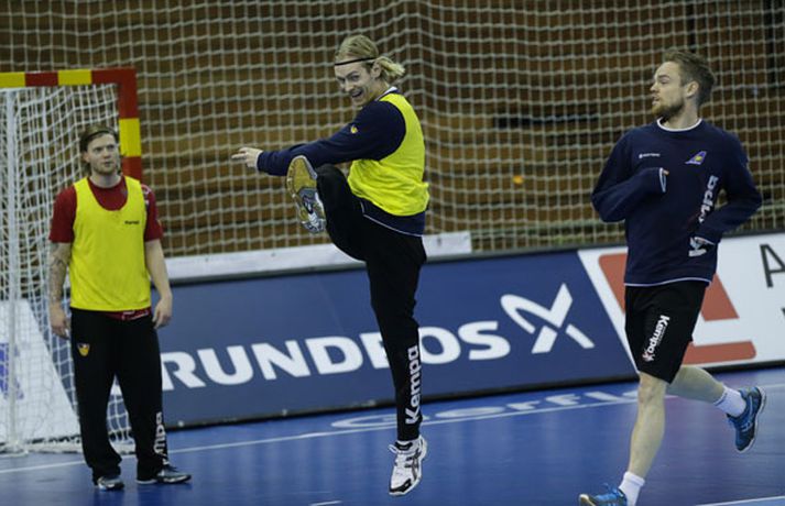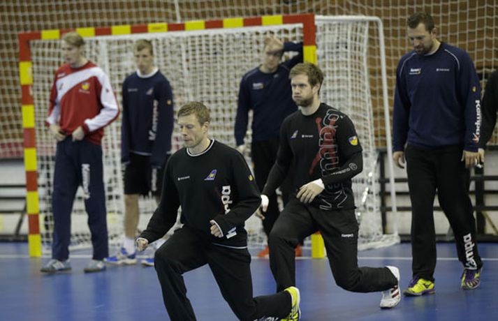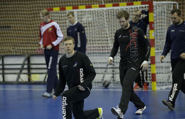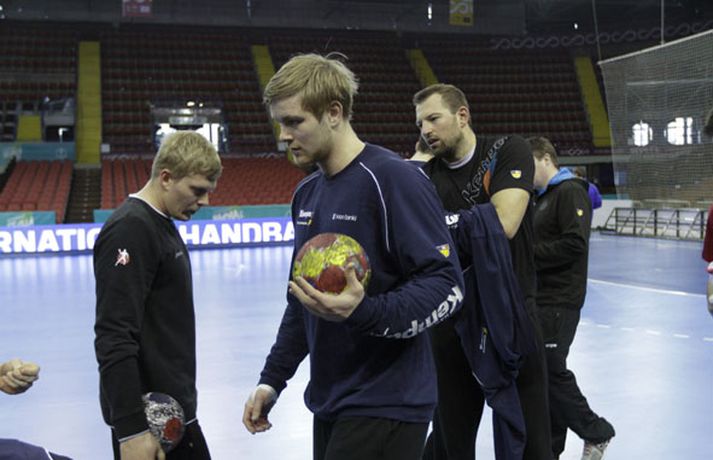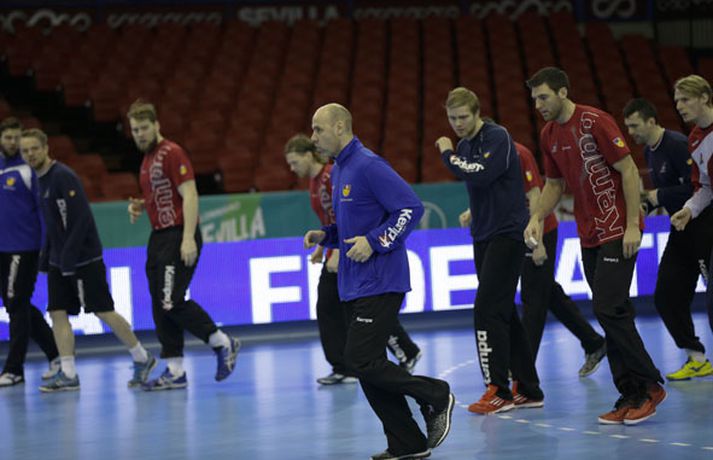 Íslenska landsliðið í handbolta æfði í fyrsta sinn í keppnishöllinni í Sevilla í morgun. Vilhelm Gunnarsson ljósmyndari Fréttablaðsins og Vísis tók þessar myndir af æfingunni. Fyrsti leikur Íslands er á morgun, laugardag, gegn Rússum og hefst hann kl. 17.00 að íslenskum tíma.Guðjón Valur Sigurðsson og Vignir Svavarsson voru einbeittir þegar þeir hituðu upp í kaldri íþróttahöllinni í Sevilla.Vilhelm