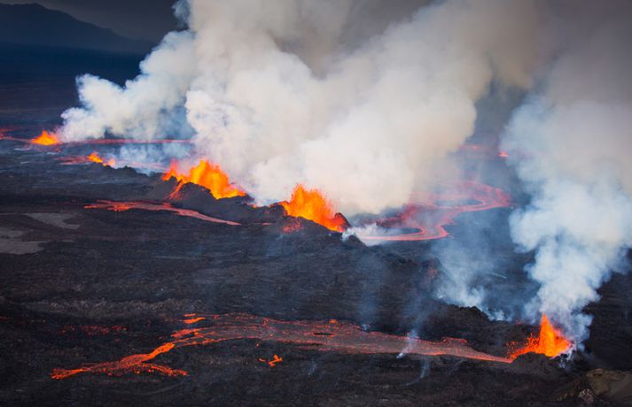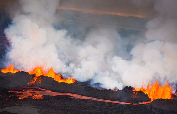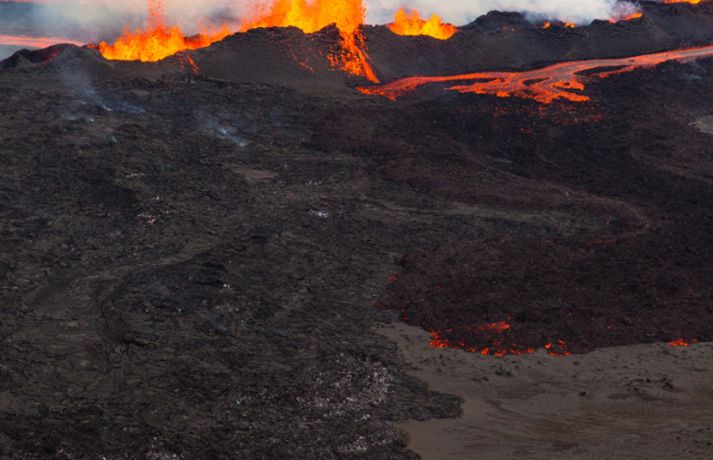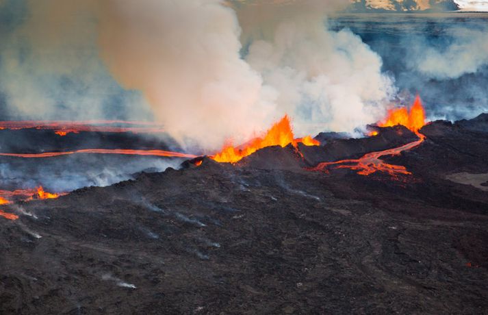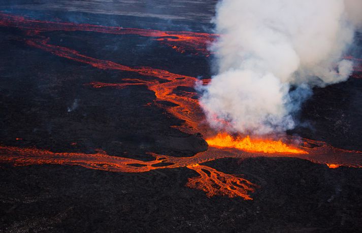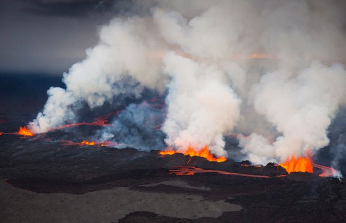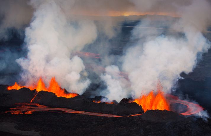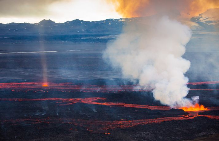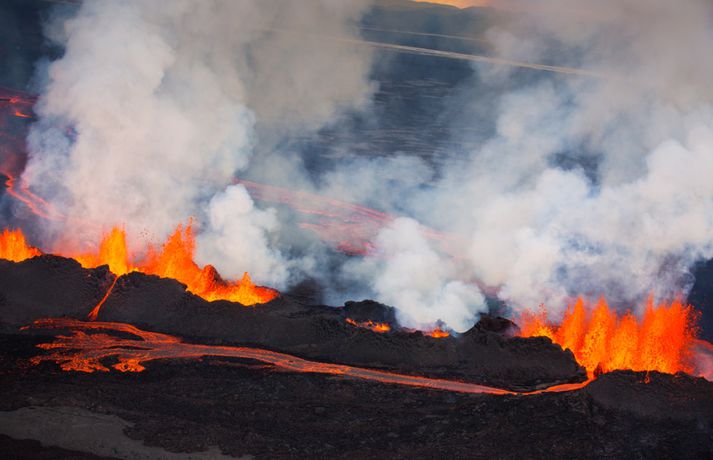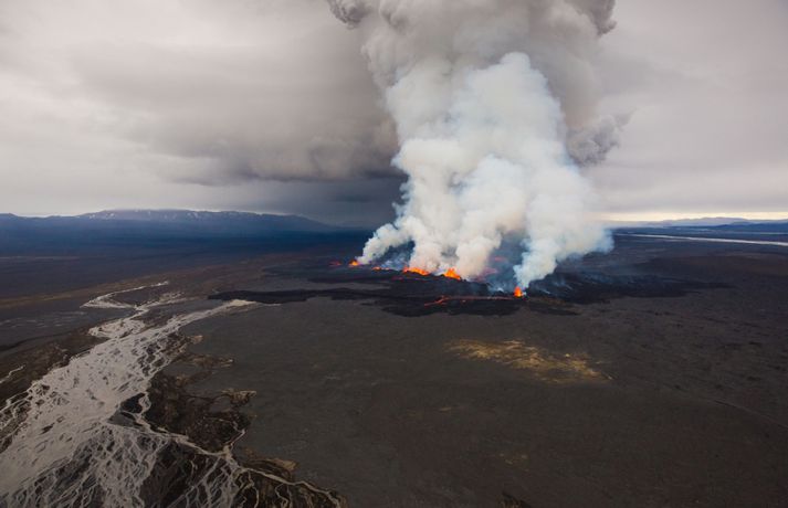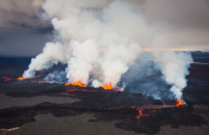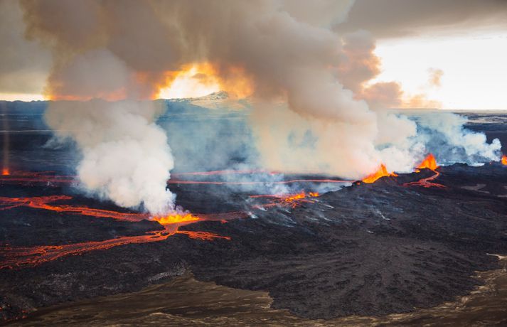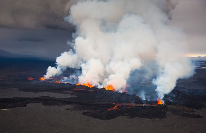 Stórfenglegt eldgos - Myndasyrpa frá Holuhrauni Samúel Karl Ólason skrifar 4. september 2014 07:16 Vísir/Auðunn Eldgosið sem nú stendur yfir í Holuhrauni, norðan við Vatnajökul, hefur nú staðið yfir í rúma fimm sólarhringa. Það hófst aðfararnótt sunnudagsins. Í gærkvöldi hafði hraunið úr eldgosinu þakið 9,1 kílómetra svæði Svæðið er enn lokað fyrir umferð, en ákvörðun um áframhaldandi lokun á svæðinu verður tekin síðar í dag. Sá órói sem mældist við gosstöðvarnar dó út í gærkvöldi og ekki hefur borið á honum aftur. Auðunn Níelsson, ljósmyndari Fréttablaðsins og Vísis, flaug yfir svæðið í gær og tók meðfylgjandi myndir og má með sanni segja að eldgosið sé stórfenglegt. Bárðarbunga Tengdar fréttir Ferðaþjónustuaðilar skipuleggja ferðir á gosstöðvar Lokanir vega vegna eldgoss norðan Vatnajökuls hafa kostað ferðaþjónustufyrirtæki allt að tvær milljónir á dag. Mesta tjónið af lokun Dettifossvegar að vestan. Byrjað er að skipuleggja ferðir að gosstöðvum í Holuhrauni. 2. september 2014 08:15 Hætta á gosi undir jökli minnkar ekki Þeirri atburðarás fylgir bráð flóðahætta á flæðum framan við Dyngjujökul. 3. september 2014 12:40 Hraunið um níu ferkílómetrar að stærð Magnús Tumi Guðmundsson segir ekkert draga úr eldgosinu í Holuhrauni. 3. september 2014 19:38 Lokað fyrir alla umferð inn að gosstöðvunum Ákvörðunin er tekin í ljósi aukins óróa á gosstöðvunum í dag. 3. september 2014 20:47 Atburðarásin í Bárðarbungu frá A til Ö Þróun jarðhræringanna við Bárðarbungu undanfarnar tvær vikur leiða af sér ótal spurningar og tilgátur um hvað sé í raun að gerast. 2. september 2014 11:06 Dregur úr óróa á gosstað Stærsti skjálfti næturinnar mældist 4,8 stig að stærð og reið hann yfir rétt fyrir klukkan fjögur nyrst í Bárðarbunguöskju. 4. september 2014 06:52 Mest lesið Veðurvaktin: Snjókoman rétt að byrja og víða erfið færð Veður Ungur Miðflokksmaður gengst við rasisma og segir af sér Innlent Snjókoman rétt að byrja Innlent Flugmaðurinn sem fórst millilenti oft í Reykjavík Innlent Eldur í blokk við Ljósheima Innlent Bílar út af veginum á Reykjanesbraut Innlent Ráðgjafinn ráðinn í tímabundið starf eftir dýra skreppitúra Innlent Hvatt til varúðar vegna snjóflóðahættu á suðvesturhorninu Innlent Skvísur geti virkað sem hálfgerðir þroskaþjófar Innlent Fjölmargir farþegar fastir í flugvélum á Keflavíkurflugvelli Innlent Fleiri fréttir Kærðu umdeildar framkvæmdir allt of seint Skellt í lás í sundlaugum borgarinnar vegna veðurs Reglur brotnar og þjónusta sem bjóða ætti út Þarf að borga bætur þrátt fyrir breytingar á hlaupahjólinu Hvatt til varúðar vegna snjóflóðahættu á suðvesturhorninu Meiri kvika en í síðasta gosi Eldur í blokk við Ljósheima Flugmaðurinn sem fórst millilenti oft í Reykjavík Halla leiðir krabbameinsráð ráðherra Snjókomumet og umferðaröngþveiti Segir sameiginlegum gildum Norðurlanda ógnað Fjölmargir farþegar fastir í flugvélum á Keflavíkurflugvelli Ungur Miðflokksmaður gengst við rasisma og segir af sér Sturlað ástand og United vettlingar prjónaðir í bílnum Mesta snjódýpt í Reykjavík sem mælst hefur í október Viðbragðsaðilar í mikilli hættu vegna bíla á sumardekkjum Bílar út af veginum á Reykjanesbraut Vill heimila Samkeppniseftirlitinu að ráðast í húsleitir Snjókoman rétt að byrja Píratar berjist gegn „rísandi bylgju lýðskrums og fasisma“ Skvísur geti virkað sem hálfgerðir þroskaþjófar Ráðgjafinn ráðinn í tímabundið starf eftir dýra skreppitúra Misvægi atkvæða bitnar mest á Kraganum Heitavatnslaust á Suðurnesjum og rafmagnslaust víða um land Skreppiferðir í Jysk meðal þess sem ráðgjafi rukkaði fyrir „Ég tel ekki tilefni til að íhuga stöðu mína“ Áhyggjur af lánaframboði og ógnarlangar biðraðir Vara við ferðum á Fagradalsfjall þar sem aðstæður geti orðið hættulegar Kristmundur verður lögreglustjóri á Austurlandi „Vonandi klárast þetta á morgun“ Sjá meira