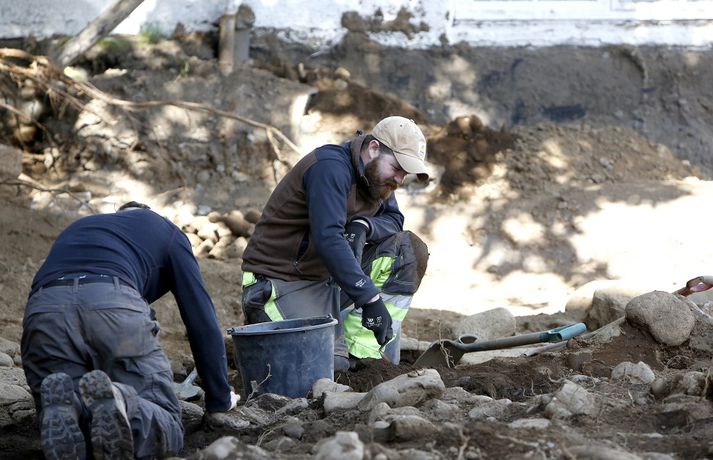 Fornleifagröftur við hornið á Lækjargötu og Vonarstræti, sem hófst í maí síðastliðnum vegna fyrirhugaðrar hótelbyggingar, hefur leitt í ljós það sem virðist vera skálabygging frá tímum landnáms. Lísabet Guðmundsdóttir fornleifafræðingur, sem stýrir uppgreftrinum, segir þennan fund breyta miklu um það sem við töldum okkur vita um byggðasögu Reykjavíkur. „Við höfum náttúrulega vitað um þessa elstu byggð í Reykjavík þar sem Aðalstrætið er,“ segir Lísabet, en þær bæjarrústir komu í ljós við uppgröft á áttunda áratugnum. „Við töldum okkur vita að aðalbyggðakjarninn hafi verið á því svæði, en okkur bara datt ekki í hug að það væri eitthvað þarna við Lækjargötuna. Og það var eiginlega það sem var svolítið skemmtilegt.“Áfram var grafið í sólinni í dag.Vísir/Andri MarinóUppgröfturinn átti upphaflega að taka um fjórar vikur en sú áætlun breyttist skiljanlega þegar skálinn fannst í síðasta mánuði. Fyrir var vitað að bærinn Lækjarkot, sem byggður var árið 1799, hafði staðið á lóðinni, sem og timburhús sem reist var árið 1887. „Þegar við vorum búin að klára að grafa þær byggingar upp, þá var náttúrulega slatti eftir,“ segir Lísabet. „Það var með svona ofsalega flottu landnámstorfi í veggjum, þannig að það virtist vera frekar gamalt. Við erum náttúrulega ekki komin með aldurinn á hreint ennþá,en það kemur bara þegar við förum í úrvinnsluna.“ Lísabet segist búast við því að uppgröfturinn muni standa yfir í um tvær til þrjár vikur til viðbótar. Hún telur ekki líkur á að áform um hótelbyggingu raskist nokkuð vegna fundarins en segir viðræður þegar hafnar við framkvæmdaraðila um varðveislu grjóts, hellna og varðeldar úr skálanum. „Þeir vilja nýta þessar minjar og gera þeim skil, sem er bara mjög gott,“ segir Lísabet. „Þetta verður ekki varðveitt á staðnum eins og við Aðalstræti en það verður eitthvað þarna sem vísar í minjarnar á þessum stað. Sem mér finnst mjög mikilvægt.“Ferðamenn virða framkvæmdirnar fyrir sér.Vísir/Andri MarinóVísir/Andri MarinóVísir/Andri MarinóVísir/Andri MarinóVísir/Andri MarinóVísir/Andri MarinóVísir/Andri Marinó