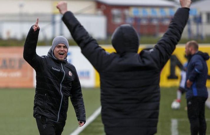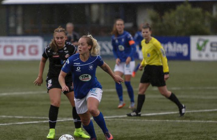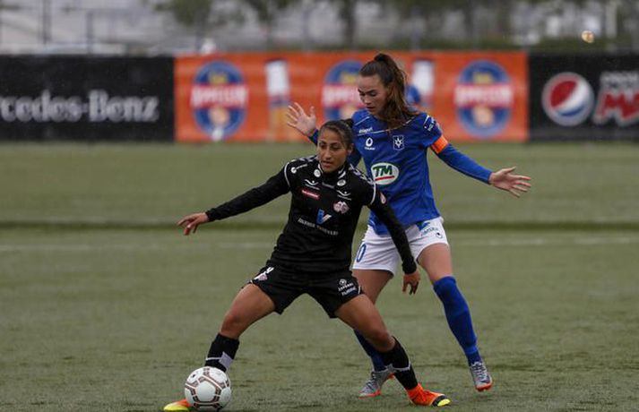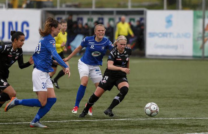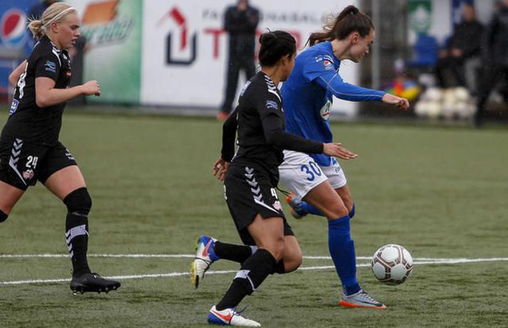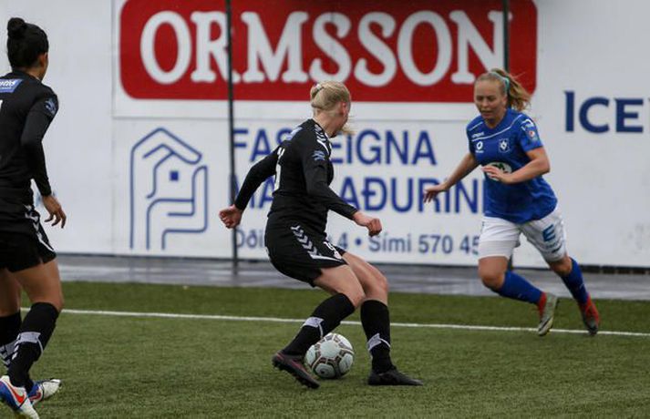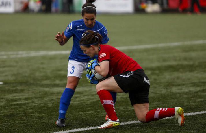 Stjarnan spilar til undanúrslita í Borgunarbikar kvenna eftir frábæran 3-2 sigur á Þór/KA á heimavelli. Ernir Eyjólfsson, ljósmyndari Fréttablaðsins og Vísis, var á Samsung-vellinum í kvöld og tók myndirnar hér að neðan. Leikurinn fór kröftuglega af stað og náðu heimakonurnar forystu strax á þriðju mínútu þegar Kristrún Kristjánsdóttir gerði sér lítið fyrir og skoraði beint úr aukaspyrnu. Gestirnir að norðan voru þó ekki lengi að svara fyrir sig og skoraði „bæjarstjórinn“ títtnefndi, Sandra Mayor, beint úr aukaspyrnu á tíundu mínútu. Það var mikið fjör í fyrri hálfleik, bæði lið sóttu mikið og var baráttan mikil. Þór/KA náði að fara með forystu í hálfleik eftir að Sandra María Jessen skoraði stöngin – inn á 29. mínútu hálfleiksins. Stjörnukonur hefðu auðveldlega getað jafnað nokkrum sinnum áður en flautað var til leikhlés, en Bryndís Lára Hrafnkelsdóttir reyndist þeim erfiður andstæðingur í marki Þórs/KA. Seinni hálfleikur byrjaði eins og sá fyrri endaði, mikill kraftur og sókn hjá heimakonum í Stjörnunni. Þær uppskáru á 50. mínútu þegar Agla María Albertsdóttir kom boltanum í netið og jafnaði leikinn. Það dofnaði aðeins yfir leiknum þegar leið á, enda fór mikil orka í fyrri hálfleikinn og mikið leikjaálag verið á leikmönnum beggja liða. Stjarnan var þó alltaf aðeins líklegri og ógnuðu Bryndísi Láru nokkrum sinnum. Það stefndi allt í framlengingu í Garðabænum þegar hver önnur en markadrottningin Harpa Þorsteinsdóttir tryggði heimakonum farseðilinn í undanúrslit með marki á 85. mínútu. Sigur Stjörnunnar var verðskuldaður, en þær fengu hörkuleik frá gestunum að norðan, fyrsti tapleikur Þórs/KA í sumar staðreynd. Allt lið Stjörnunnar spilaði mjög vel í dag, Lára Kristín Pedersen var mjög sterk í vörninni sem og Ana Victoria Cate. Guðmunda Brynja Óladóttir var mjög dugleg fram á við ásamt Öglu Maríu Albertsdóttur og lét Katrín Ásbjörnsdóttir finna vel fyrir sér. Það sást á Hörpu Þorsteinsdóttur að hún er ekki komin í sitt allra besta form, en hún stóð sig þó vel í dag og var oft á tíðum ógnandi í fremstu línu hjá Garðbæingum. Hjá Þór/KA var Bryndís Lára besti maður vallarins. Hún átti fjölmargar glæsilegar vörslur í marki gestanna og má segja að henni sé að þakka fyrir að sigur Stjörnunnar hafi ekki verið stærri. Sandra Mayor átti ágætan leik, jafnt og Andrea Mist Pálsdóttir. Sandra María Jessen var dugleg í fyrri hálfleik en sást ekki mikið í þeim síðari. Þór/KA-liðið í heildina var hálf kraftlaust þegar líða tók á leikinn og mættu þær inn í leikinn eftir hlé eins og þær ætluðu að reyna að halda fengnum hlut. Þór/KA geta nú einbeitt sér að því að sigla Íslandsmeistaratitlinum heim í deildinni, á meðan Stjörnunnar bíður undanúrslitaviðureign sem fer fram í ágúst. Ólafur Þór: Sundurspiluðum þær og hefðu átt að setja fleiri mörk Ólafur Þór Guðbjörnsson, þjálfari Stjörnunnar, var að vonum sáttur eftir leikinn. „Við settum kraft í þetta. Okkur fannst við ekki hafa verið að sýna þann kraft sem við eigum inni undanfarna leiki og við komum vel stemmdar í dag. Frábær leikur hjá okkur“ sagði Ólafur. Miðað við hvernig Stjörnuliðið var að spila þá fór ekkert illa um hann á hliðarlínunni. Hans konur óðu í dauðafærum og hefðu átt að skora fleiri mörk í fyrri hálfleik þar sem þær sundurspiluðu gestina. „Harkan byrjaði á fyrstu mínútu þegar hún henti einum leikmanni hérna í jörðina og fær eitthvað vægt tiltal“ svarar Óli, aðspurður hvað honum hafi fundist um hörkuna í leiknum. „Þær fengu tiltal langt fram eftir leik, mér fannst hún taka allt of lint á því, en að öðru leiti fékk leikurinn að fljóta vel“. Donni fagnar.vísir/ernirDonni: Það að markmaðurinn væri besti leikmaðurinn á vellinum sagði sitt „Stjörnuliðið var betra í dag og átti sigurinn skilið“ sagði Halldór Jón Sigurðsson, þjálfari Þórs/KA. „Virkilega svekkjandi samt þar sem við vorum í góðri stöðu í hálfleik, svekkjandi að missa þetta niður svona snemma í seinni hálfleik“ bætir hann við. Halldór segir liðið ekki hafa lagt upp með það í hálfleik að halda fengnum hlut, þó þær hafi verið í góðri stöðu þá hafi ekki verið nein ástæða til að pakka saman í vörn. Hann hefur litlar áhyggjur af því að þessi tapleikur hafi áhrif á gengi Þórs/KA í deildinni. „Þetta eru tvær keppnir, nú er ein keppni dottin út og þá er bara að einbeita sér að hinni“ Agla María Albertsdóttir var á skotskónum.Vísir/Ernirvísir/ernir
