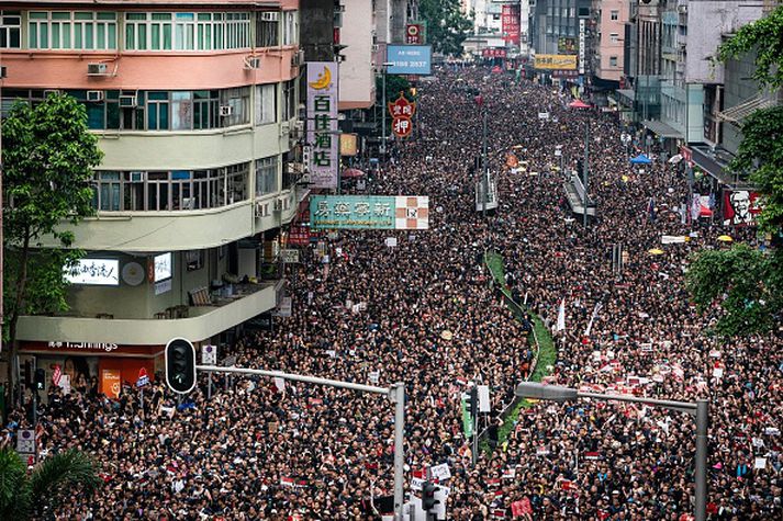Þúsundir manna mótmæla enn í Hong Kong vegna umdeildra laga um framsalsheimildir, sem heimila framsal fólks frá Hong Kong til kínverskra yfirvalda á meginlandinu. Mótmælin standa enn yfir þrátt fyrir að stjórnvöld í Hong Kong hafi ákveðið í gær að fresta innleiðingu laganna. Mótmælendur sætta sig aftur á móti ekki við frestun heldur vilja að frumvarpið verði látið niður falla. Einhverjir krefjast þess að æðsti embættismaður sjálfstjórnarhéraðsins, Carrie Lam, segi af sér en hún hefur verið stuðningsmaður frumvarpsins.Sjá einnig: Risa mótmæli í Hong Kong vegna nýs lagafrumvarps Talið er að tugir þúsunda hafi mótmælt frumvarpinu en mótmælendur voru svartklæddir þegar þeir gengu um götur Hong Kong. Mótmælin eru þau stærstu og jafnframt þau hörðustu í áratugi en talið er að svo mikill fjöldi mótmælenda hafi ekki komið saman frá árinu 1989 þegar íbúar Hong Kong mótmæltu meðferðinni á kínverskum mótmælendum í blóðbaðinu á Tiananmen torgi.Ms Ng and Mr Chu have joined the protests at Victoria Park - say it's the first time protesting against the extradition proposals. Say they were angered by police use of force. Wearing white flowers to commemorate yesterday's protester who fell to his death. pic.twitter.com/BgJ2Nn3PJz — Helier Cheung (@HelierCheung) June 16, 2019 Þátttakendur í mótmælunum mættu margir hverjir með hvít blóm á meðan aðrir veifuðu borðum þar sem mátti lesa: „Ekki skjóta, við erum íbúar Hong Kong“, en lögregla hafði áður beitt táragasi og gúmmískotum á mótmælendur. Hiti fór víða upp í þrjátíu gráður á meðan mótmælunum stóð og áttu margir mótmælendur erfitt með hitann. Mátti sjá fólk falla í yfirlið á götum Hong Kong og voru sjálfboðaliðar á vettvangi til þess að veita aðstoð og dreifa vatnsflöskum til þeirra. Mótmælin hafa vakið athygli víða um heim en á miðvikudag brutust út óeirðir og voru yfir sjötíu manns lögð á spítala í kjölfarið. Þá neyddust verslanir og bankar á svæðinu til þess að loka útibúum sínum á meðan þeim stóð.Vísir/GettyVísir/Getty