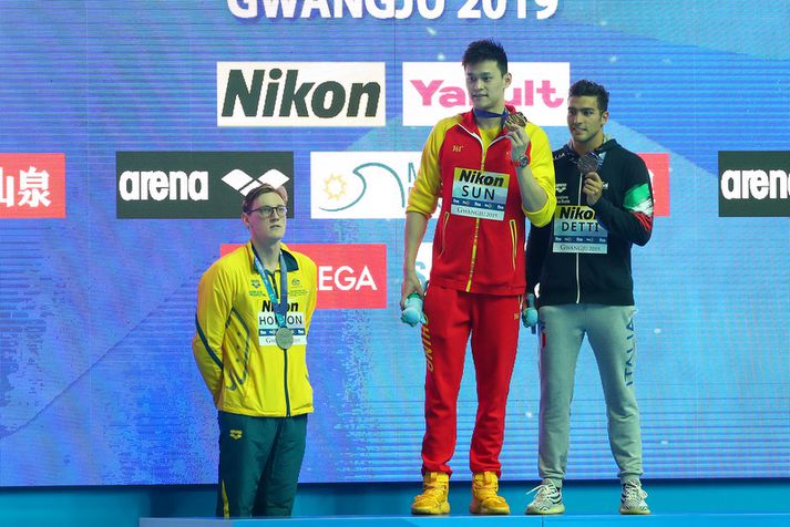 Ástralski sundkappinn Mack Horton vann silfurverðlaun á HM í sundi í Gwangju í Suður-Kóreu en steig samt aldrei upp á verðlaunapallinn. Kínverjinn Sun Yang tryggði sér heimsmeistaratitilinn í 400 metra skriðsundi og var að vinna þessa grein á fjórða heimsmeistaramótinu í röð. Hann vann einnig gullið 2013, 2015 og 2017. Það eru aftur á móti ekki allir sáttir með að Sun Yang sé að keppa. Einn af þeim er Mack Horton sem varð annar í þessu sundi og Horton þurfti einnig að sætta sig við annað sætið á heimsmeistaramótinu í Búdapest fyrir tveimur árum.Australian swimmer Mack Horton refused to share the podium with Chinese rival Sun Yang, years after accusing him of being a "drug cheat" Watch: https://t.co/vTZSLVykJGpic.twitter.com/FyZ4h5r8HR — BBC Sport (@BBCSport) July 23, 2019Sun Yang hefur verið ásakaður um að brjóta reglur í tengslum við lyfjapróf og Mack Horton kallar hann svindlara. Þegar kom að verðlaunaafhendingunni þá steig Mack Horton aldrei upp á pallinn því hann vildi ekki deila verðlaunapallinum með „svindlara“. Mack Horton neitaði líka að láta taka mynd af sér með Sun Yang eins og venja er. Hann brosti hins vegar út að eyrum á mynd með Gabriele Detti frá Ítalíu sem fékk bronsið. Sun var dæmdur í þriggja mánaða bann árið 2014 eftir að örvandi efnið trimetazidine fannst í sýni hans. Sun hélt því fram að hann hafi notað efnið vegna hjartavandamála. Deilur þeirra hófust fyrir alvöru á Ólympíuleikunum í Ríó árið 2016 þar sem Horton sakaði Sun um að skvetta á sig í æfingalauginni. „Ég lét sem hann væri ekki þarna. Ég hef ekki tíma eða virðingu fyrir þeim sem taka ólögleg lyf,“ sagði Mack Horton þá og bætti við: „Ég sætti mig ekki við það að þegar íþróttamenn, sem hafa fallið á lyfjaprófi, fá enn að keppa,“ sagði Horton. Horton vann Ólympíugullið í Ríó en annars hefur Sun verið með talsverða yfirburði í þessari grein. Sun Yang er aftur kominn í vandræði vegna lyfjamála þótt að hann haldi enn fram sakleysi sínu. Hann hefur verið sakaður um að eyðileggja sýni til að sleppa við lyfjapróf og eins neita að fara í lyfjapróf af því að hann efaðist um réttindi þess sem var kominn til að taka prófið. Allt ýtir þetta undir gagnrýni Mack Horton og það eru sumir sem hrósa honum fyrir mótmæli sín. Mörgum finnst hann þó sjálfur sína mikla óvirðingu með þessu því það dreymir marga sundmenn um að komast á verðlaunapall á heimsmeistaramóti.