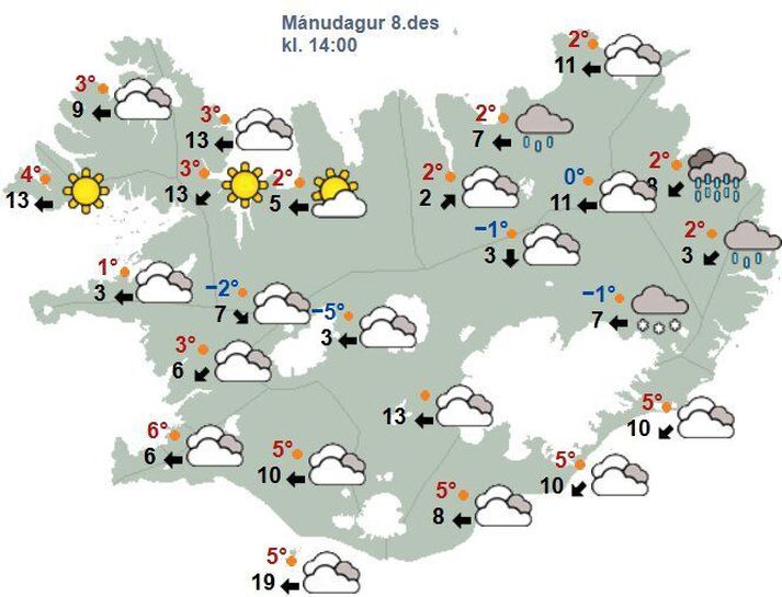 Hvassviðri syðst á landinu Atli Ísleifsson skrifar 8. desember 2025 07:31 Hiti verður á bilinu núll til átta stig, mildast við suðurströndina. Vísir/Vilhelm Hæðin yfir Grænlandi heldur velli eins og undanfarna daga og lægðir langt suður í hafi halda fremur mildri austan- og norðaustanátt að landinu. Á vef Veðurstofunnar segir að það verði strekkings vindur norðvestantil og hvassviðri syðst á landinu, en hægari annars staðar. Rigning eða slydda, einkum á Austfjörðum en þurrt og allvíða bjartviðri vestanlands. Hiti verður á bilinu núll til átta stig, mildast við suðurströndina. „Svipaður vindur á morgun, en líkur á að úrkoma verði heldur meiri og má reikna með einhverjum dropum á vesturhelmingi landsins en úrkomusamast verður við austurströndina. Hitastigið verður á svipuðum nótum áfram, þar sem vindur stendur af landi, eins og sunnan- og vestantil má reikna með að hiti verði 4 til 8 stig nokkuð víða, á meðan áveðurs verður hitastigið 1 til 5 stig,“ segir í hugleiðingum veðurfræðings. Spákort fyrir klukkan 14. Veðurhorfur á landinu næstu daga Á þriðjudag: Austan og norðaustan 8-15 m/s, en 13-20 syðst. Rigning eða slydda með köflum, einkum austanlands. Hiti 1 til 8 stig. Á miðvikudag: Norðaustan 10-15 og él, en þurrt á Suður- og Vesturlandi.Hiti 2 til 6 stig, en nærri frostmarki norðaustantil. Á fimmtudag: Norðaustanátt og dálítil él norðan- og austanlands, en rigning eða slydda við suðurströndina. Hiti breytist lítið. Á föstudag: Norðaustanátt og fremur úrkomusamt, einkum um landið norðan- og austanvert. Hiti svipaður áfram. Á laugardag: Austlæg átt og víða þurrt. Hiti nálægt frostmarki. Á sunnudag: Austanátt og úrkoma í flestum landshlutum. Heldur hlýrra. Veður Mest lesið Lífið gjörbreytt Innlent Króuðu stolinn bíl af í Kömbunum eftir eftirför þvert yfir Hellisheiði Innlent Fundu spjótsodda alsetta gulli mörghundruð árum eldri en talið var mögulegt Erlent Trump hundfúll að fá ekki greiða gegn greiða Erlent Grindvíkingar hugsa um að fara heim: Gott að vera í Grindavík en verður aldrei eins Innlent Hjólreiðamaður fluttur „mikið slasaður“ með sjúkraflugi Innlent Segir Rússa viljuga en Selenskí ekki Erlent Alvarlegt slys á Suðurlandsbraut Innlent Meiri ógn af smábátum í Karíbahafinu en Rússlandi Erlent Herflugvél snúið við í neyð Innlent Fleiri fréttir Hvassviðri syðst á landinu Smá rigning eða slydda víða Hiti gæti náð upp undir 10 gráður Rigning eða slydda sunnan- og vestanlands Bjart sunnan- og vestanlands en él norðan- og austantil Allhvasst syðst en hægari vindur annars staðar Bjartviðri suðvestantil en hvasst suðaustanlands Blæs hressilega af austri Stormur í kortunum Snjódýptin geti náð fjörutíu sentimetrum Gul viðvörun vegna snjókomu Snjókoma í kortunum Kuldinn bítur í kinnar landsmanna Slær í storm suðaustantil en höfuðborgarsvæðið í skjóli Allvíða él eða skúrir og flughált víða um land Hlýnar í veðri og gæti orðið flughált Vara við flughálku í fyrramálið Skúrir á víð og dreif og hiti að sex stigum Hefðbundin lægð með rigningu og allhvössum vindi Hvít jörð á höfuðborgarsvæðinu og víðar Frost og víða fallegt vetrarveður Víða vindasamt á landinu Töluvert bjartviðri í dag en sums staðar þokuloft Skýjað og dálítil él Skýjað og útkomulítið vestantil og þurrt fyrir austan Dálítil rigning eða slydda en lengst af þurrt sunnantil Víðast bjart veður en hvasst austast á landinu Gul viðvörun á Austfjörðum Norðaustanátt og strekkingur nokkuð víða Víða lítilsháttar rigning eða snjókoma Sjá meira