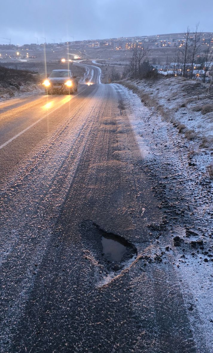 Aron Þór Hermansson, umsjónarmaður fasteigna, segir frá því í samtali við Vísi að fjórir ökumenn, þar á meðal hann sjálfur, hafi ekið í stóra holu er þeir keyrðu Elliðavatnsveg í Hafnarfirði í morgun, nánar tiltekið nálægt leikskólanum Hlíðarenda. „Það voru fjórir bílar þarna í röð sem lentu allir í [holunni],“ segir Aron í samtali við Vísi. Atvikið hafi átt sér stað í myrkri og við lélega lýsingu, þar sem engir ljósastaurar væru á svæðinu. Og allir ökumenn virðast hafa lent í sama tjóni og Aron, hvort sem um væri að ræða Land Rover eða Volkswagen Golf. „Þetta er jafnvel sama dekkið sem skemmist, framdekkið bílstjóramegin,“ segir hann og tekur fram að hann hafi sjálfur hafa verið á um 30 til 40 km/klst hraða en að 50 km/klst hámarkshraði sé á veginum. Dráttarbílar voru kallaðir til að fjarlægja bílana og sjálfur þruft Aron að punga út 70 þúsund krónum vegna tjónsins, segir hann. Auk þess hafi felgan skemmst og Aron grunar að bíllinn sé einnig orðinn hjólaskakkur. Vanræktur vegur Eftir atvikið hafi aðeins versta holan verið fyllt, en aðrar slæmar holur í nágrenninu hafi verið skildar eftir ósnertar. „Þetta sýnir hvað er verið að vanrækja þennan veg. Þeir rétt svo fylla upp í það alversta. Þetta er orðið hættulegt. Þessi vegur er gerður fyrir fimmtíu kílómetra hraða,“ segir Aron. Fleiri holur eru víða í veginum.Aðsend Ökumaðurinn bendir á að Elliðavatnsvegur sé mikið notaður, sérstaklega af íbúum í Hafnarfirði, en að ástand hans sé skelfilegt og handónýtt. Þá bendir Aron á að bæjaryfirvöld í Garðabæ hyggist tengja nýtt hverfi í Urriðaholti við veginn og setja upp hringtorg, sem mun væntanlega auka álag á veginn. Hafnarfjarðarbær ábyrgist þennan kafla vegarins en Aron segir að Vegagerðin beri ábyrgð á restinni af veginum og að viðhaldi hafi almennt verið ábótavant. Hann hafi nú sjálfur haft samband við Garðabæ, Hafnarfjarðarbæ og Vegagerðina til að leita svara en auk þess undirbýr hann nú bótakröfu á hendur annaðhvort Hafnarfjarðarbæ eða Vegagerðinni enda hafi hann og fleiri þurft að greiða fyrir tjónið sem varð á bílunum.